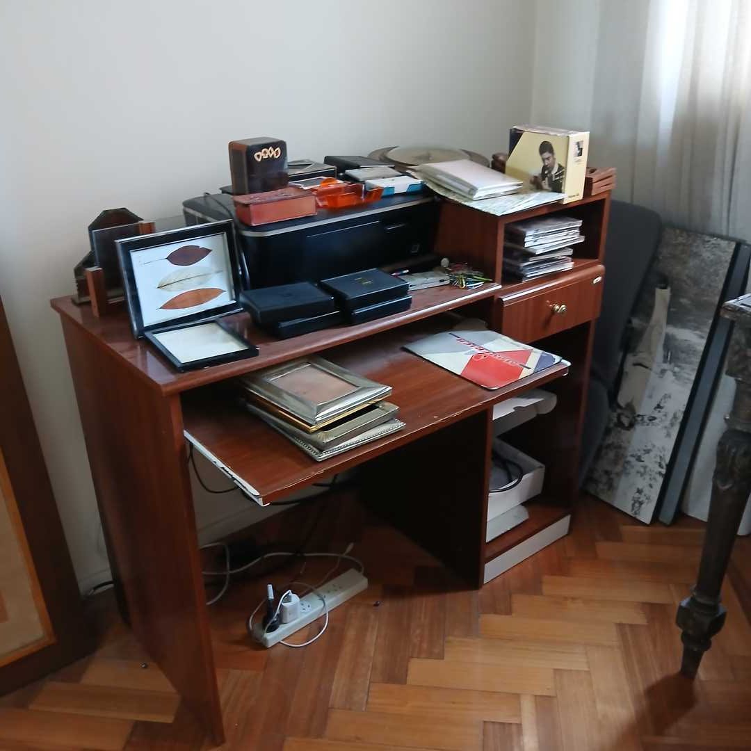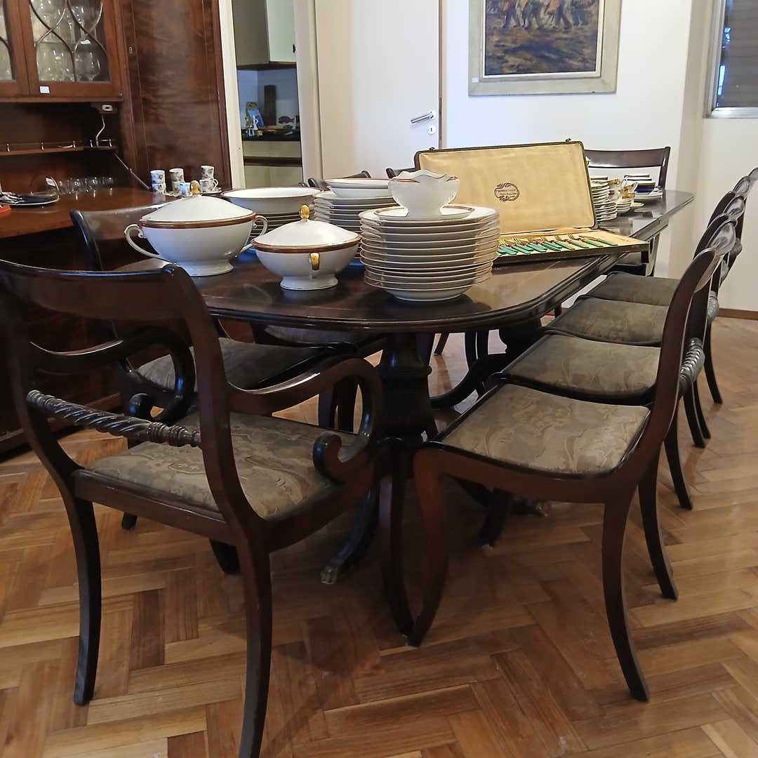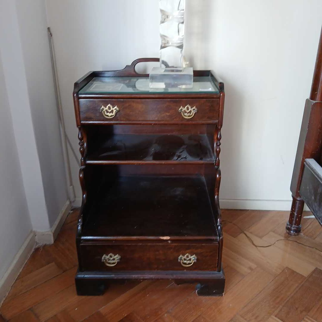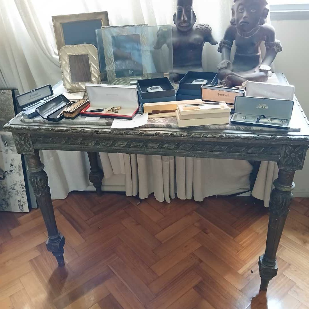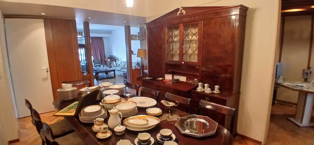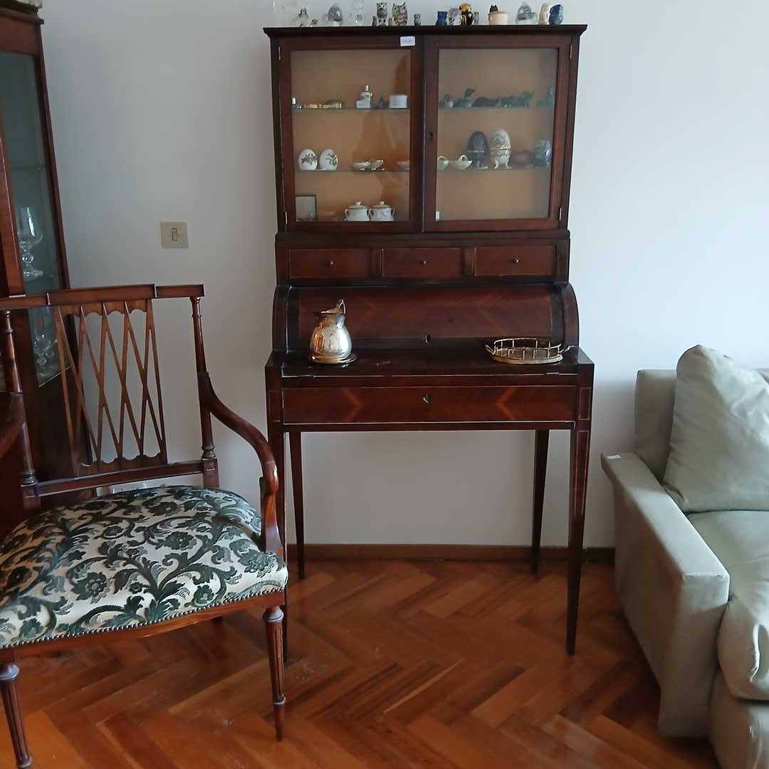 Diván tapizado; par silloncitos estilo Francés; par sillas de dormitorio; mesas auxiliares: de sala estilo Francés, de diseño en bronce y vítrea, estilo Inglés 4 gajos, carro patas torneadas, par enchapadas en raíz; consola estilo Inglés; vitrina estilo Francés; comedor estilo Inglés: mesa, sillas y par silloncitos; vajillero estilo Inglés; biblioteca pequeña; escritorio con alzada estilo Francés; revistero en madera calada; cómoda estilo Francés bombé; cama con colchón; par mesas de luz y tapa mármol, otras-Adornos y vajilla: servicio de mesa Bavaria; 5 tríos de te en porcelana azul cobalto; juego café en porcelana oriental; taza de te de porcelana; servicio de mesa en porcelana Checoslovaca; servicio de te porcelana Hartford; tazas de te y café; porcelana «Patos»; cristalería, lote copas con dibujo en dorado, vasos y copas, botellones; cubiertos de lunch en su estuche; platos de sitio acero; colección de búhos; elefante en jade; bola de la paciencia en marfil; espejos marcos dorados; cuadros firmados: óleos «El Baile» De La Fuente, «Niña» Schurjin, otros decorativos «Bandoneón» y cuadritos esmaltados marco madera; luminaria colgante; par lámparas de cerámica con montura de bronce, otras estilo Inglés y par de acrílico-Heladera y lavarropas Electrolux; microondas; cantidad enseres de cocina; comedor diario: mesa y 2 sillas; alfombra Mihran diseño; almohadones; ropa de blanco-Cantidad ropa mujer primeras marcas; zapatos, carteras, accesorios; bijoux y más…