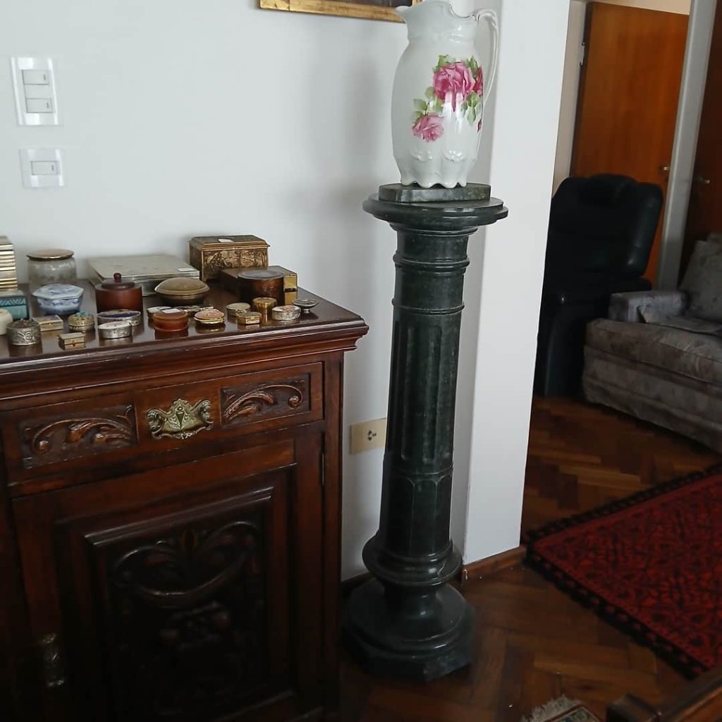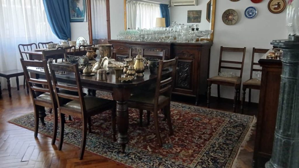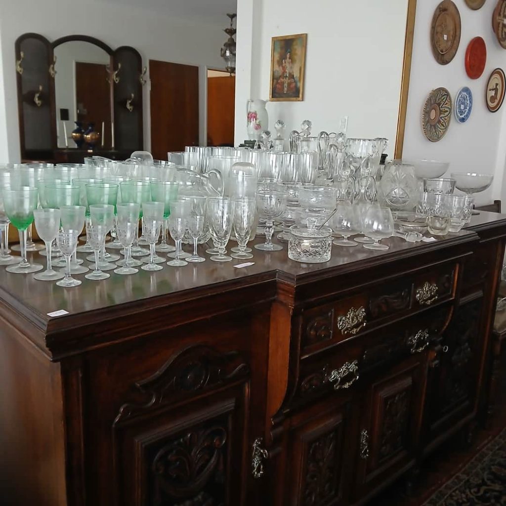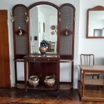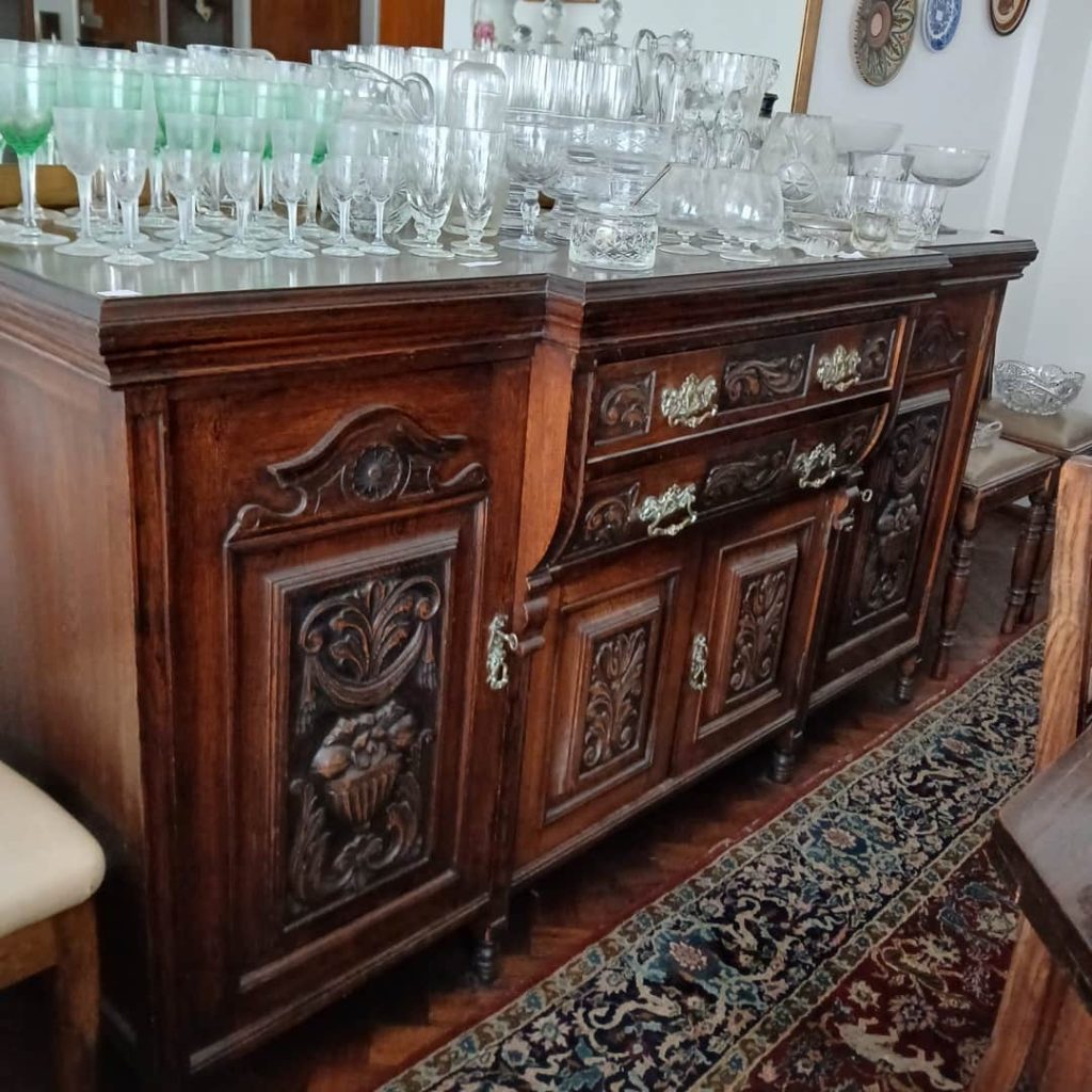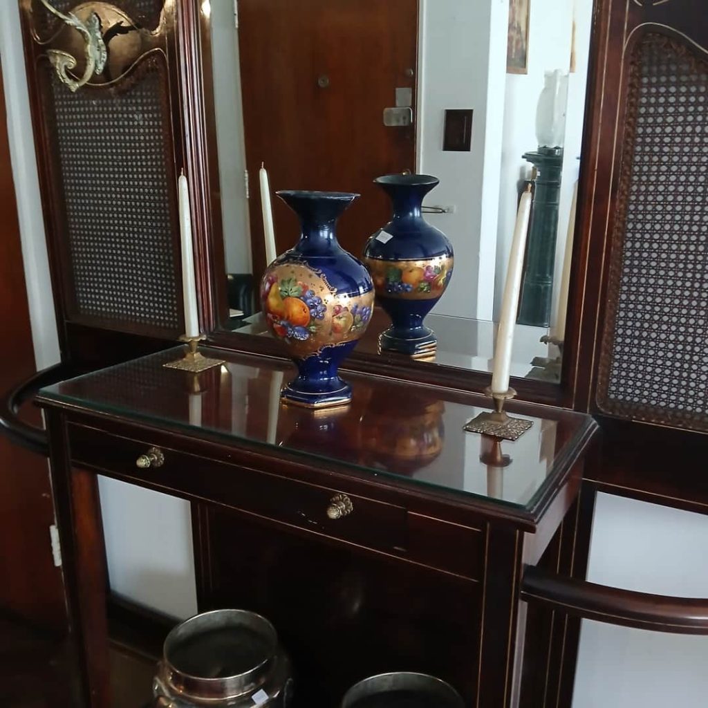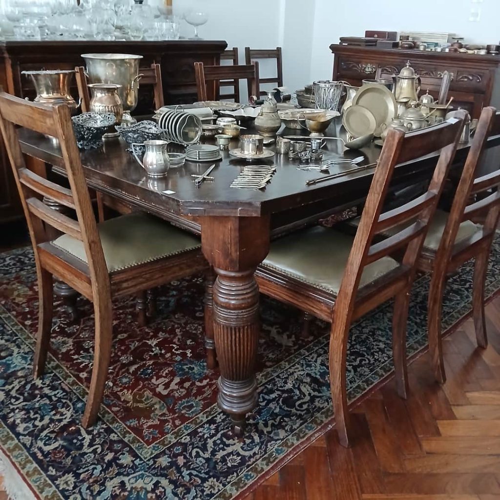 Sofá de 4 cuerpos en pana azulina; par sillones 1 cuerpo; 3 sillas; mesa auxiliar tapa de mármol cuadrada, otra tapa vítrea; mueble recibidor con espejo y percheros estilo Inglés; comedor diseño: mesa con 6 sillas; otro comedor estilo Inglés; mesa, 8 sillas; vajilleros tallado con herrajes de bronce, grande y chico; escritorio estilo Americano; silloncitos con ruedas; cómoda estilo Inglés tapa de mármol; cajonera 6 cajones; pequeño biombo oriental; 2 elásticos de 1 plaza-Adornos y vajilla: lote servicio de te en porcelana nacional hojas en dorado; tazas de café; servicio de café en porcelana Verbano; jarra y 3 jarros en cerámica bordó; 6 tazas en porcelana Brasilera; lote platos en loza nacional con flores rosas y celestes; figuras biscuit; jarra en porcelana Checoslovaca; metal plateado: balde refrescador, platos de sitio, 2 cafeteras y lechera, cafeteras, jarras, azucareras, maceteros, bandejas, caramelera con tapa metal; pedestal de mármol; escudo enmarcado; porta botella en alpaca y asta, mate de alpaca con bombilla, cuchillo con vaina de alpaca; colección de pastilleros; lote cubiertos metal plateado, 4 mates en madera, encendedor de mesa; cajas; platos decorativos; florero en cerámica azul cobalto con decó de fruta; cristalería, copas y vasos, floreros, botellones y jarras, ensaladeras, centros con pie, copetinero; reloj Inglés de pared; 2 íconos; espejo biselado montura de madera con estante, otro montura de madera; cuadros decorativos orientales; lámparas de hierro, de cerámica, con brazo móvil, de pie en madera; portarretratos-Microondas; enseres de cocina; libros, literatura, poesía, religión, teatro, filosofía-Bijoux y más…