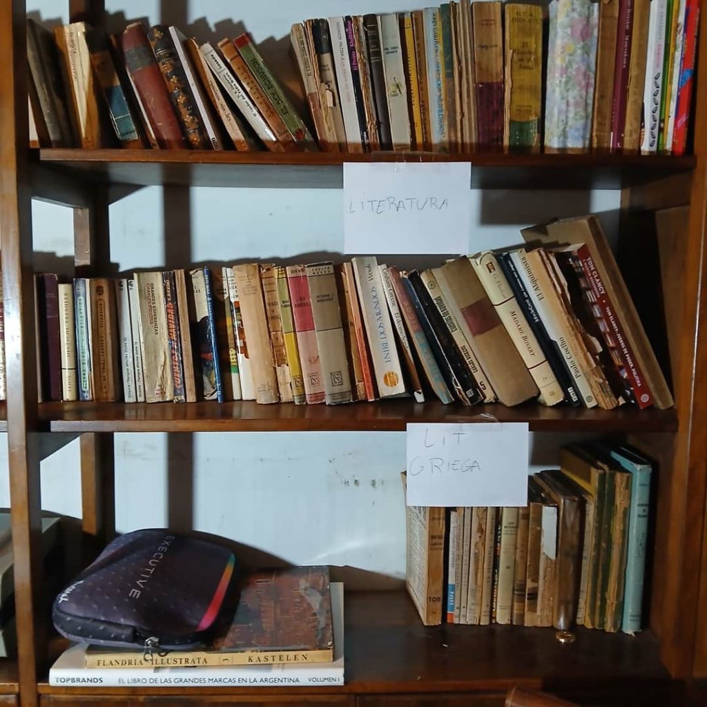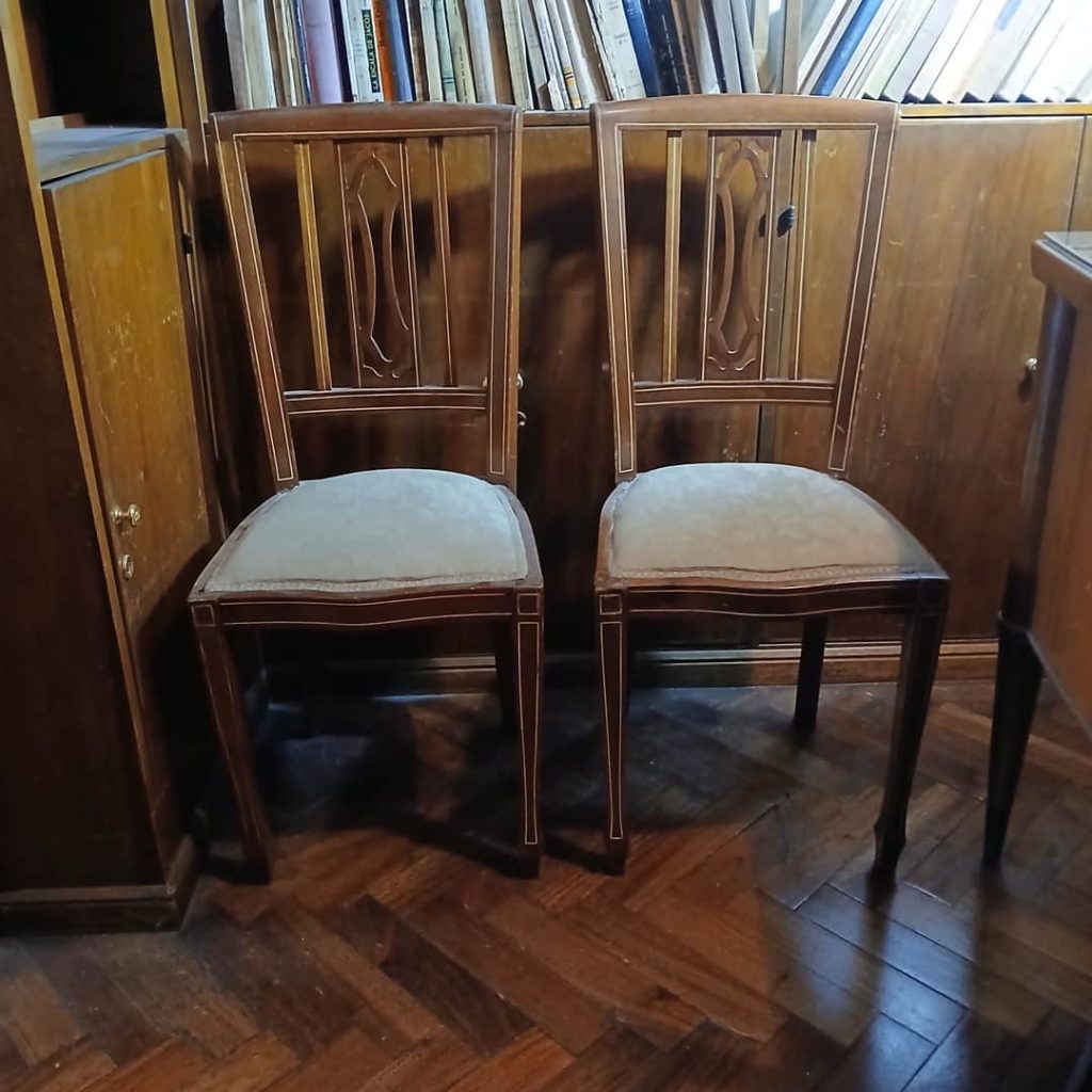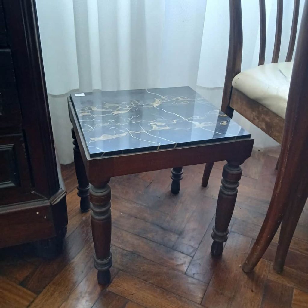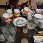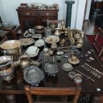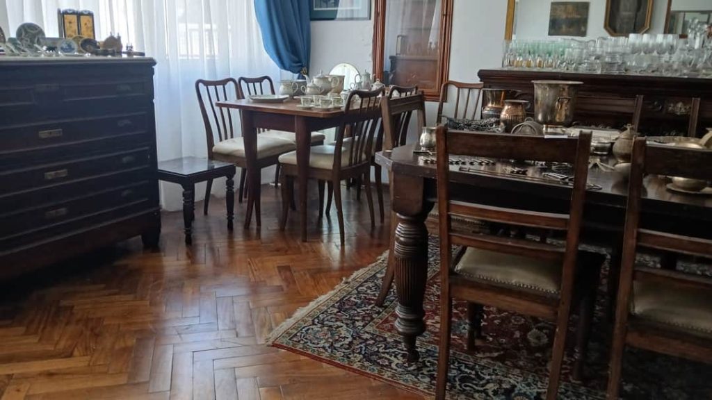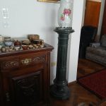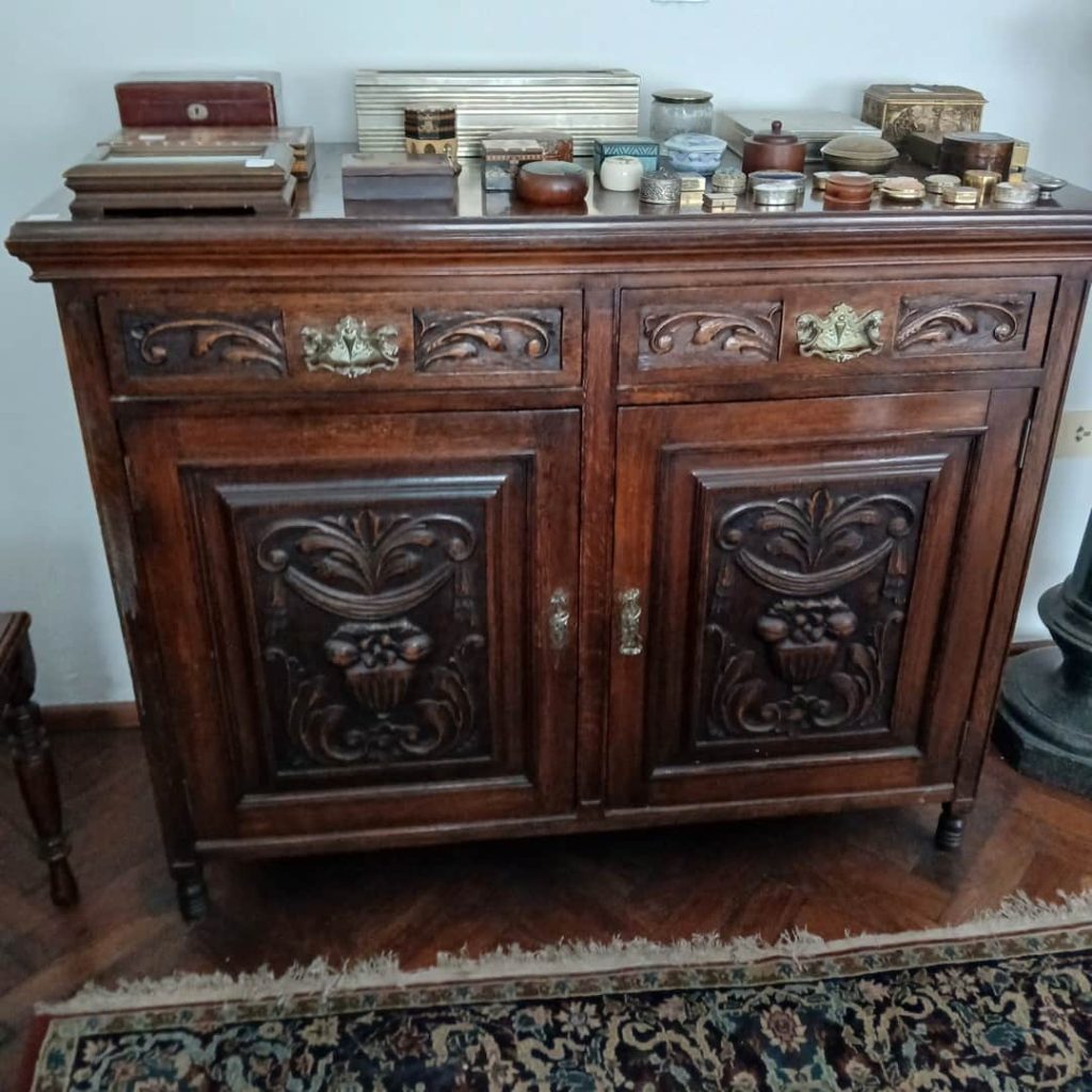 Sofá de 4 cuerpos en pana azulina; par sillones 1 cuerpo; 3 sillas; mesa auxiliar tapa de mármol cuadrada, otra tapa vítrea; mueble recibidor con espejo y percheros estilo Inglés; comedor diseño: mesa con 6 sillas; otro comedor estilo Inglés; mesa, 8 sillas; vajilleros tallado con herrajes de bronce, grande y chico; escritorio estilo Americano; silloncitos con ruedas; cómoda estilo Inglés tapa de mármol; cajonera 6 cajones; pequeño biombo oriental; 2 elásticos de 1 plaza-Adornos y vajilla: lote servicio de te en porcelana nacional hojas en dorado; tazas de café; servicio de café en porcelana Verbano; jarra y 3 jarros en cerámica bordó; 6 tazas en porcelana Brasilera; lote platos en loza nacional con flores rosas y celestes; figuras biscuit; jarra en porcelana Checoslovaca; metal plateado: balde refrescador, platos de sitio, 2 cafeteras y lechera, cafeteras, jarras, azucareras, maceteros, bandejas, caramelera con tapa metal; pedestal de mármol; escudo enmarcado; porta botella en alpaca y asta, mate de alpaca con bombilla, cuchillo con vaina de alpaca; colección de pastilleros; lote cubiertos metal plateado, 4 mates en madera, encendedor de mesa; cajas; platos decorativos; florero en cerámica azul cobalto con decó de fruta; cristalería, copas y vasos, floreros, botellones y jarras, ensaladeras, centros con pie, copetinero; reloj Inglés de pared; 2 íconos; espejo biselado montura de madera con estante, otro montura de madera; cuadros decorativos orientales; lámparas de hierro, de cerámica, con brazo móvil, de pie en madera; portarretratos-Microondas; enseres de cocina; libros, literatura, poesía, religión, teatro, filosofía-Bijoux y más…