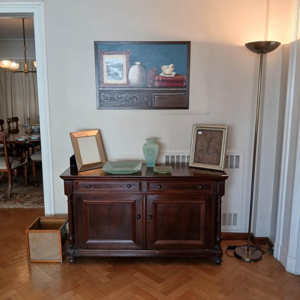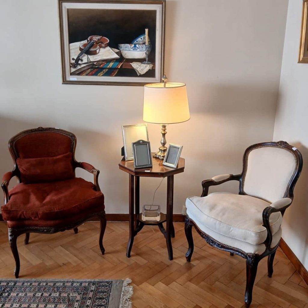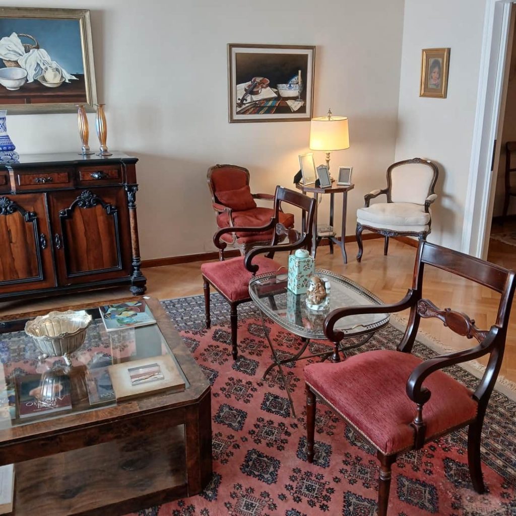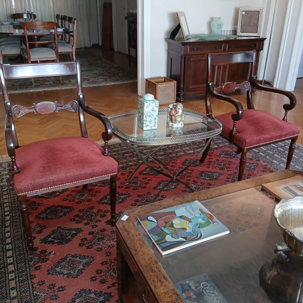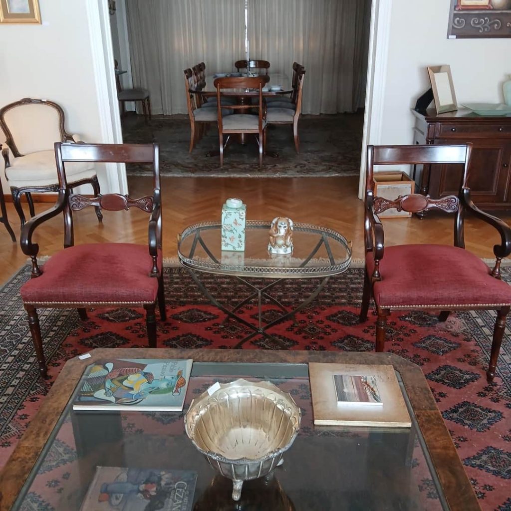 Sillón de 3 cuerpos color manteca; par silloncitos estilo Inglés; silloncito esterillado estilo Francés; 2 sillones 1 cuerpo estilo Francés; sillón 1 cuerpo pana marrón; par silloncitos con funda color gris; sofá cama 1 ½ plazas en corderoy azulino; par sillas estilo Inglés; 2 bancos de guardado; mesas auxiliares: tapa octogonal estilo Inglés doble plano, enchapada doble plano tapas vítreas, estilo Inglés tapa redonda y pata central con 2 cajones, oval con bandeja desmontable bronce, de Bridge; gabinete de guardado estilo Inglés, otro 2 cajones y 2 puertas con herrajes en bronce; mueble bajo auxiliar 2 cajones, 2 puertas, otro estilo Inglés tapa cuero y viñeta; biblioteca bar y puertas; vajillero con vitrina estilo Inglés; comedor: mesa con alargue doble pedestal, 8 sillas, par silloncitos; consola doble pedestal en yeso y tapa vítrea ahumada; biblioteca; cama 2 plazas estilo Inglés con colchón; cama 1 plaza con colchón; par mesas de luz estilo Inglés, otras 1 cajón y puertas, con 3 cajones; perchas valet madera-Adornos y vajilla, lote de vajilla Verbano blanca; platos decorativos; potiche de cerámica craquele; porcelana “Mono”; violetero cristal azul con pie, refrescador cristal con virola; servicio de te en metal plateado Elkington 5 piezas, par candeleros metal; barómetro; reloj de pared estilo Inglés; espejo; óleo “Naturaleza muerta”, cuadro firmado Nelly Álvarez, otros decorativos; láminas “Patos”; óleografía “Libros”; araña tipo Osler 4 luces; luminaria techo; 2 luminarias en chapa; lámparas de mesa metal, en cerámica blanca, negra, en bronce, de pie en hierro y bronce, de pie en bronce, velador bronce; par apliques 2 luces en bronce estilo Holandés-TV LG con soporte; TV Samsung; Ukelele; heladera Mabe No Frost; lavarropas Whirlpool; cafetera Express Cuori; comedor diario: mesa madera blanca con tapa azulejos blancos y 4 sillas blancas con almohadones; bicicleta fija Sport Element; libros de arte y otros varios; alfombras; ropa blanca, cortinas-Ropa de hombre, mujer y más…
