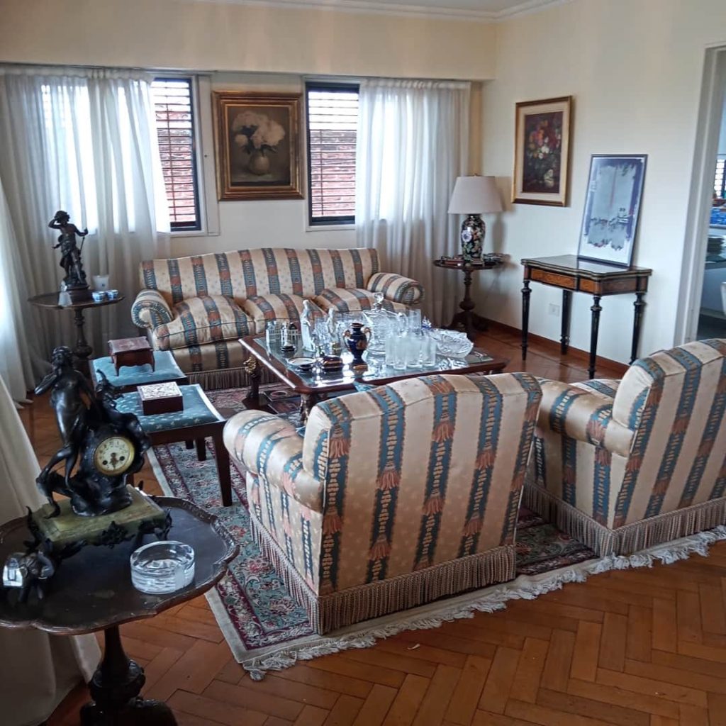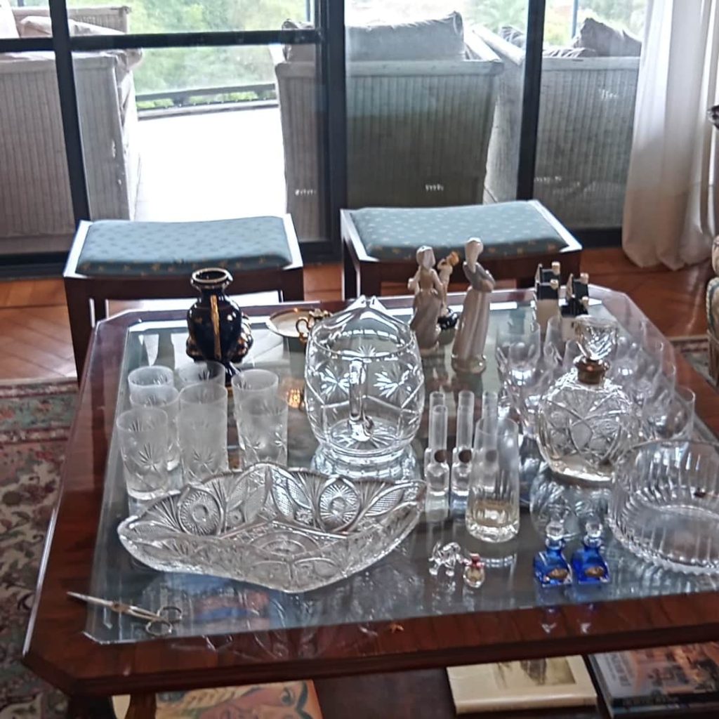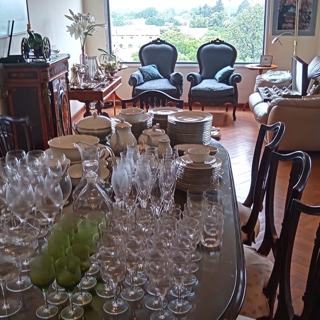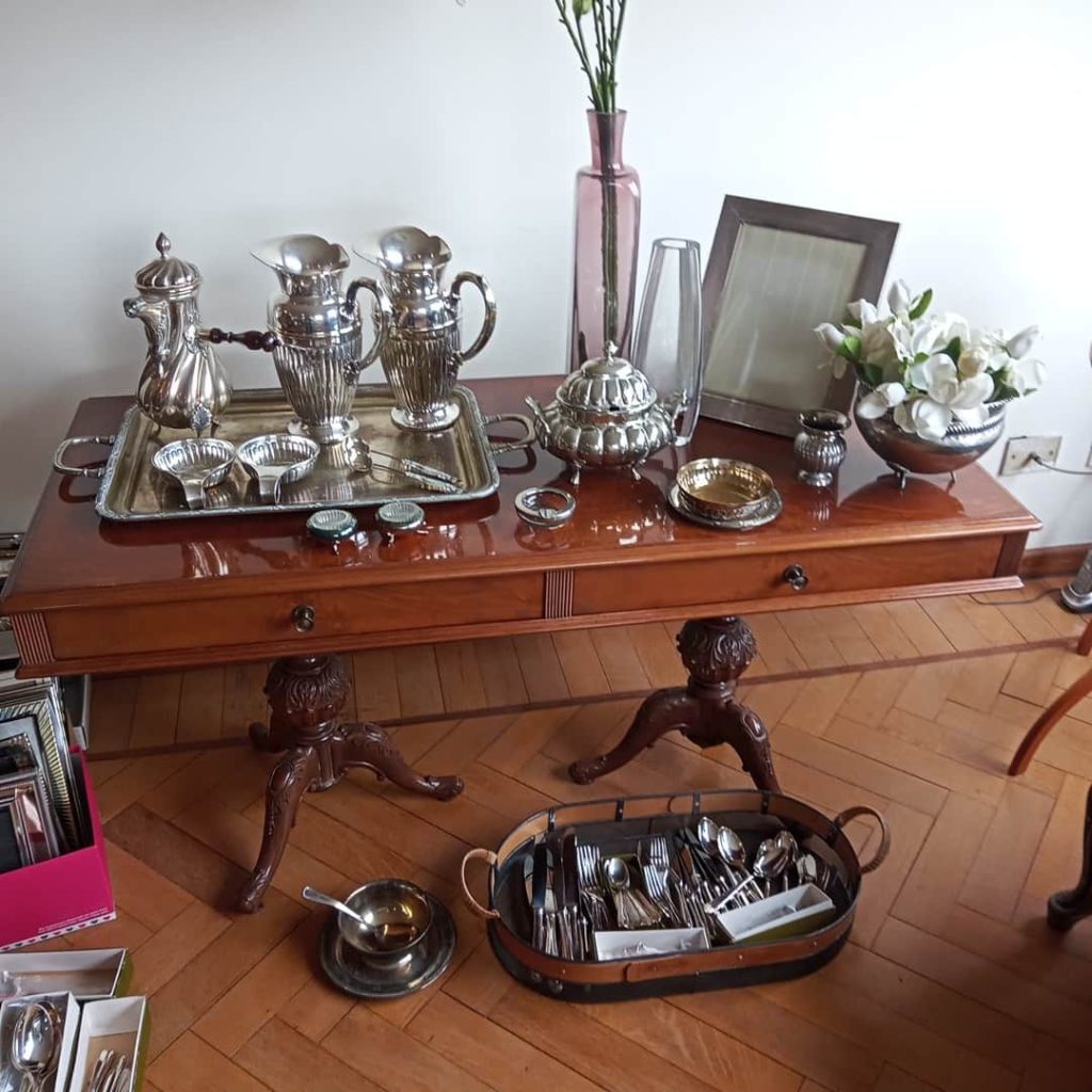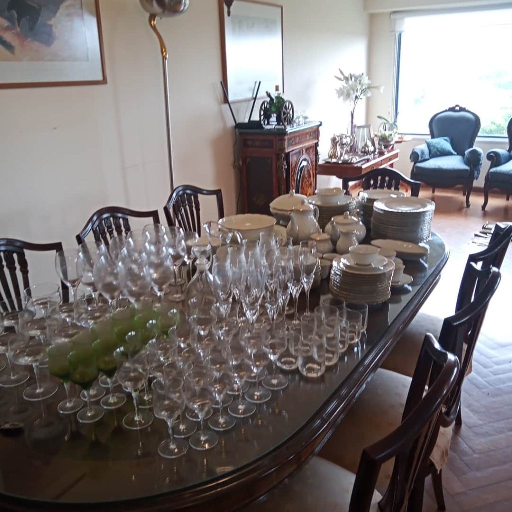 Sofá 3 cuerpos y 2 sillones 1 cuerpo tapizado bastones en natural y celeste; sofá en cuero 2 cuerpos color natural; 2 sillones Ingleses tapizados en seda azul; 2 sillas de roble; puff cuadrado marrón; 2 banquetas con tapizado azul; banqueta estilo Francés; banqueta tapizada en seda; mesas auxiliares: baja de sala con 2 cajones, con pie central tapa redonda y bordes irregulares, de juego Napoleón, cuadrada 2 planos Imperio, de arrimo con bordes irregulares, redonda con pie central; mueble boullé y escritorio Francés; comedor estilo Inglés: mesa oval entera y 8 sillas lira; vajillero en raíz con 6 puertas y 2 vitrinas centrales; mueble con esquina, estantes, 4 puertas y 3 cajones; mueble rack con ruedas, 2 puertas y vidrio; revistero en hierro y ratán; escritorio estilo Inglés con 2 cajones y silla; biblioteca pequeña con 2 cajones y 3 estantes; chiffonier Francés 7 cajones patinado en verde, con mármol; cómoda estilo Imperio rosa, con mármol, 5 cajones y espejo; 2 camas 1 plaza en hierro con sommiers; 2 mesas luz estilo Francés patinadas en verde, con mármol; cama 2 plazas con respaldo patinado en rosa y colchón; revistero antiguo con 1 cajón y ruedas; percha valet acrílico; mesas de luz tipo Imperio patinadas de rosa, con 3 cajones, mármol rosa y broncería-Adornos y vajilla: servicio de mesa Limpges blando con virola dorada; lote Verbano con te y café, fuentes; lote platos Italy bordes azules y centro frutos; set de te gris y florero oriental; casitas KLM; platos porcelana; ánfora Limoges; figuras Nao, Lladró; caja Limoges; hojas porcelana; cristalería, juegos de copas cristal, centro de mesa, copas, jarras, ensaladera, hieleras, botellón; metal plateado, jarras, bandeja, azucarera, cajas varias, despojadores, chocolatera, lote platos de pan, juegos cubiertos para 12 y para 6 personas, platos de sitio Christofle; reloj con figura y reloj de pared; espejos; cuadros firmados; gran óleo “Campo”, acrílico sobre papel, “Sin título” Josefina Robirosa, “Dique Luján hace mucho” Eduardo Audivert, “Naturaleza muerta” Orihuel, serigrafía Perez Celis, otros óleos decorativos; portarretratos; araña bolsa Imperio; lámpara de bronce pie con 2 luces, una móvil para lectura, de mesa orientales, de escritorio con pantalla de chapa verde, con brazo móvil en acero y travertino, de pie platil, veladores-Heladera doble puerta Whirlpool, otra heladera 3 fríos Whirlpool; comedor diario: mesa Italiana con vidrio, 2 sillas en caño; microondas BGH; cafetera Liliana; tostadora Smartlife; horno BGH; secarropas y lavarropas Whirlpool; lavavajillas; cantidad vajilla de diario, pirex, ollas, sartenes; cantidad enseres cocina; balcón: juego en rattán sintético: sillón 2 cuerpos, par sillones 1 cuerpo y mesa, 2 sillas plástico plegables con mesa; libros y CD´s; artículos de ortopedia; alfombras; ropa de blanco, manteles, mantas-Ropa hombre y Sra.; sombreros, accesorios, bijoux y más…