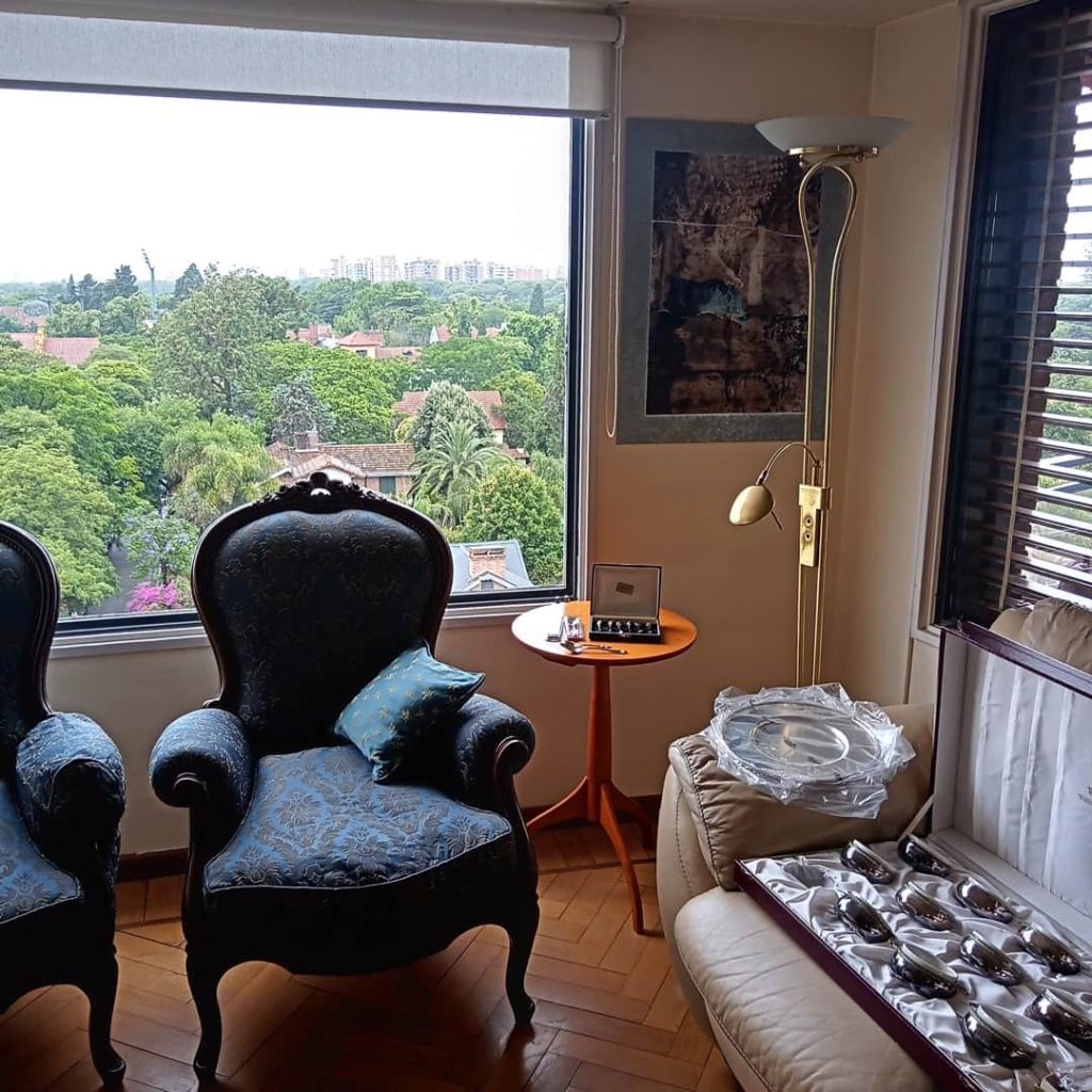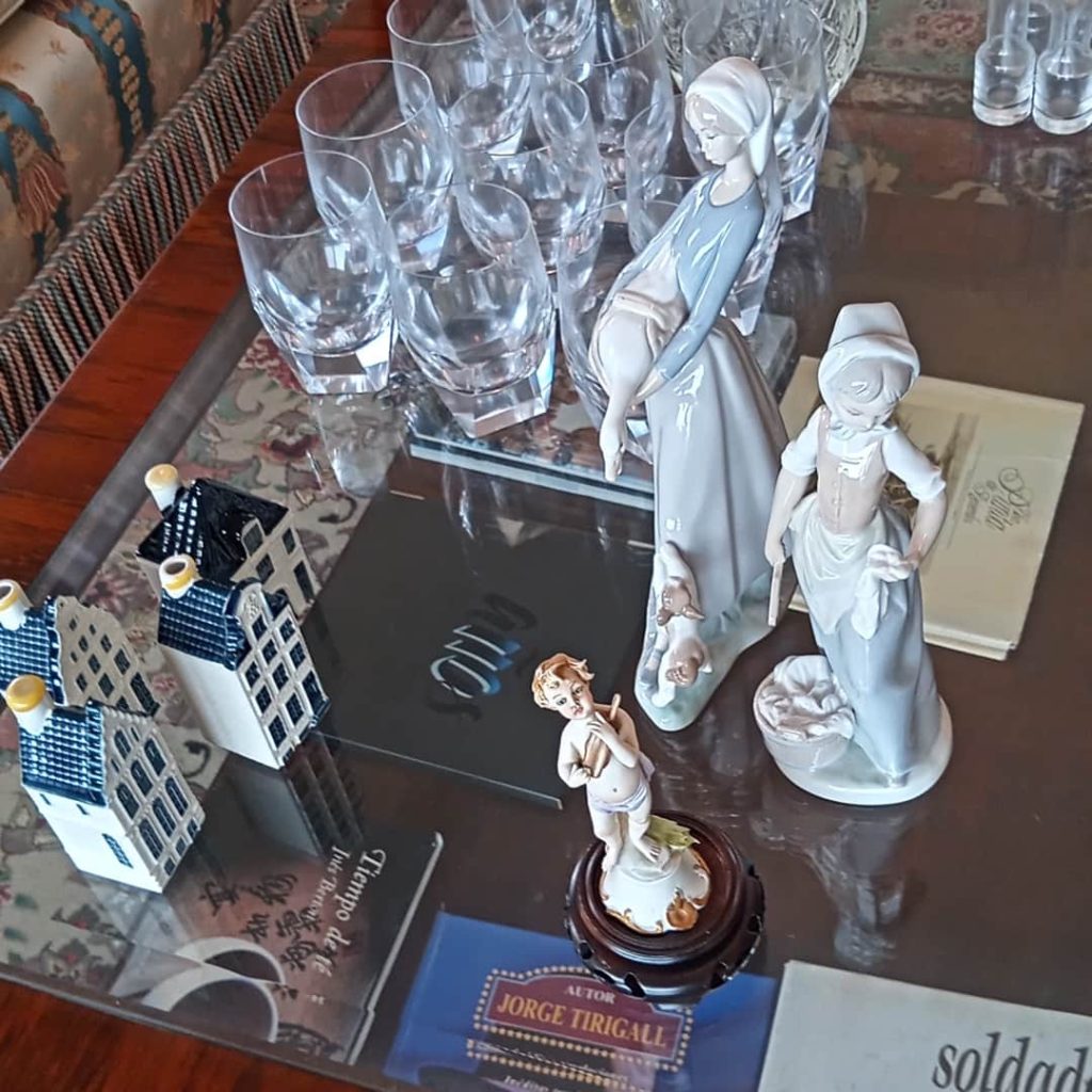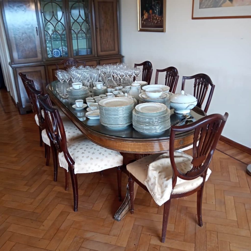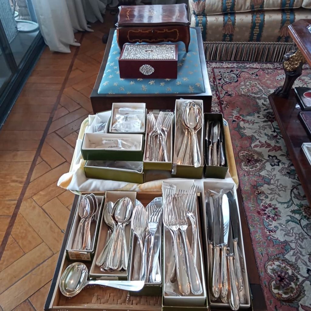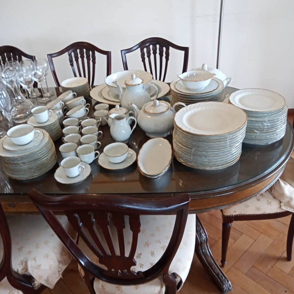 Sofá 3 cuerpos y 2 sillones 1 cuerpo tapizado bastones en natural y celeste; sofá en cuero 2 cuerpos color natural; 2 sillones Ingleses tapizados en seda azul; 2 sillas de roble; puff cuadrado marrón; 2 banquetas con tapizado azul; banqueta estilo Francés; banqueta tapizada en seda; mesas auxiliares: baja de sala con 2 cajones, con pie central tapa redonda y bordes irregulares, de juego Napoleón, cuadrada 2 planos Imperio, de arrimo con bordes irregulares, redonda con pie central; mueble boullé y escritorio Francés; comedor estilo Inglés: mesa oval entera y 8 sillas lira; vajillero en raíz con 6 puertas y 2 vitrinas centrales; mueble con esquina, estantes, 4 puertas y 3 cajones; mueble rack con ruedas, 2 puertas y vidrio; revistero en hierro y ratán; escritorio estilo Inglés con 2 cajones y silla; biblioteca pequeña con 2 cajones y 3 estantes; chiffonier Francés 7 cajones patinado en verde, con mármol; cómoda estilo Imperio rosa, con mármol, 5 cajones y espejo; 2 camas 1 plaza en hierro con sommiers; 2 mesas luz estilo Francés patinadas en verde, con mármol; cama 2 plazas con respaldo patinado en rosa y colchón; revistero antiguo con 1 cajón y ruedas; percha valet acrílico; mesas de luz tipo Imperio patinadas de rosa, con 3 cajones, mármol rosa y broncería-Adornos y vajilla: servicio de mesa Limpges blando con virola dorada; lote Verbano con te y café, fuentes; lote platos Italy bordes azules y centro frutos; set de te gris y florero oriental; casitas KLM; platos porcelana; ánfora Limoges; figuras Nao, Lladró; caja Limoges; hojas porcelana; cristalería, juegos de copas cristal, centro de mesa, copas, jarras, ensaladera, hieleras, botellón; metal plateado, jarras, bandeja, azucarera, cajas varias, despojadores, chocolatera, lote platos de pan, juegos cubiertos para 12 y para 6 personas, platos de sitio Christofle; reloj con figura y reloj de pared; espejos; cuadros firmados; gran óleo “Campo”, acrílico sobre papel, “Sin título” Josefina Robirosa, “Dique Luján hace mucho” Eduardo Audivert, “Naturaleza muerta” Orihuel, serigrafía Perez Celis, otros óleos decorativos; portarretratos; araña bolsa Imperio; lámpara de bronce pie con 2 luces, una móvil para lectura, de mesa orientales, de escritorio con pantalla de chapa verde, con brazo móvil en acero y travertino, de pie platil, veladores-Heladera doble puerta Whirlpool, otra heladera 3 fríos Whirlpool; comedor diario: mesa Italiana con vidrio, 2 sillas en caño; microondas BGH; cafetera Liliana; tostadora Smartlife; horno BGH; secarropas y lavarropas Whirlpool; lavavajillas; cantidad vajilla de diario, pirex, ollas, sartenes; cantidad enseres cocina; balcón: juego en rattán sintético: sillón 2 cuerpos, par sillones 1 cuerpo y mesa, 2 sillas plástico plegables con mesa; libros y CD´s; artículos de ortopedia; alfombras; ropa de blanco, manteles, mantas-Ropa hombre y Sra.; sombreros, accesorios, bijoux y más…