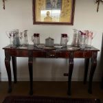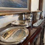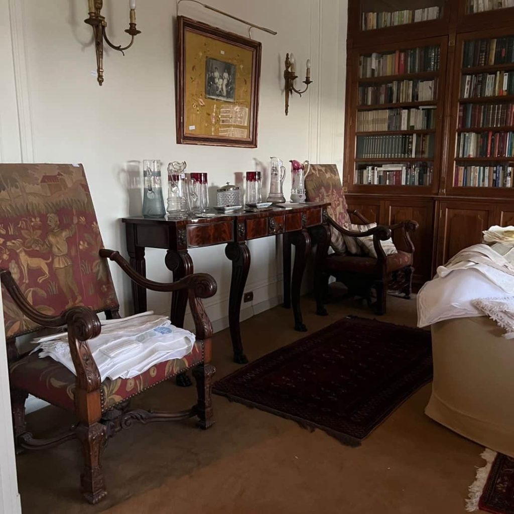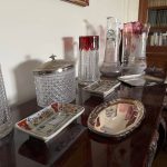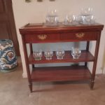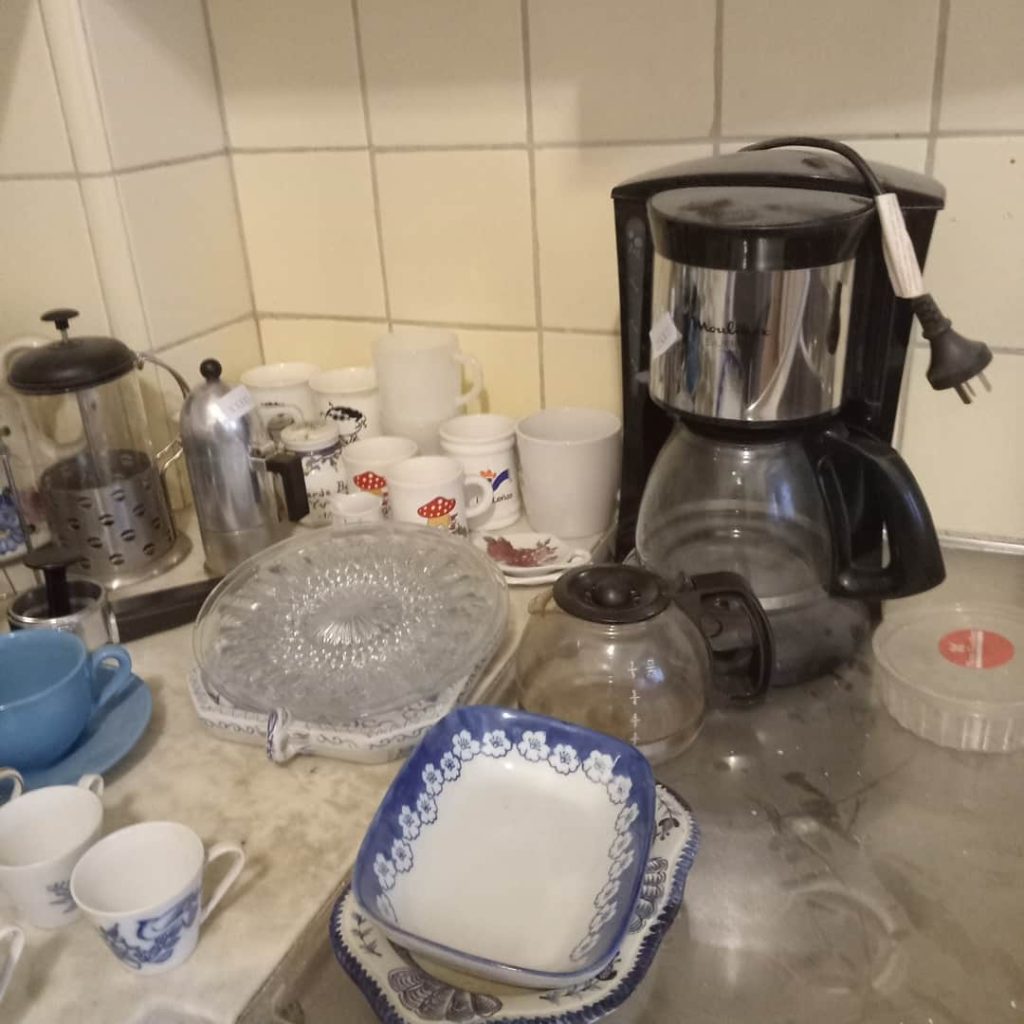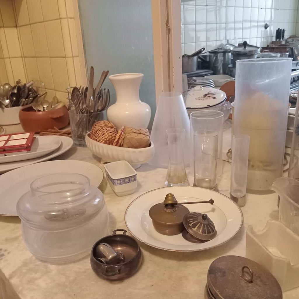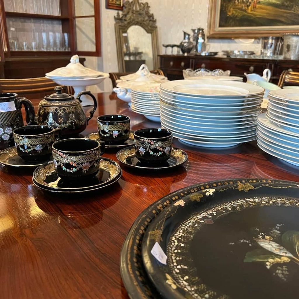 Sofá 3 cuerpos y par sillones 1 cuerpo tapizado en cuero; chaise longue estilo Inglés; sofás 3 y 2 cuerpos tapizados en carpincho; trono tapizado en gobelino estilo Chippendale; par tronos estilo Inglés; par sofás 2 cuerpos; par sillas con respaldo en madera tallada; par sillones 1 cuerpo; sillón bergere 1 cuerpo; sillón relax; silla estilo Inglés; mecedora; banqueta estilo Francés y otras; mesas auxiliares: con centro oval, formato riñón, libro tapa oval estilo Inglés, tapa rectangular en mármol, acrílica 4 planos, semi circular de apoyo, 3 planos escalonados, tapa rectangular, estilo Inglés tapa redonda pie central, tapa redonda, estilo Inglés 1 cajón, 3 planos escalonados; arcón madera tallada; comedor estilo Inglés, 10 sillas y par silloncitos cabecera; consola Francesa tapa verde, otra estilo Chippendale talla leones enchapada en raíz, tapa rectangular libro, pie central tapa redonda, par con tachas; mueble auxiliar 5 puertas estilo Inglés; tocador borde irregular con aplicaciones bronce estilo Francés; cómoda patinada 3 cajones tapa mármol, otra pequeña 3 cajones; bibliotecas colgante, estilo Francés, circular; esquinero estilo Inglés estantes degradé; par respaldos tapizados; mesa de luz; respaldo y piecera hierro; par mesas de luz patinada tapa mármol-Adornos y vajilla: lote platos en porcelana Limoges virola dorada; lote platos porcelana Inglesa con flores tonos pastel; tazas de café y de te; lote vajilla Indian Tree; potiche en porcelana; sopera y par salseras loza Inglesa; par floreros turquesa con personajes opalinas; jarra Art Nouveau con decoración floral; botellón azul con tapa chico y botella azul; jarras iridiscentes; par floreros cerámica esmaltada turquesa; par floreros isabelinos; 3 despojadores porcelana, 2 despojadores turquesas y par orientales; par jarras vidrio prensado 2 colores; par jarras pintadas virola dorada; par candeleros patinado en verde, par de “Ángeles” y con inscripción; jarrón y tintero en cerámica; bizcochera en cristal tallado tapa metal; cristalería, par jarras, jarrón, botellones, juego copas pie torneado firmadas decorado, par ceniceros, par candeleros con caireles, copón cristal color, cenicero diseño; potiche metal plateado; par caracolas metal; caviarera metal; balde refrescador en metal; cantidad bandejas en metal plateado; macetero, par candeleros, imagen religiosa, maceta y balde bronce; retablo de la Virgen, talla Cristo en la Cruz, “Imagen religiosa” sobre acrílico; libro con herrajes en metal; Árbol de la vida; pie verde con caramelos Murano; pequeñas piezas en malaquita; cajitas; geisha en marfil; tríptico estilo oriental; mapamundi; reloj bolitas; reloj de pared caja madera; espejo marco dorado ángeles en yeso patinado, espejo marco dorado y otros; cuadros firmados, óleos “Bosque” Mazza, decorativos “Noche en altamar”, “Personaje masculino” y otros; óleos miniaturas “Naturalezas muertas”; lámina enmarcada oriental; grabados; dibujo “Personajes”; portarretratos; araña estilo Francés bolsa; quinqué colgante; par lámparas madera patinada, otras bronce, porcelana, celedón, porcelana decoración oriental, en bronce brazo móvil; mesas lámparas; apliques bronce Franceses, otros-Yamaha AX-492, Yamaha TX-480, Yamaha CDC-565; microondas; comedor diario: mesa tapa rectangular blanca y mesa tapa fórmica rectangular, sillas; bebidas; atril en bronce; bicicleta fija; silla para bebé; alfombras bordó, con cuadrícula guarda perimetral flores y aves, base bordó; mantelería y más…