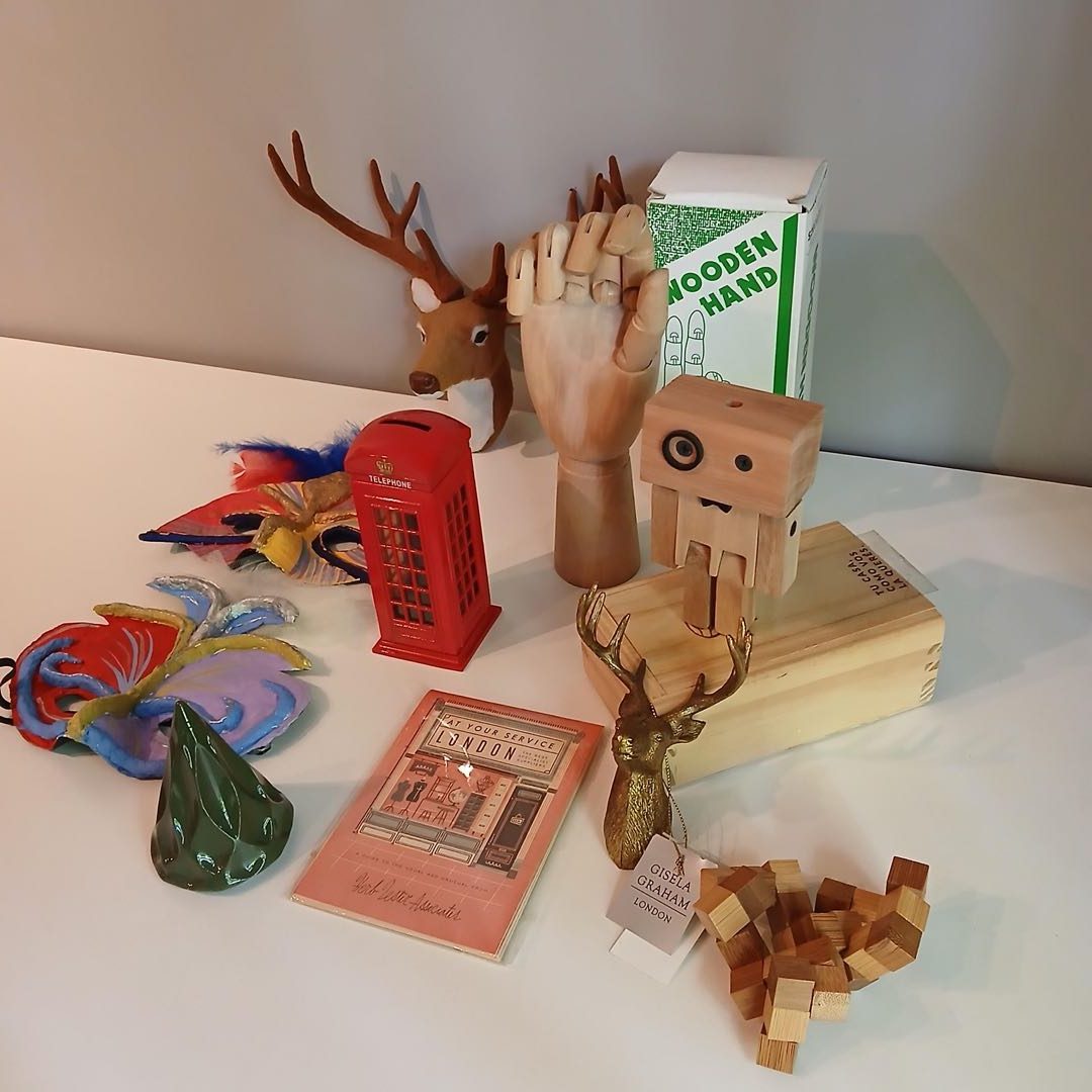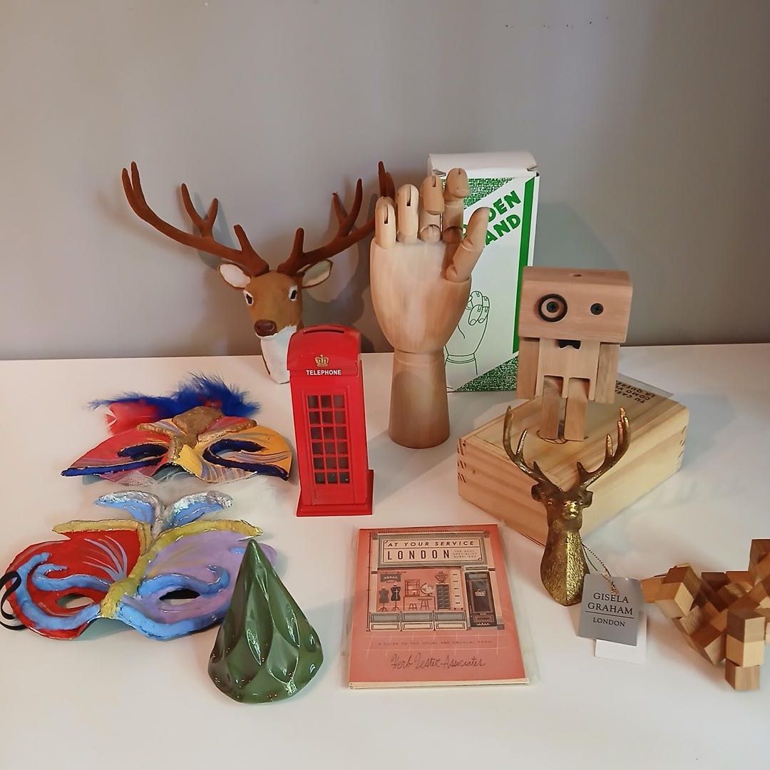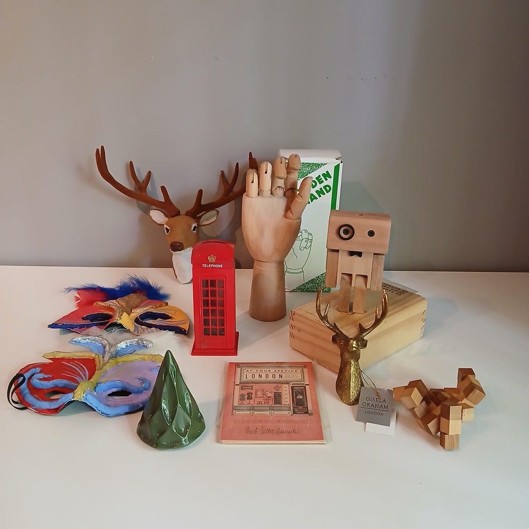 10 piezas: 2 máscaras, 2 cabezas de ciervo, mano de madera, mapa, etc. Alt mano 25 cm.