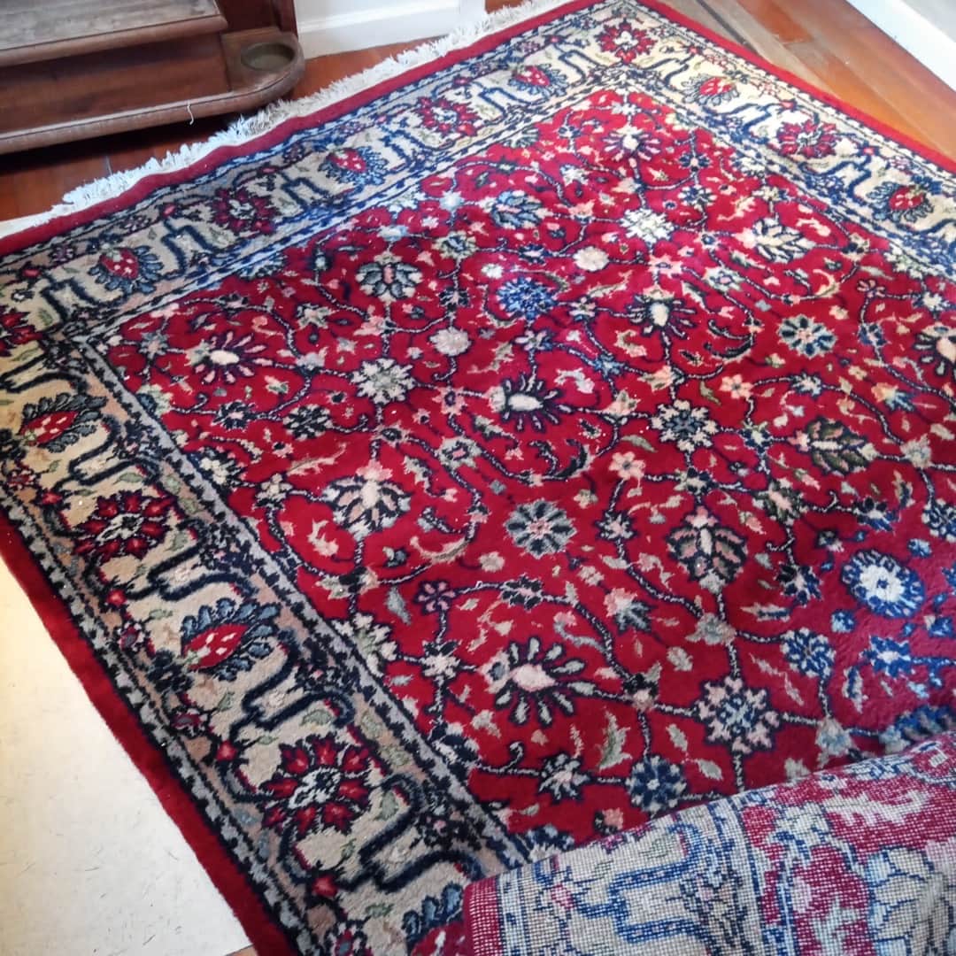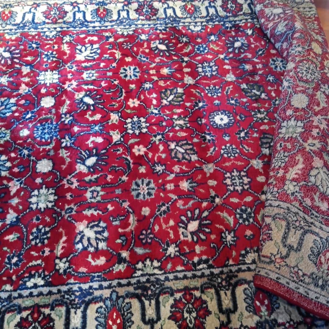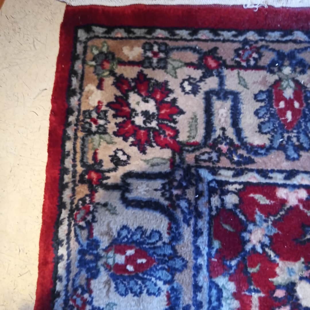 Alfombra en lana color bordó y azul 305 x 204 cm.