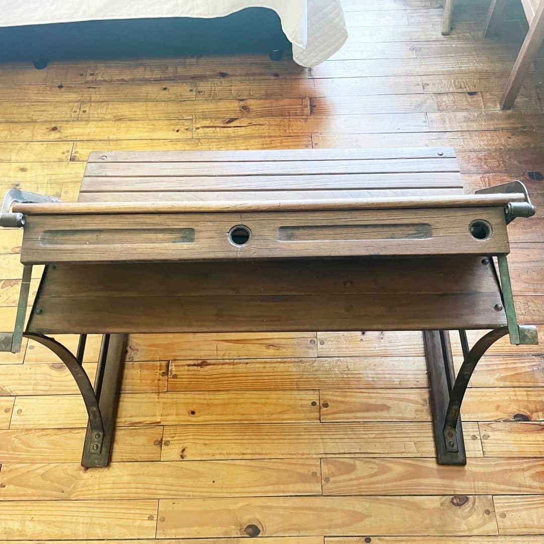 Antiguo Pupitre escolar años 30/40s de madera de Roble y herrajes en hierro fundido. Largo 94 cm , Profundidad 70 cm , Altura 68 cm