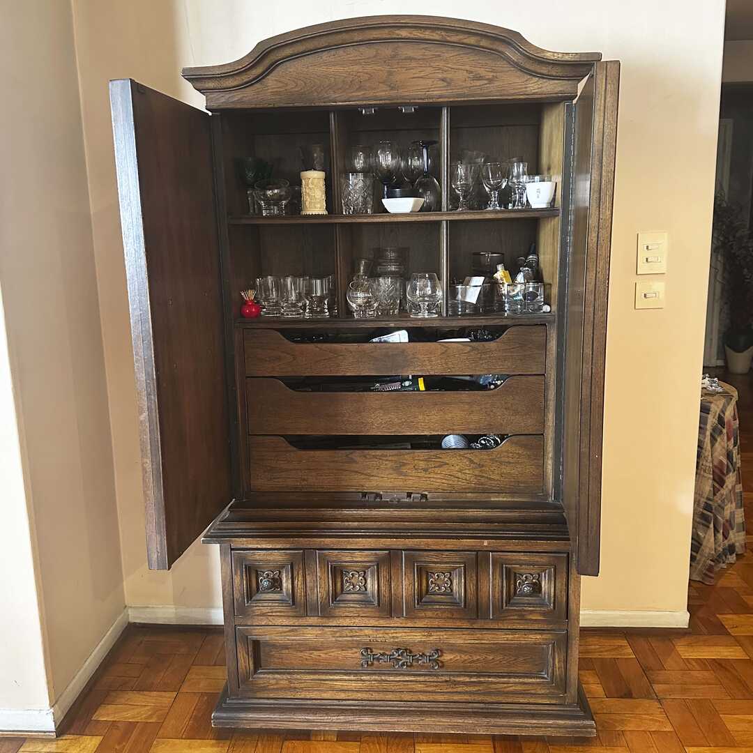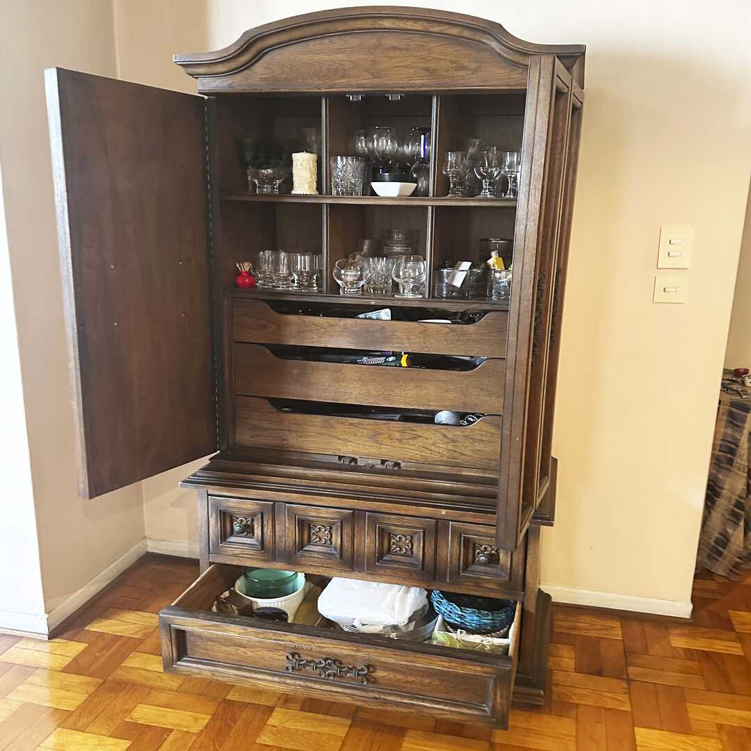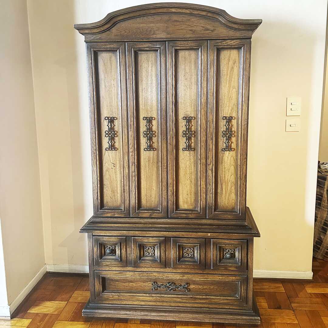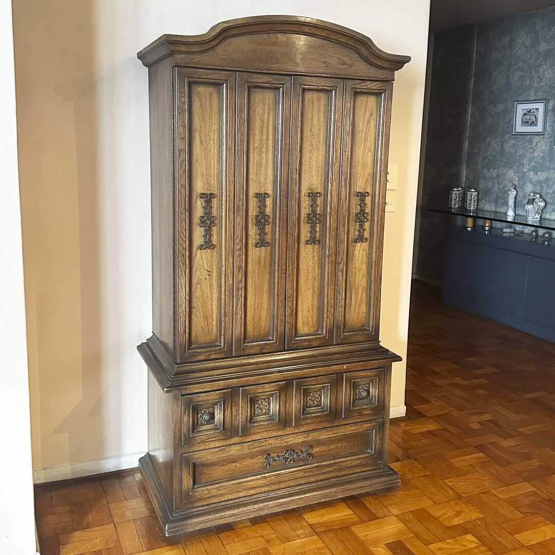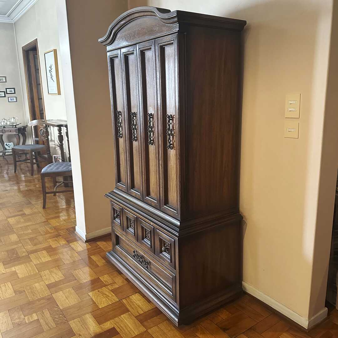 Aparador estilo neoclásico Toscano en madera maciza de nogal. Altura 183 cm, Frente 83 cm, Profundidad 50 cm parte inferior y 42 cm en alzada. Atención: baja por escalera desde un 6to piso.
