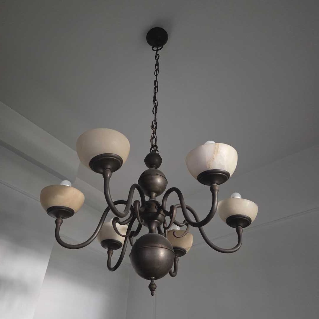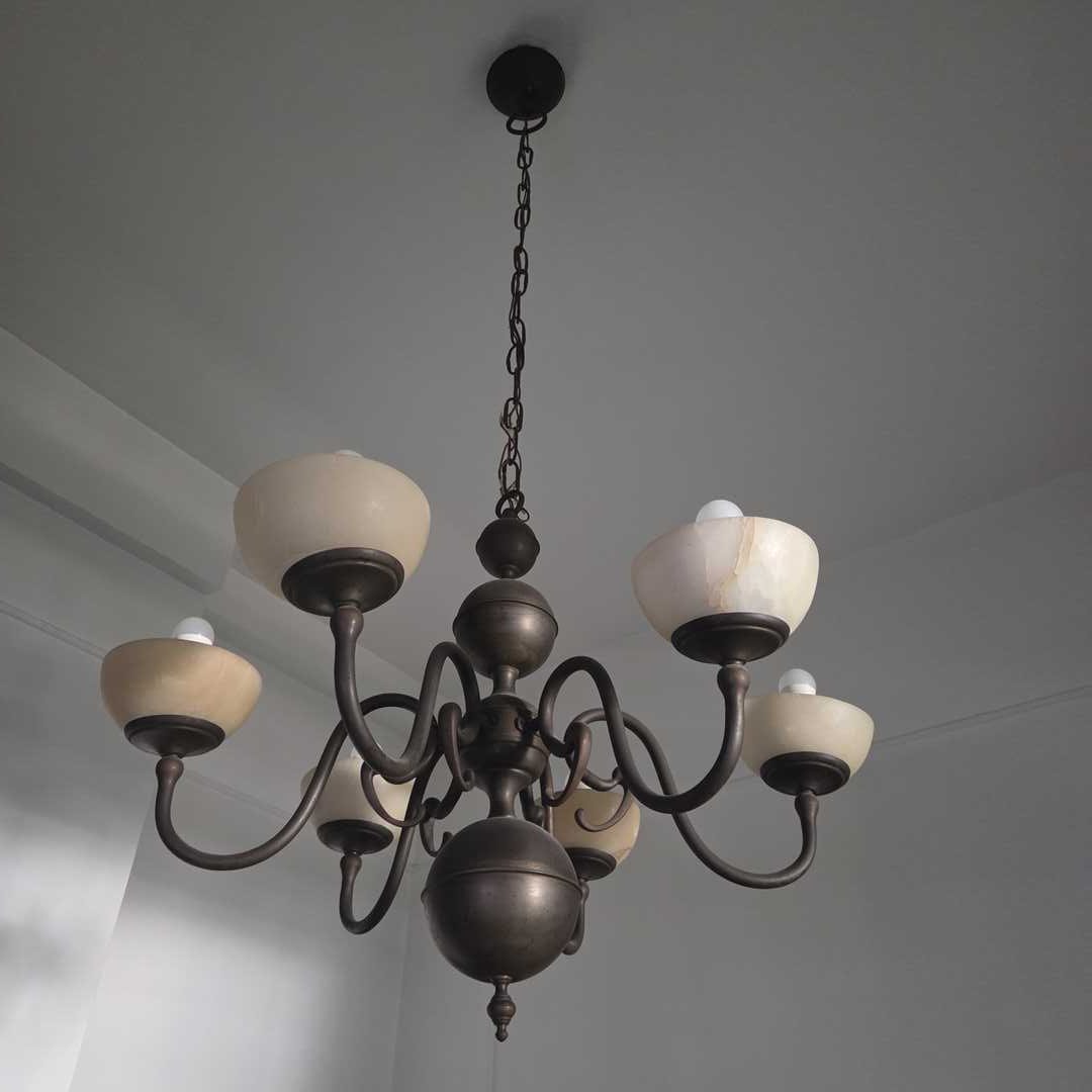 Araña en bronce con 6 brazos y tulipas en alabastro, con detalles de uso (ver fotos). Diám 80 cm aprox. Atención: traer herramientas para su desinstalación.