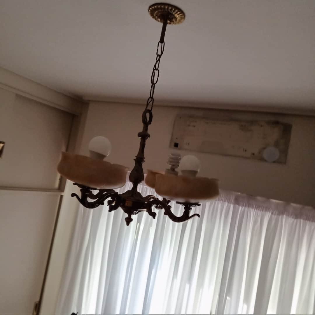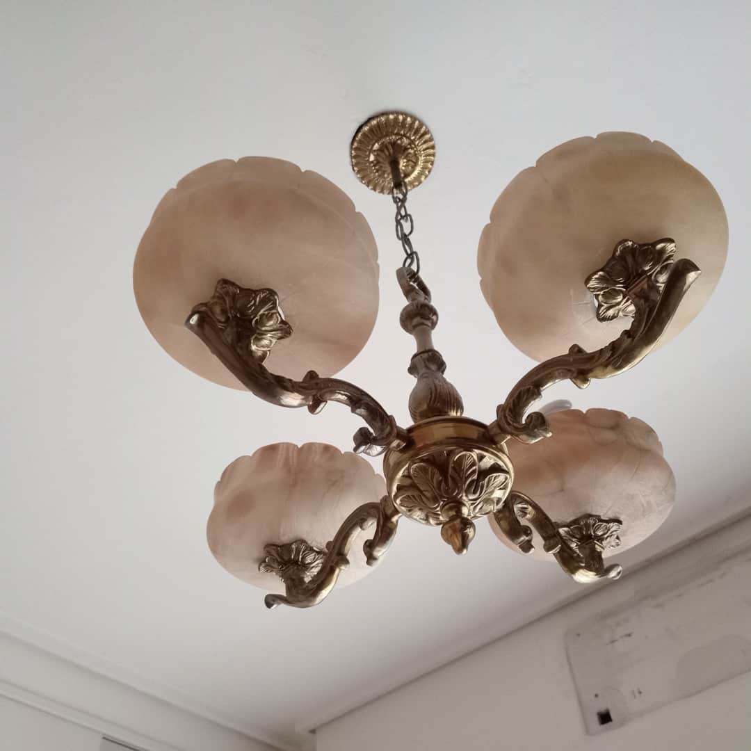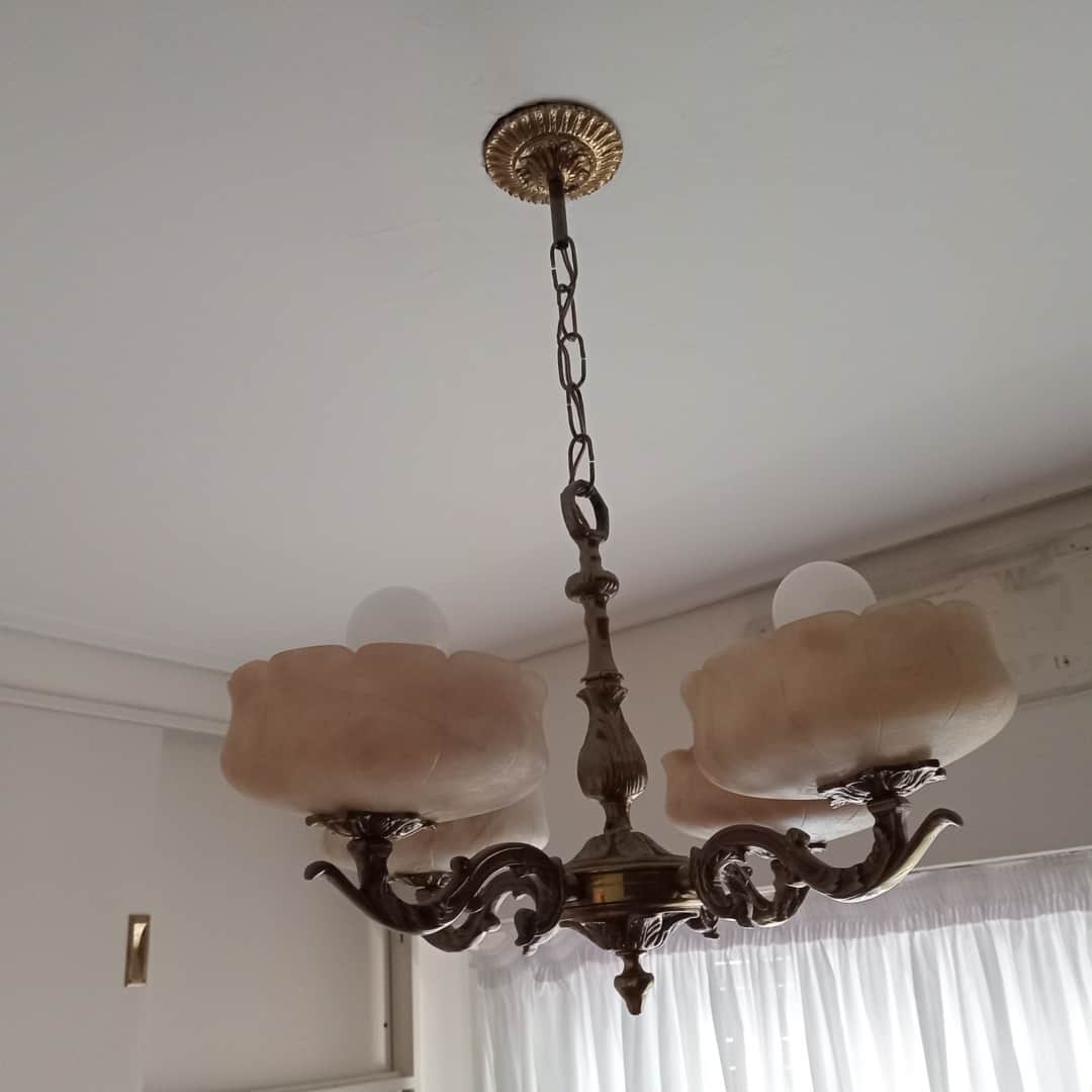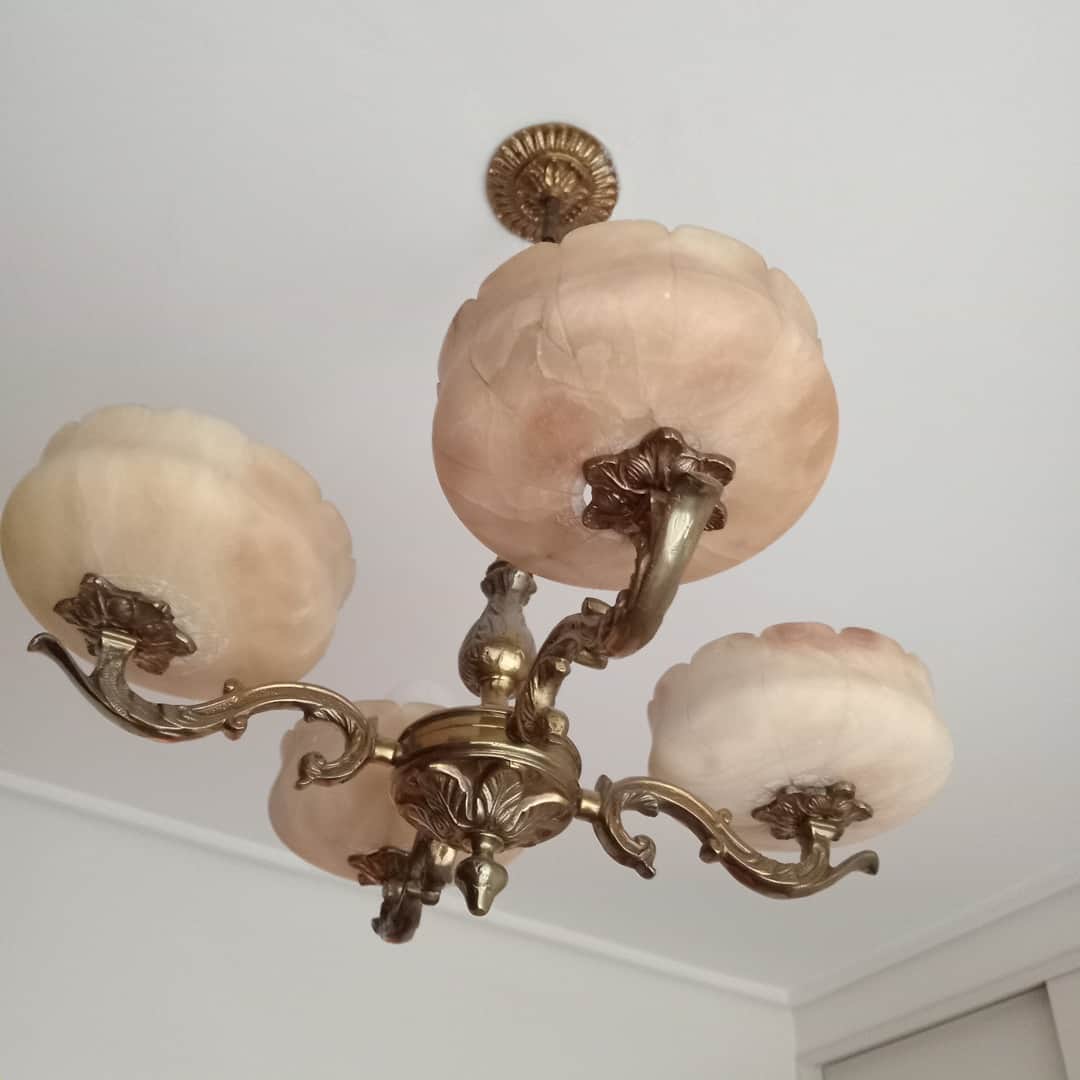 Araña en bronce 4 luces con 4 tulipas en alabastro. Diám aprox 55 cm.