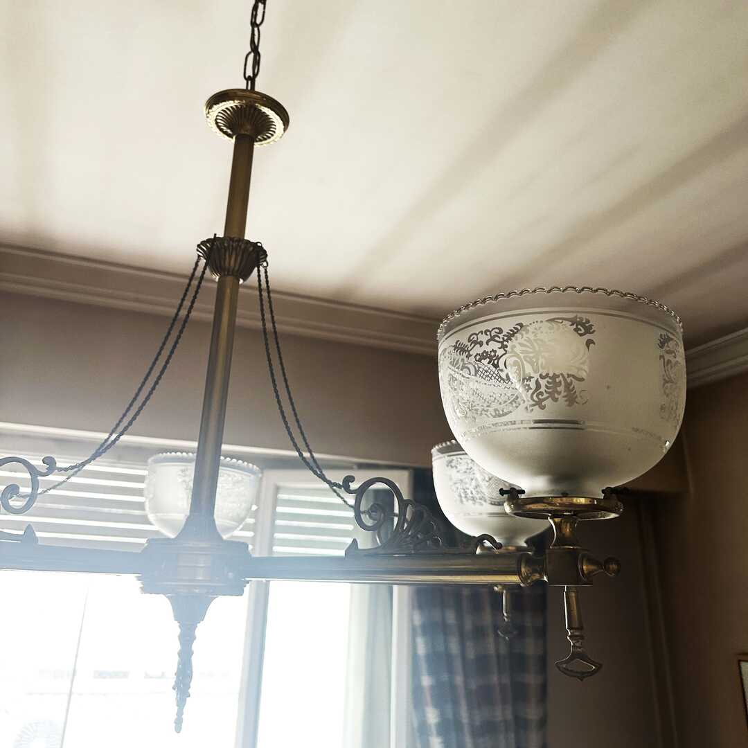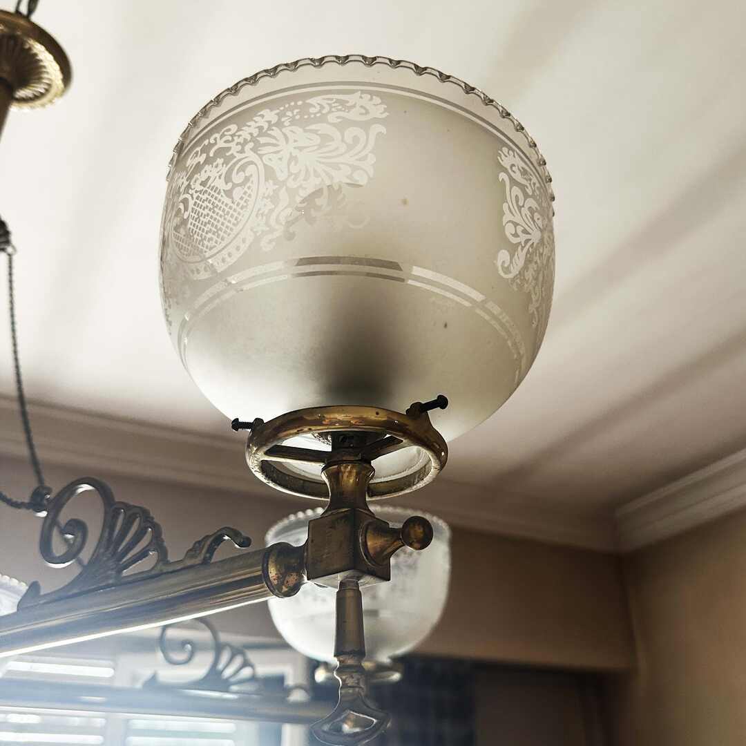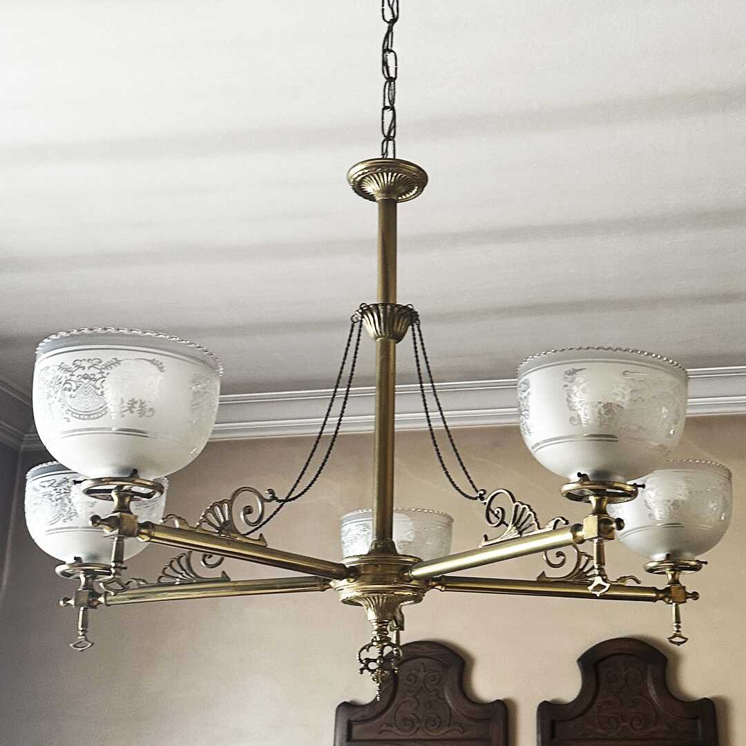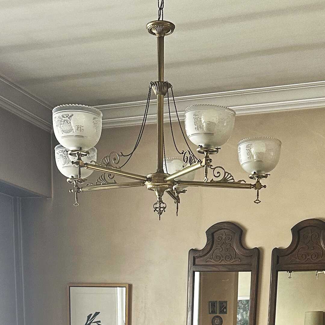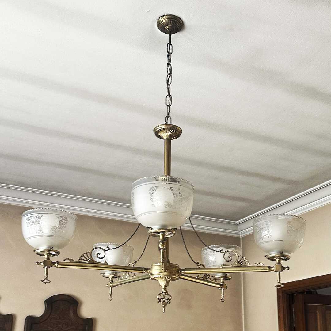 Araña de techo Osler de bronce con 5 tulipas y 5 luces. A desinstalar por el comprador.