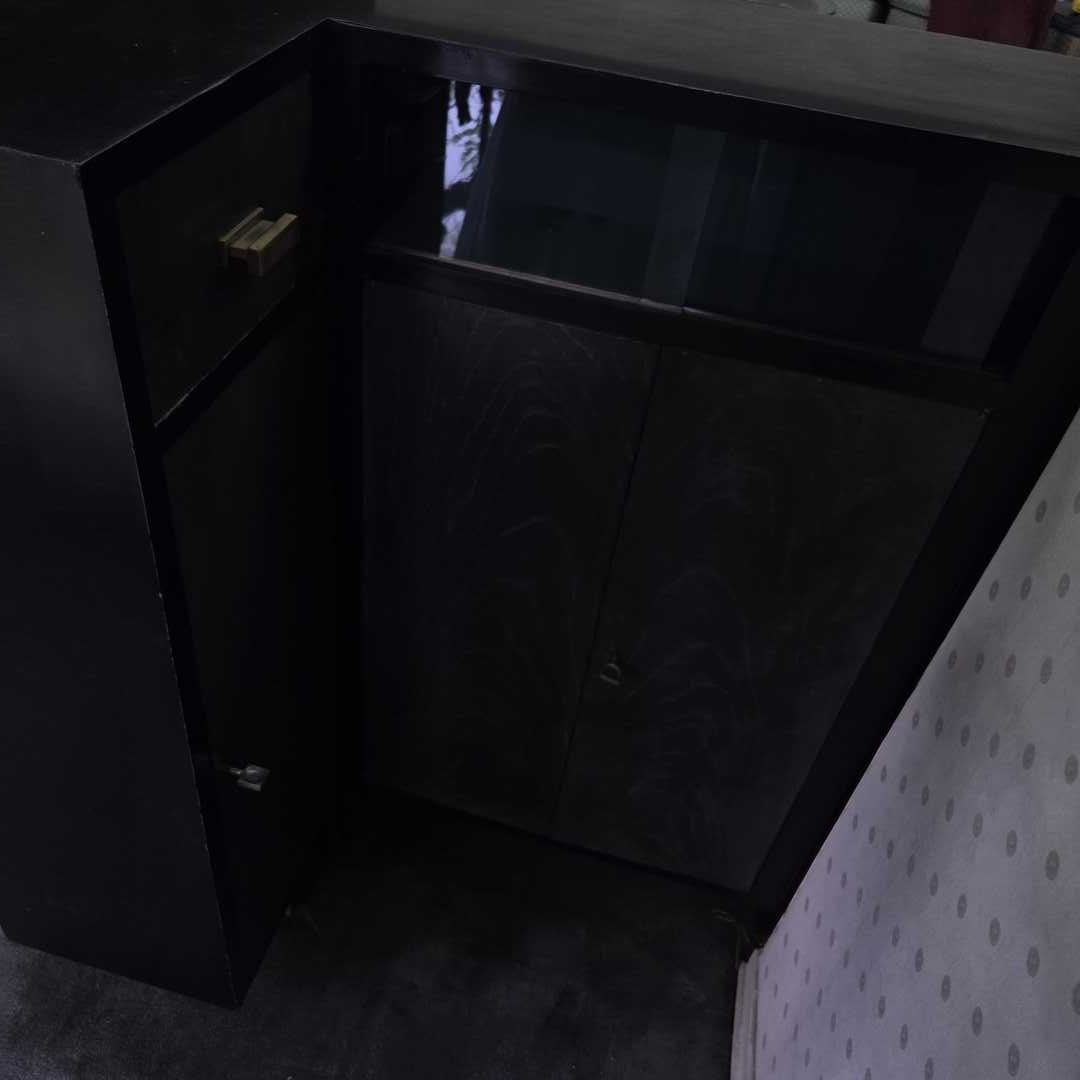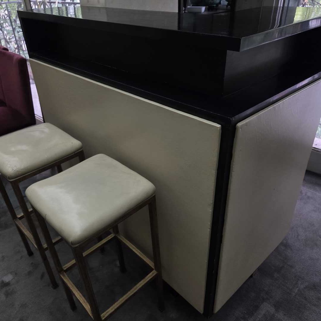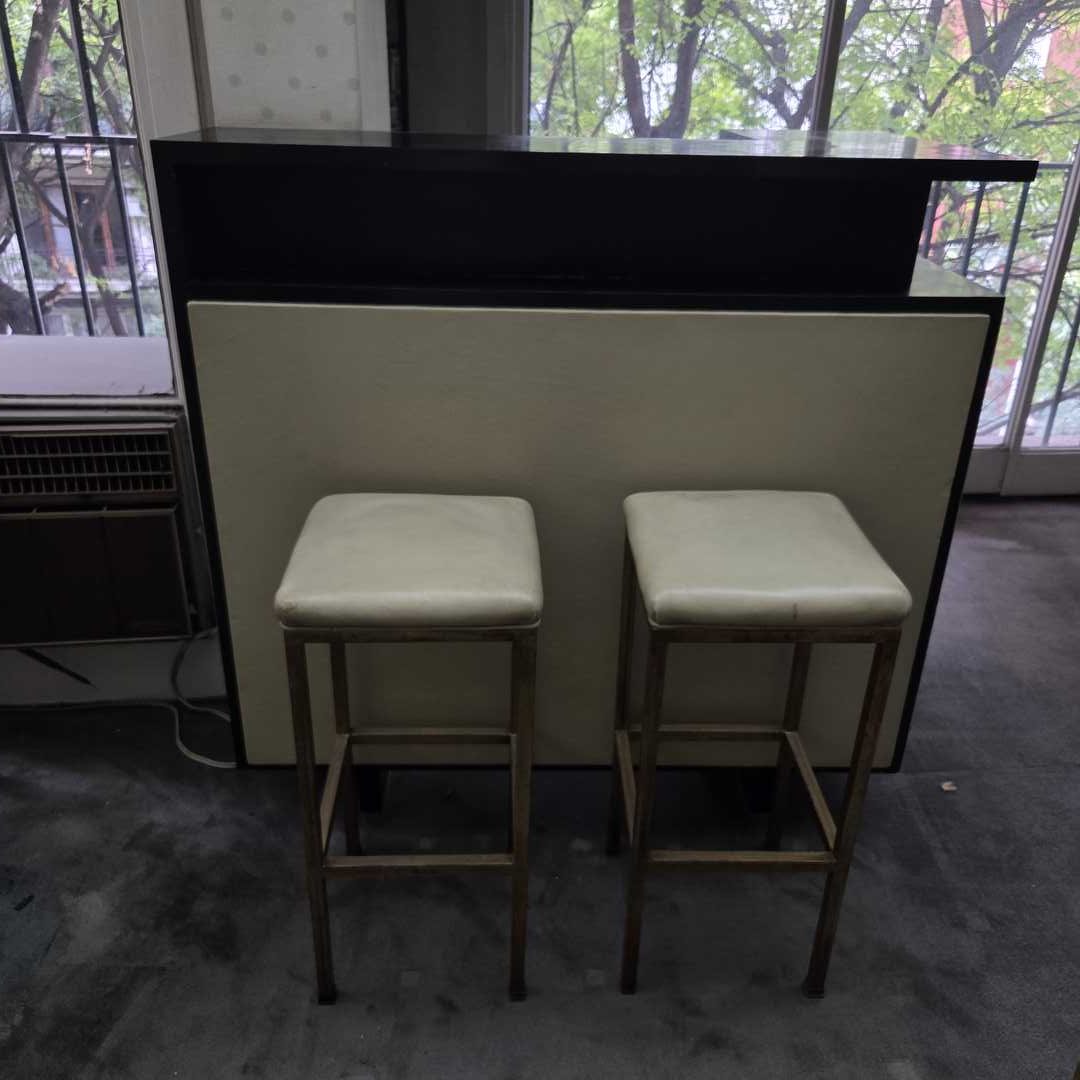 Bar laqueado en L con puertas y estantes + 2 banquetas laqueadas patinadas. Medidas bar: frente 115. Prof total 62 cm. Prof mueble 30 cm. Alt 116 cm.