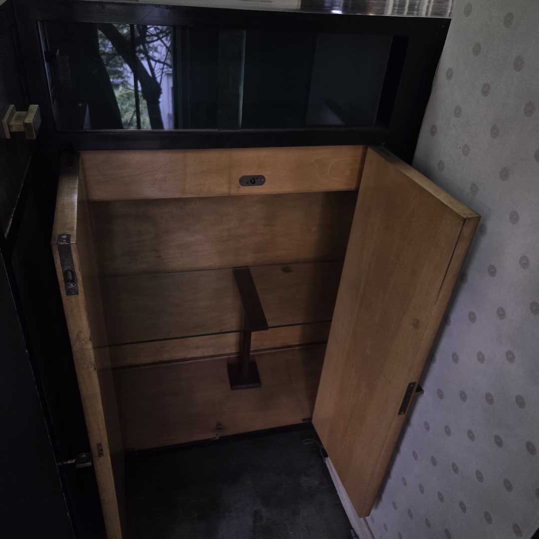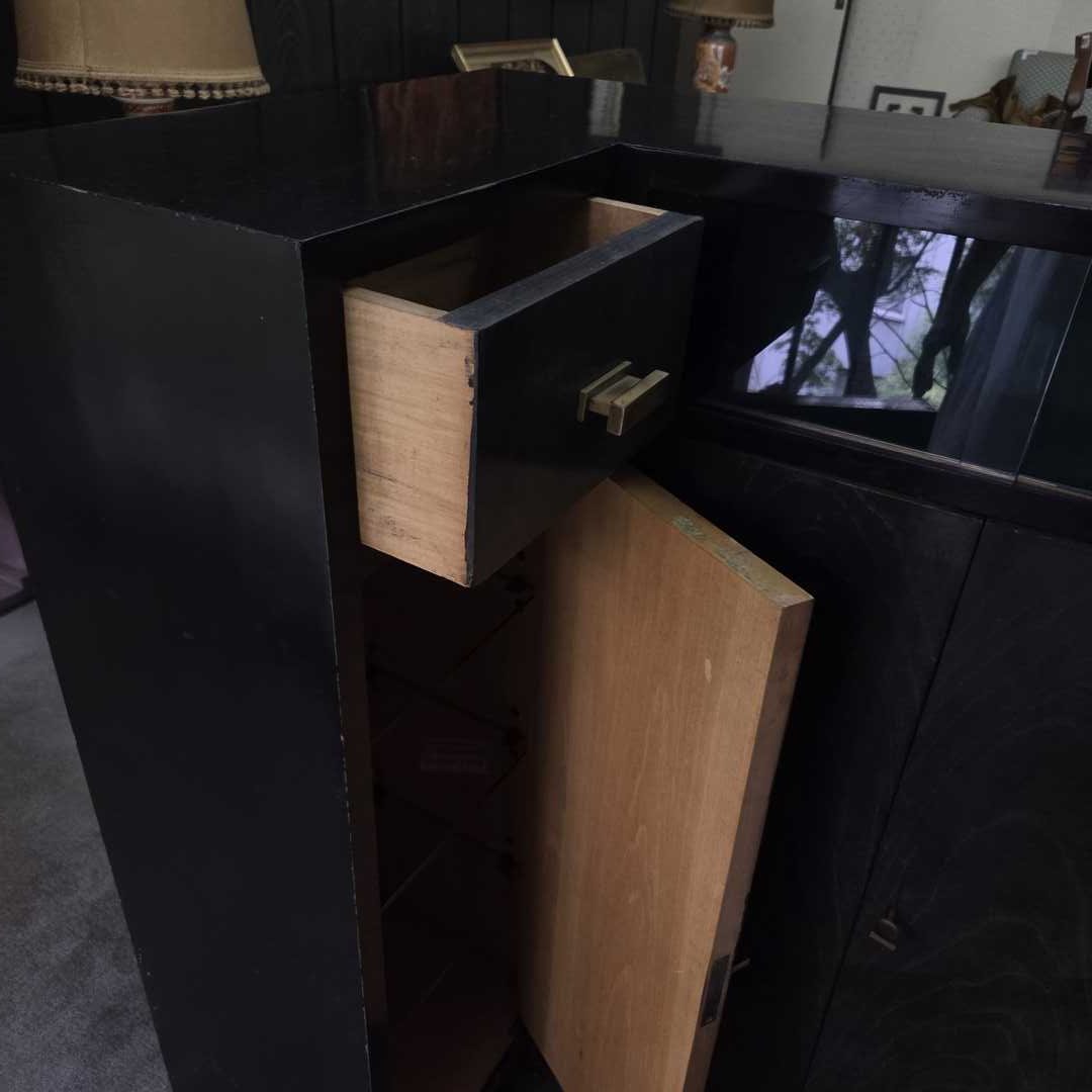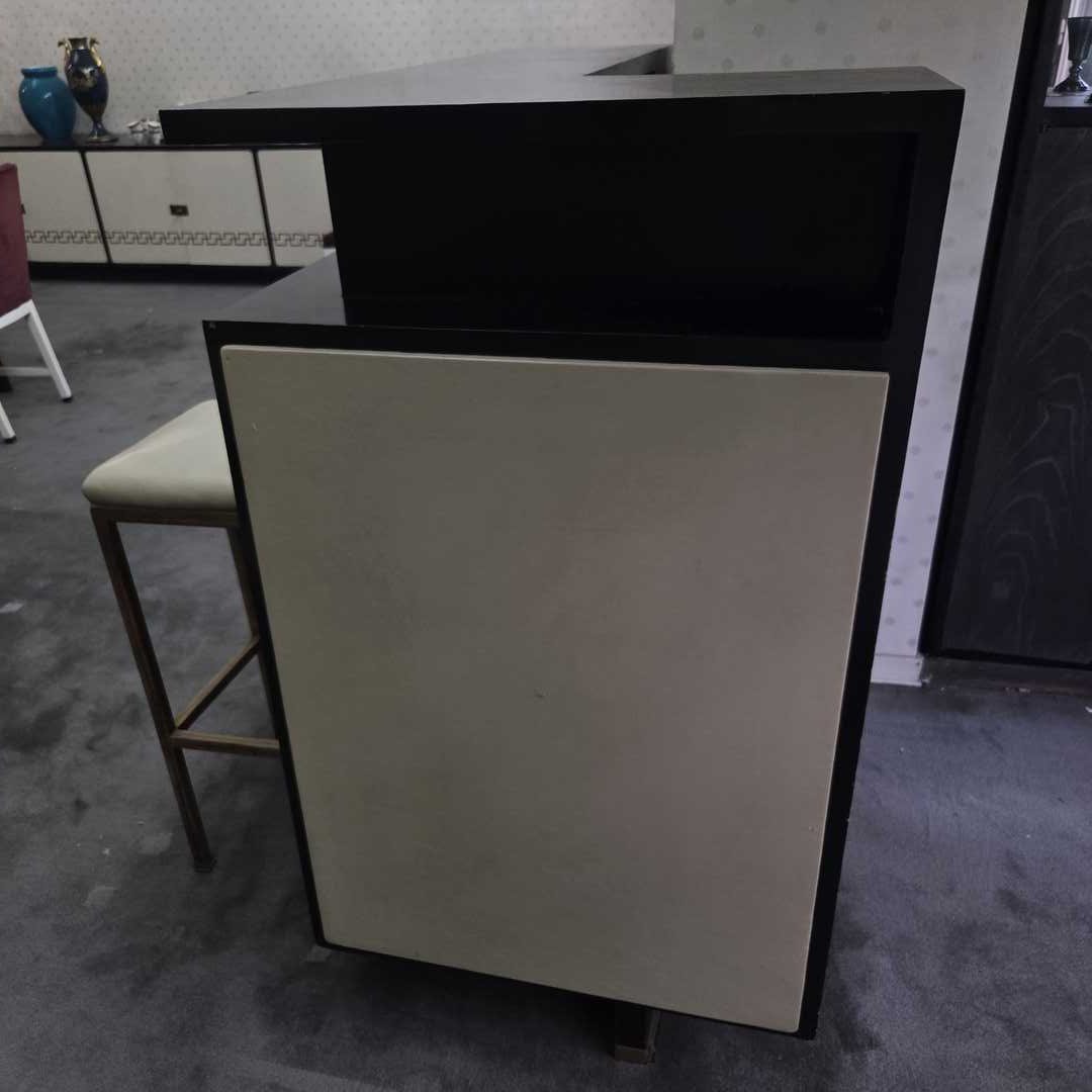Bar laqueado en L con puertas y estantes + 2 banquetas laqueadas patinadas. Medidas bar: frente 115. Prof total 62 cm. Prof mueble 30 cm. Alt 116 cm.