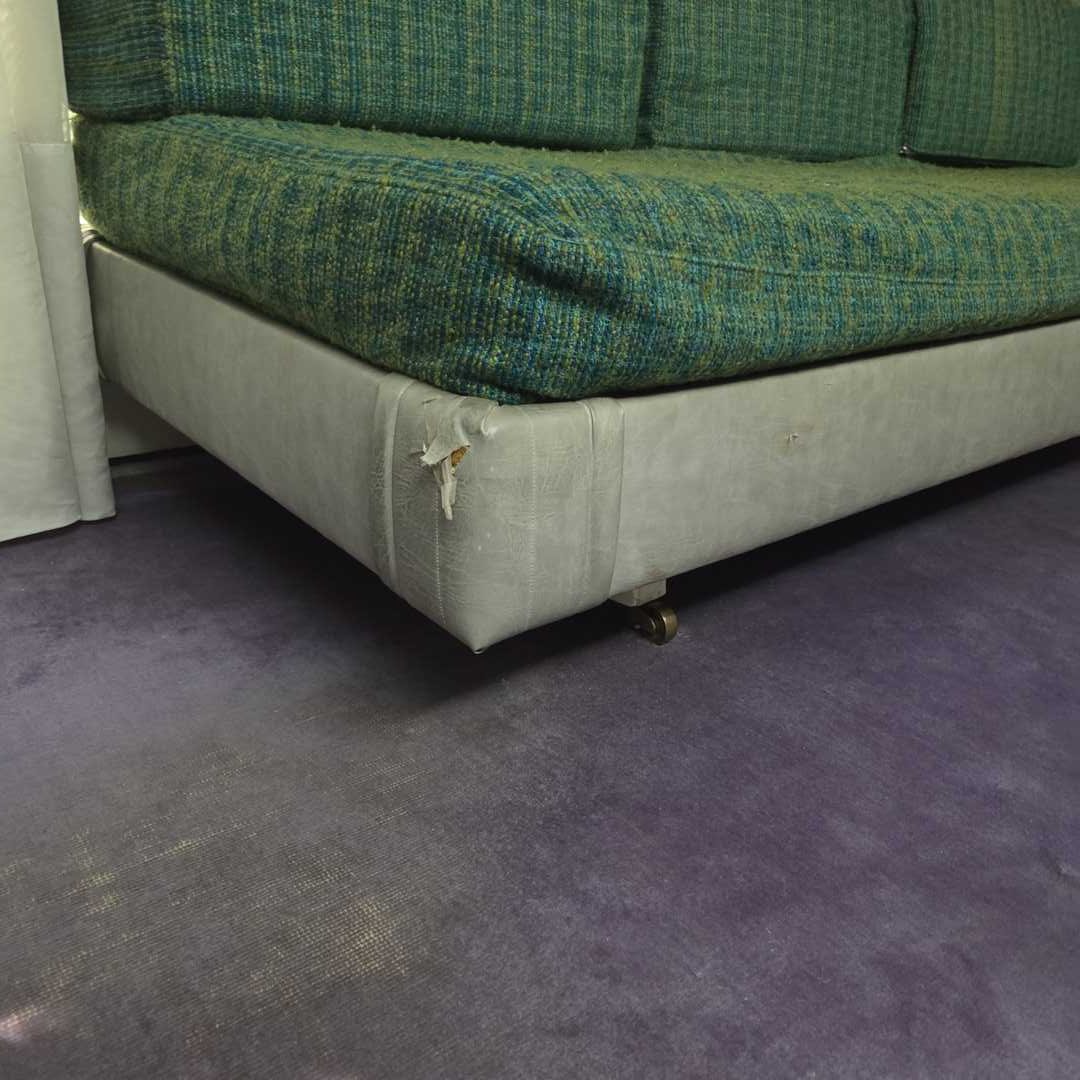 Cama tipo diván 1 plaza, con ruedas + cochón + almohadones y fundas, con averías (ver fotos). 80 x 190 x 77 cm.