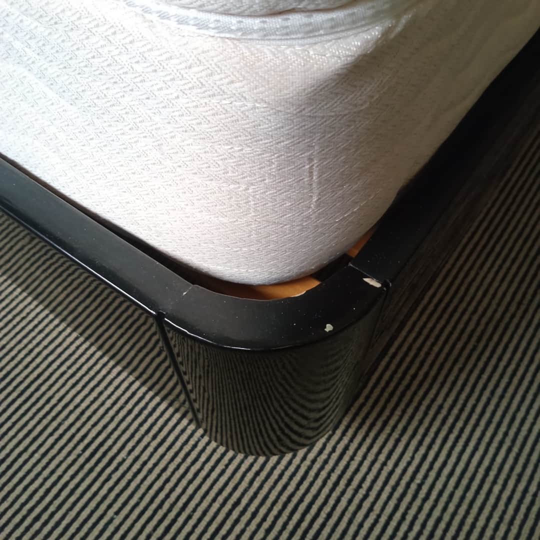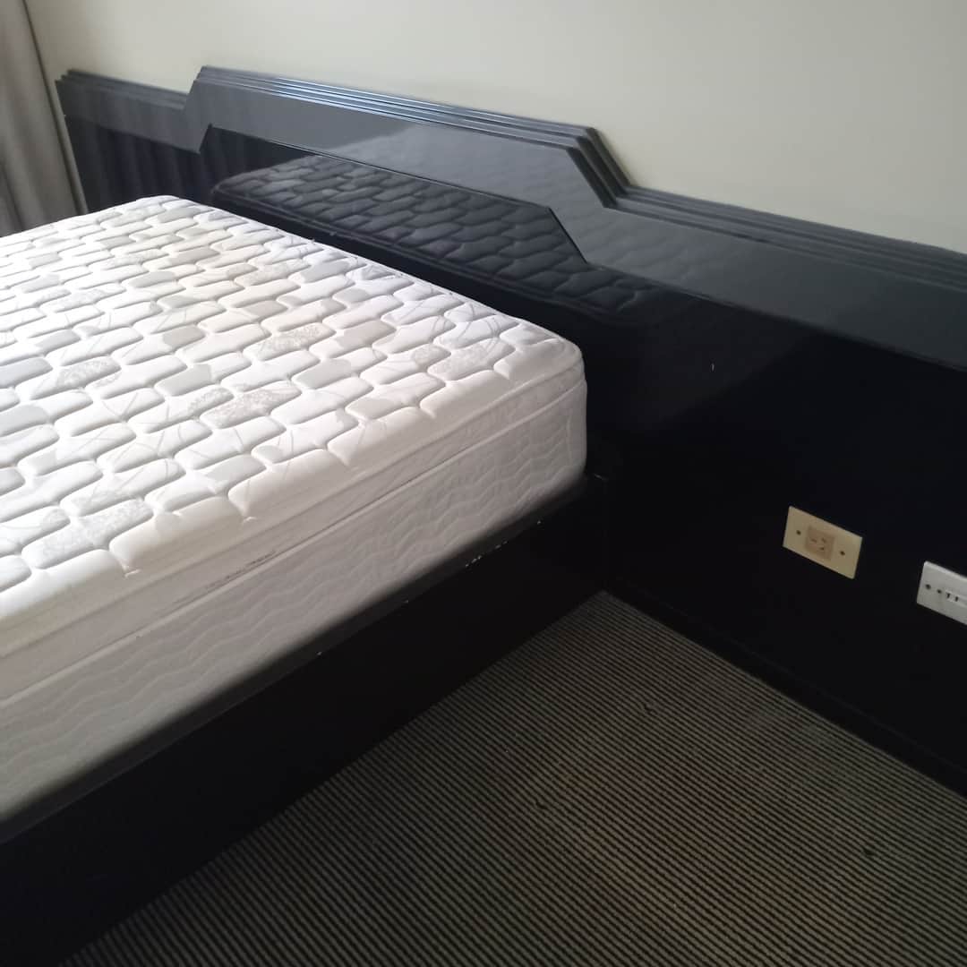 Cama de 2 plazas combinada en negro y gris con respaldo. Con desgaste (ver fotos) + colchón Inducol Pravia. Respaldo 260 cm de largo. Alto 110 cm. Atención: traer herramientas para desmontar la cabecera).