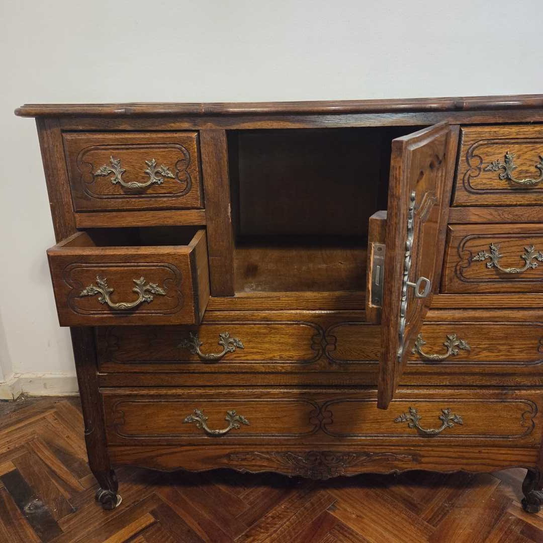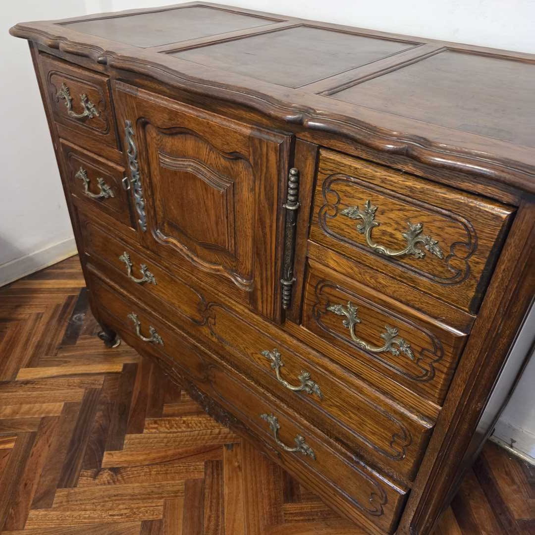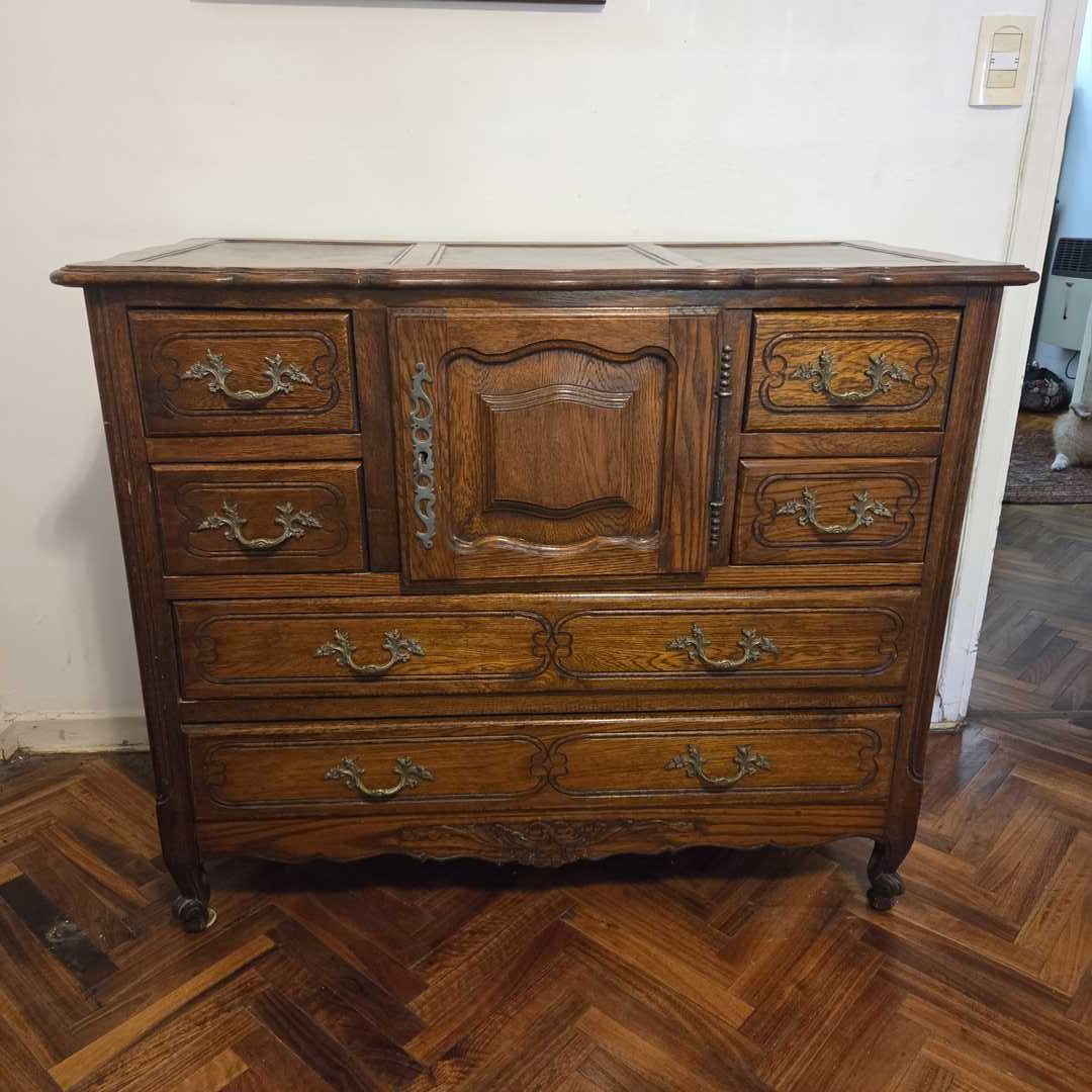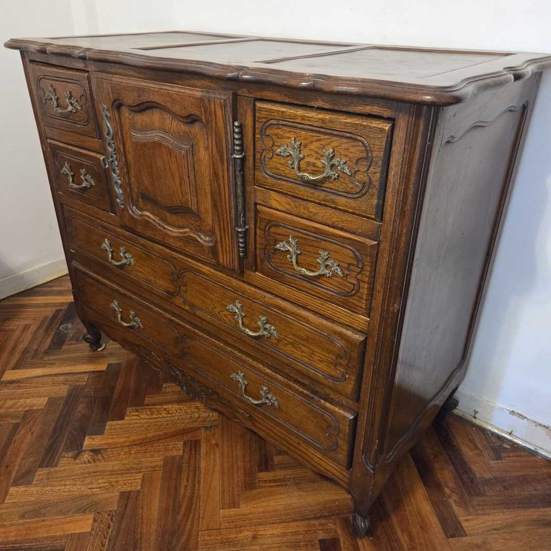 Cómoda estilo provenzal con 6 cajones, 1 puerta con herrajes en bronce. 110 x 53 x 92 cm.
