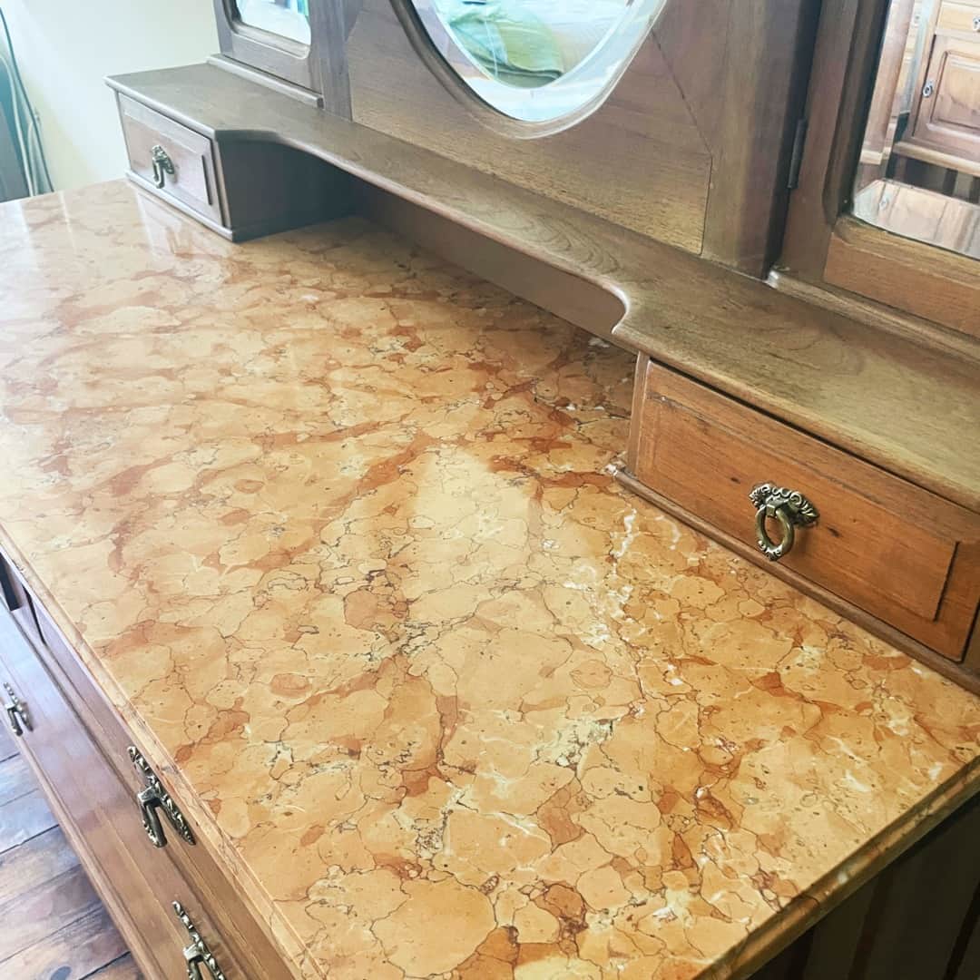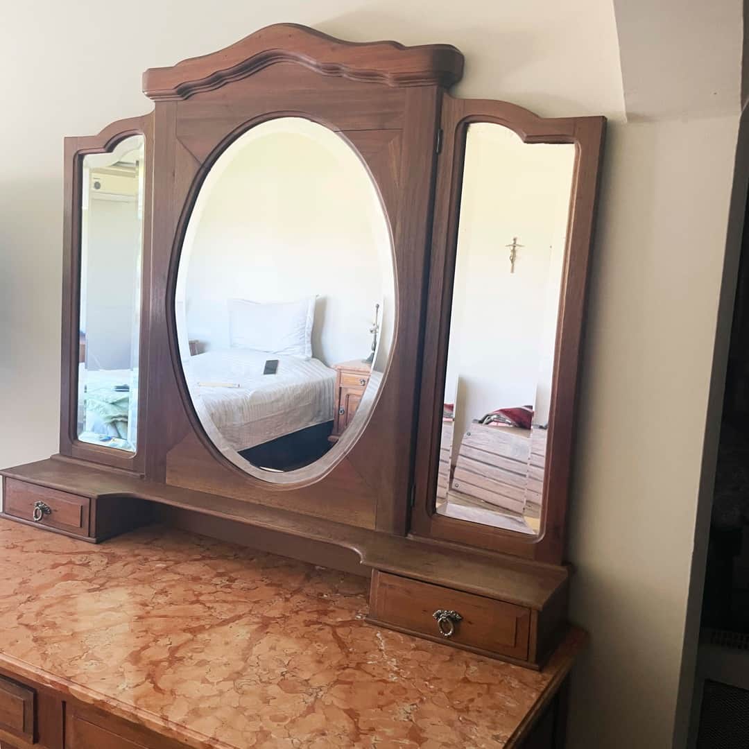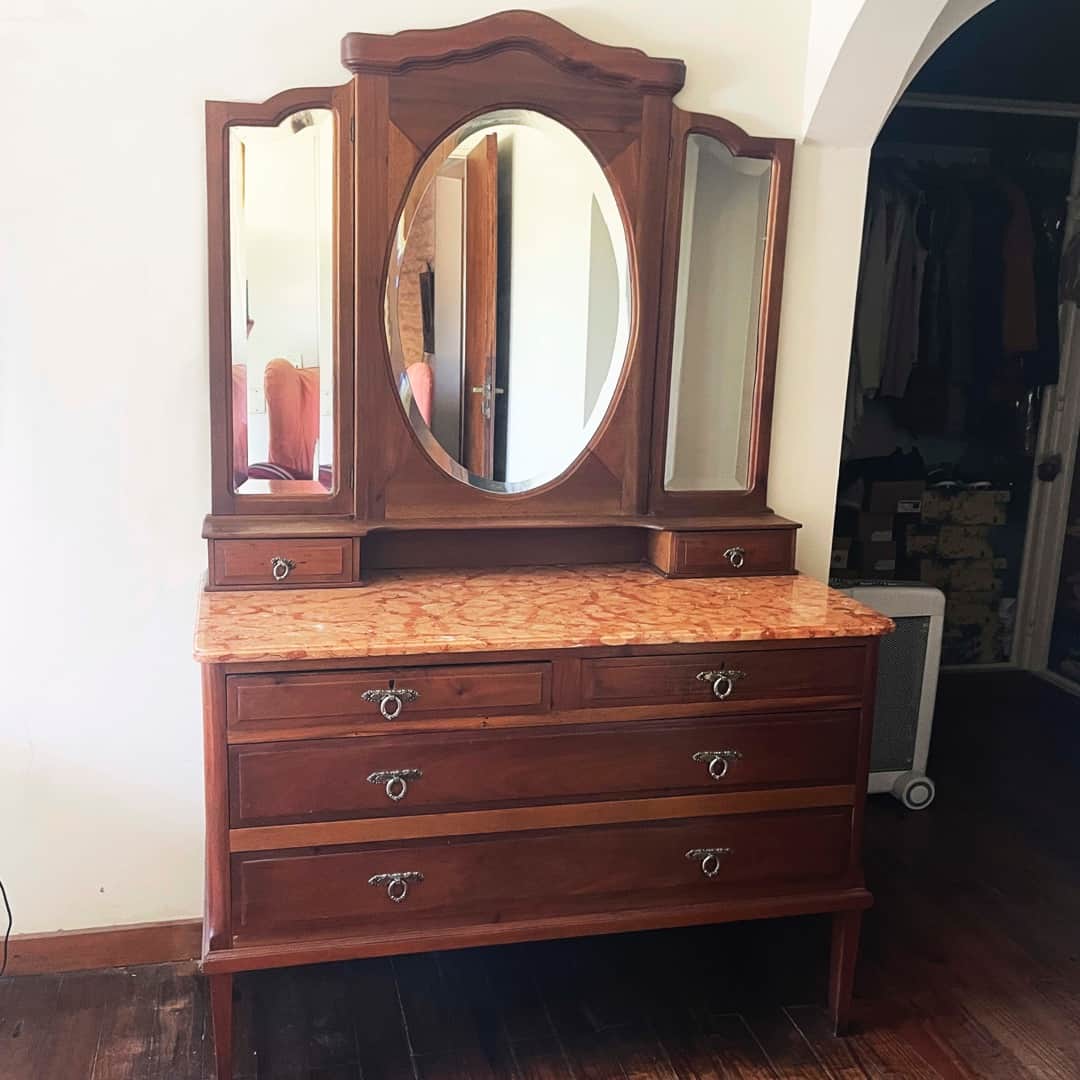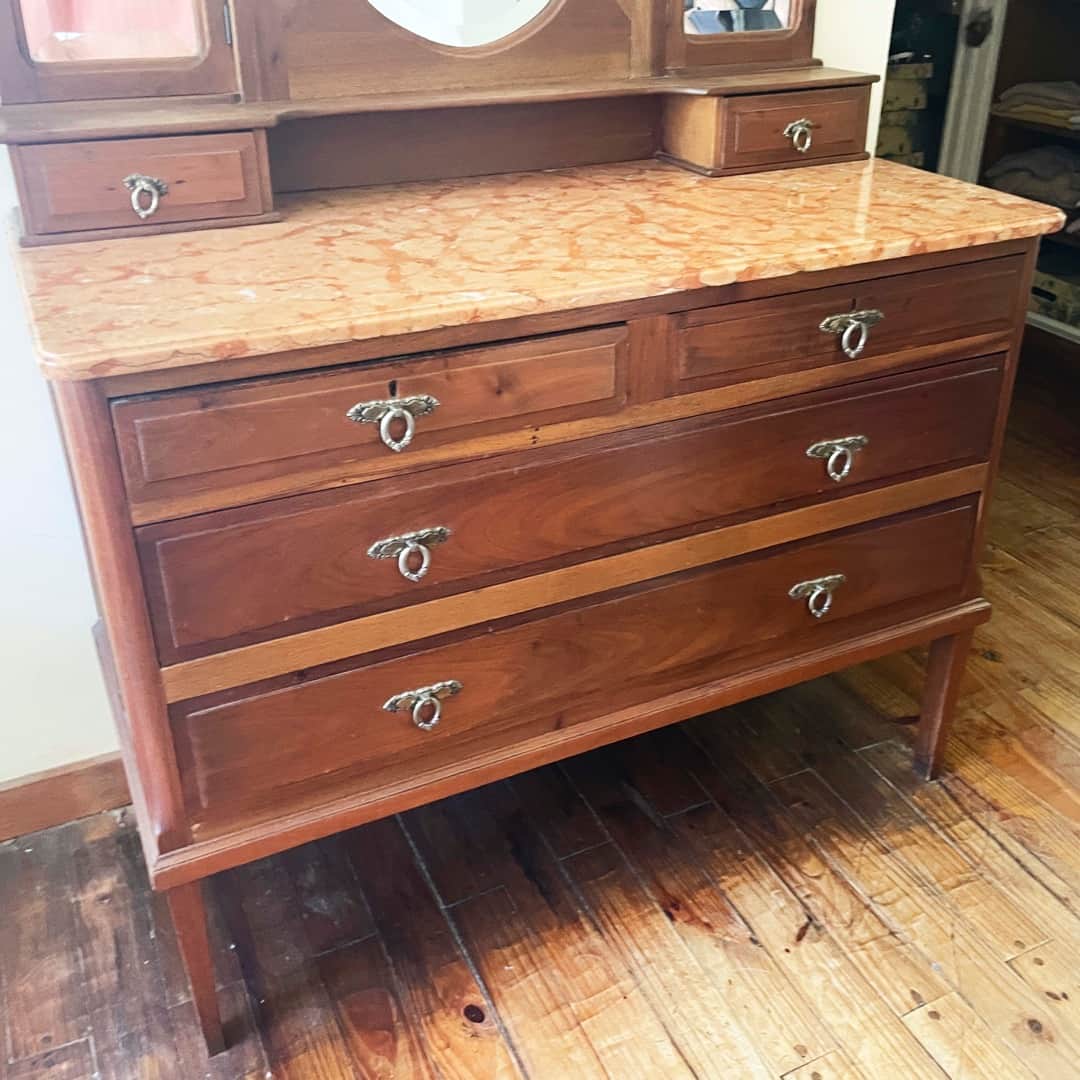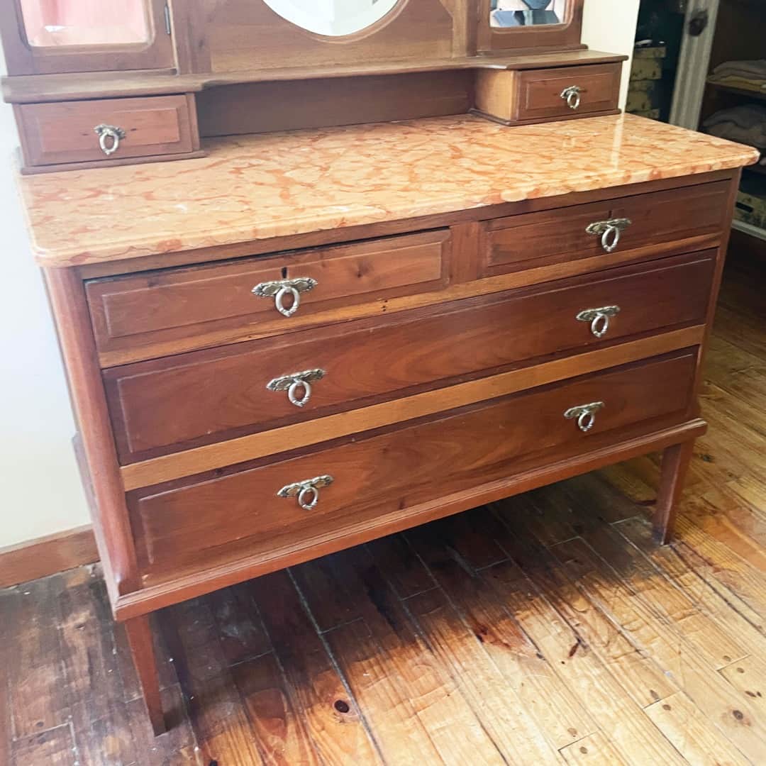Cómoda con tapa de mármol y alzada con espejos biselados en tríptico .Muy buen estado. Largo 113 cm , Profundidad 50 cm , Altura 110 cm ,