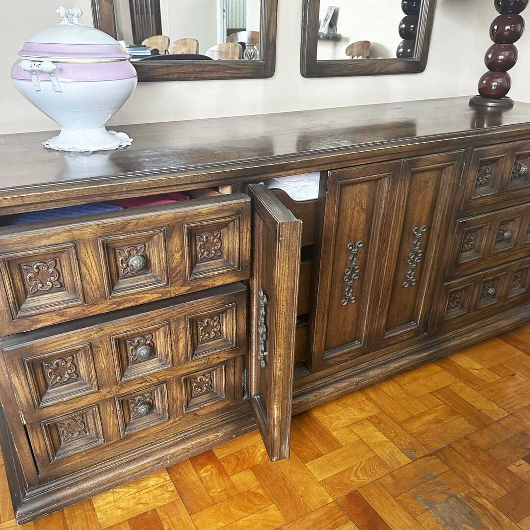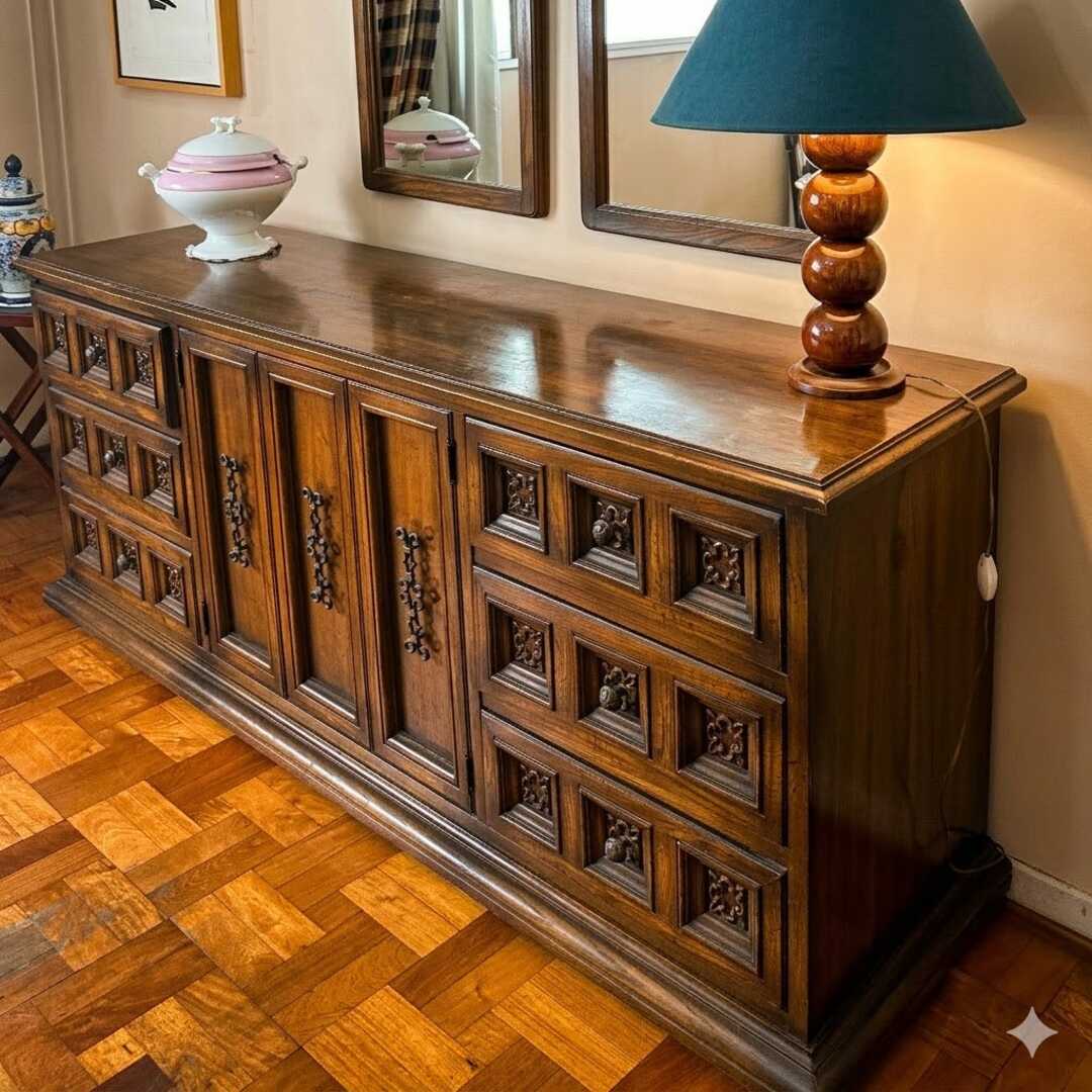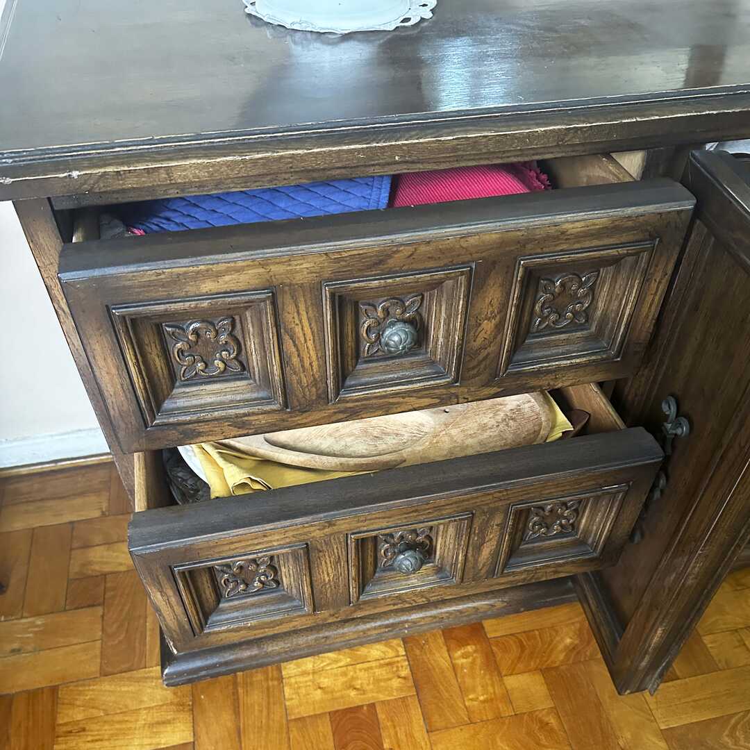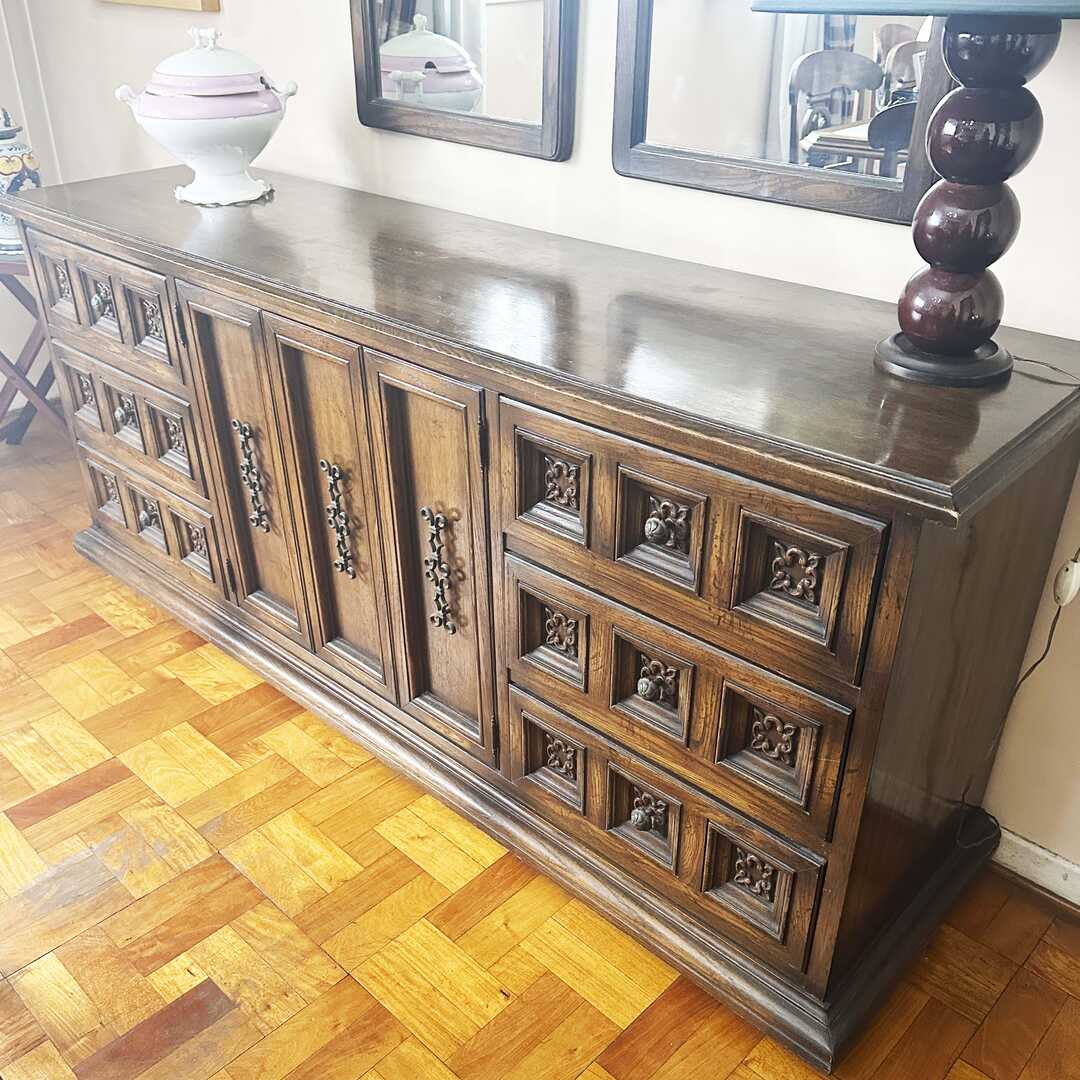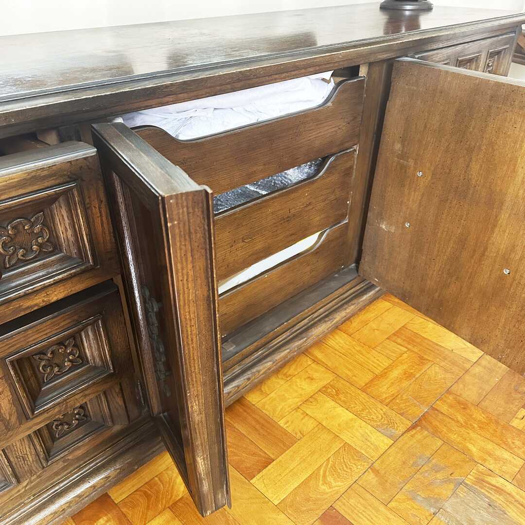 Cómoda estilo neoclásico Toscano en madera maciza de nogal. Tiene 6 cajones, 3 centrales con 2 puertas. Largo 192 cm, Ancho 50 cm, Alto 80 cm. Atención: baja por escalera desde un 6to piso.