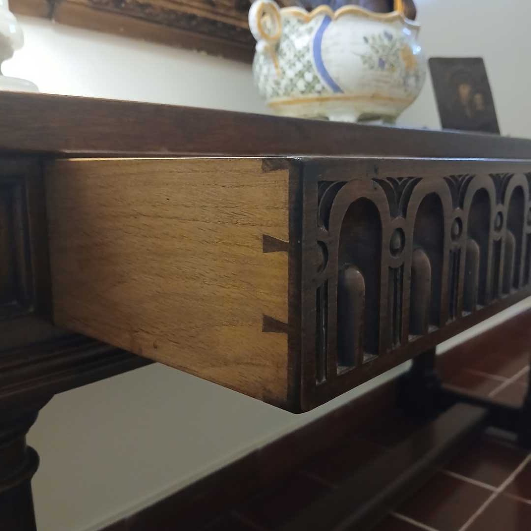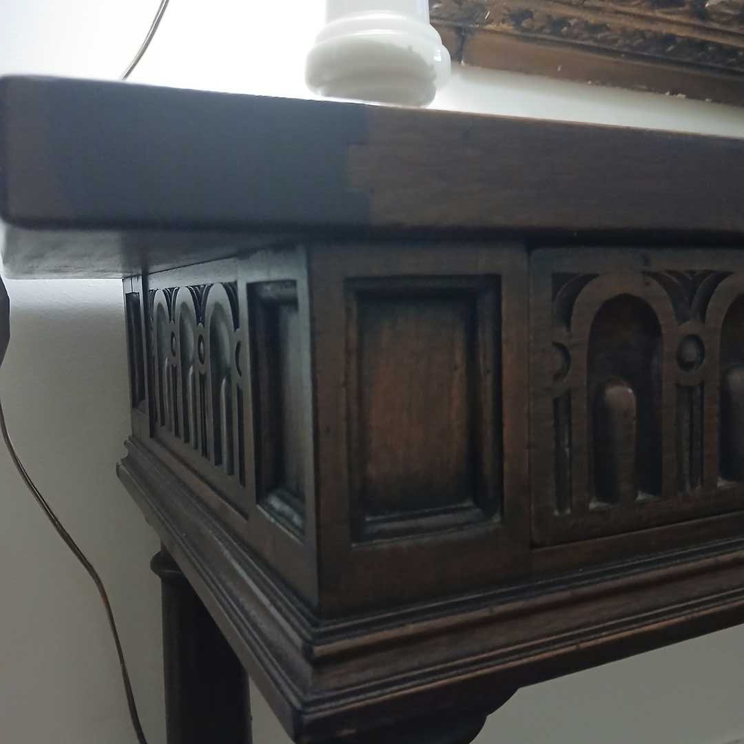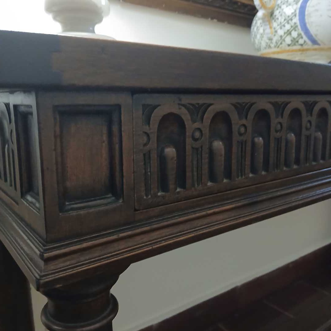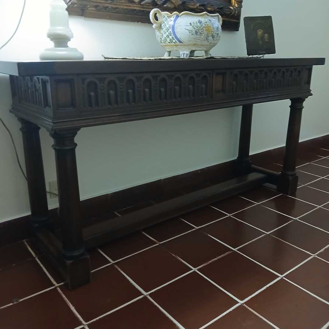 Consola 2 cajones estilo gótico en madera lustrada 40 x 141 x 68 cm alto.