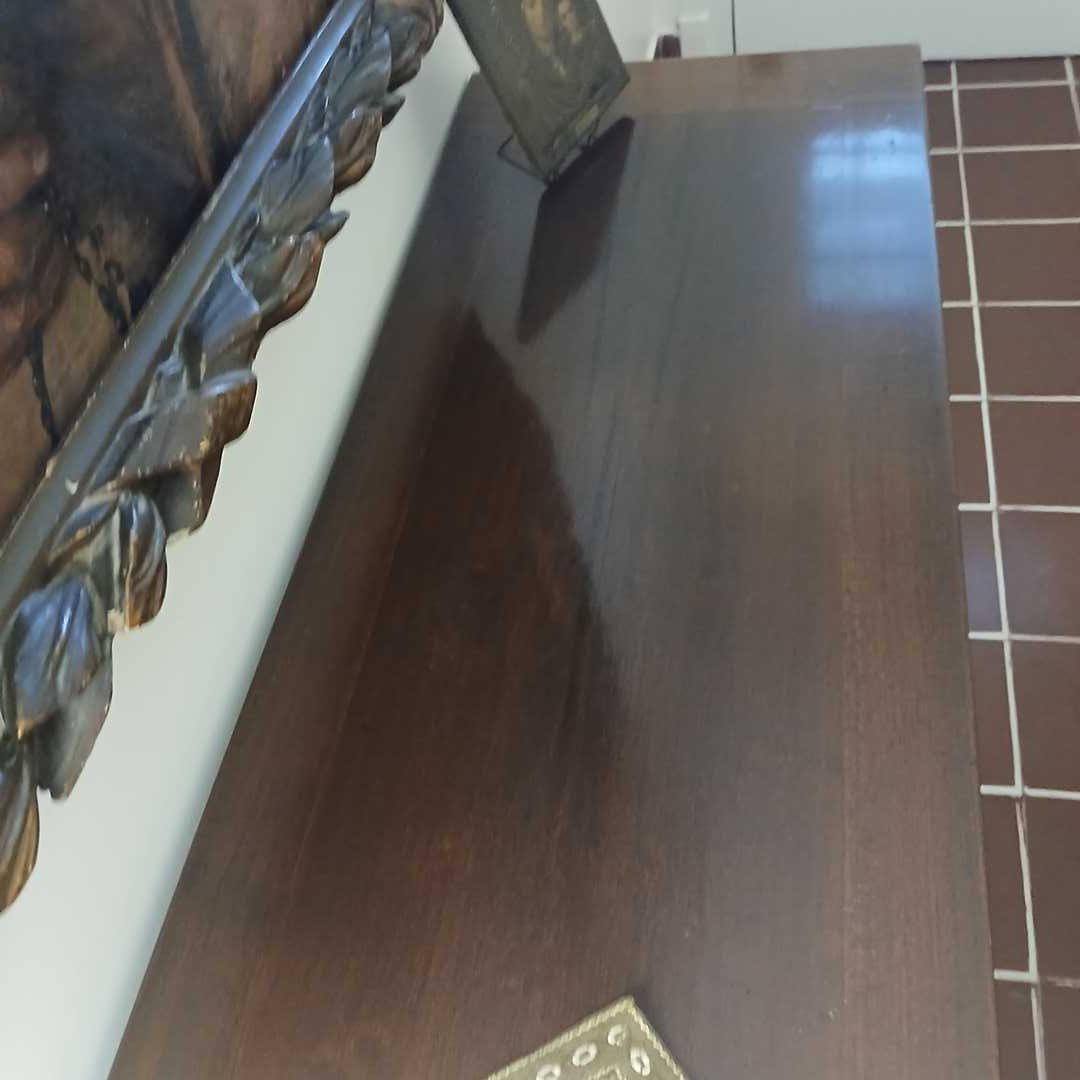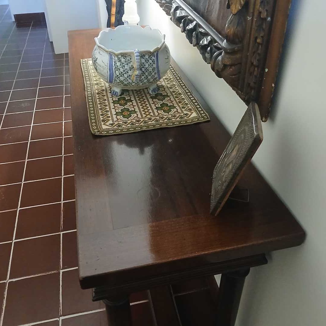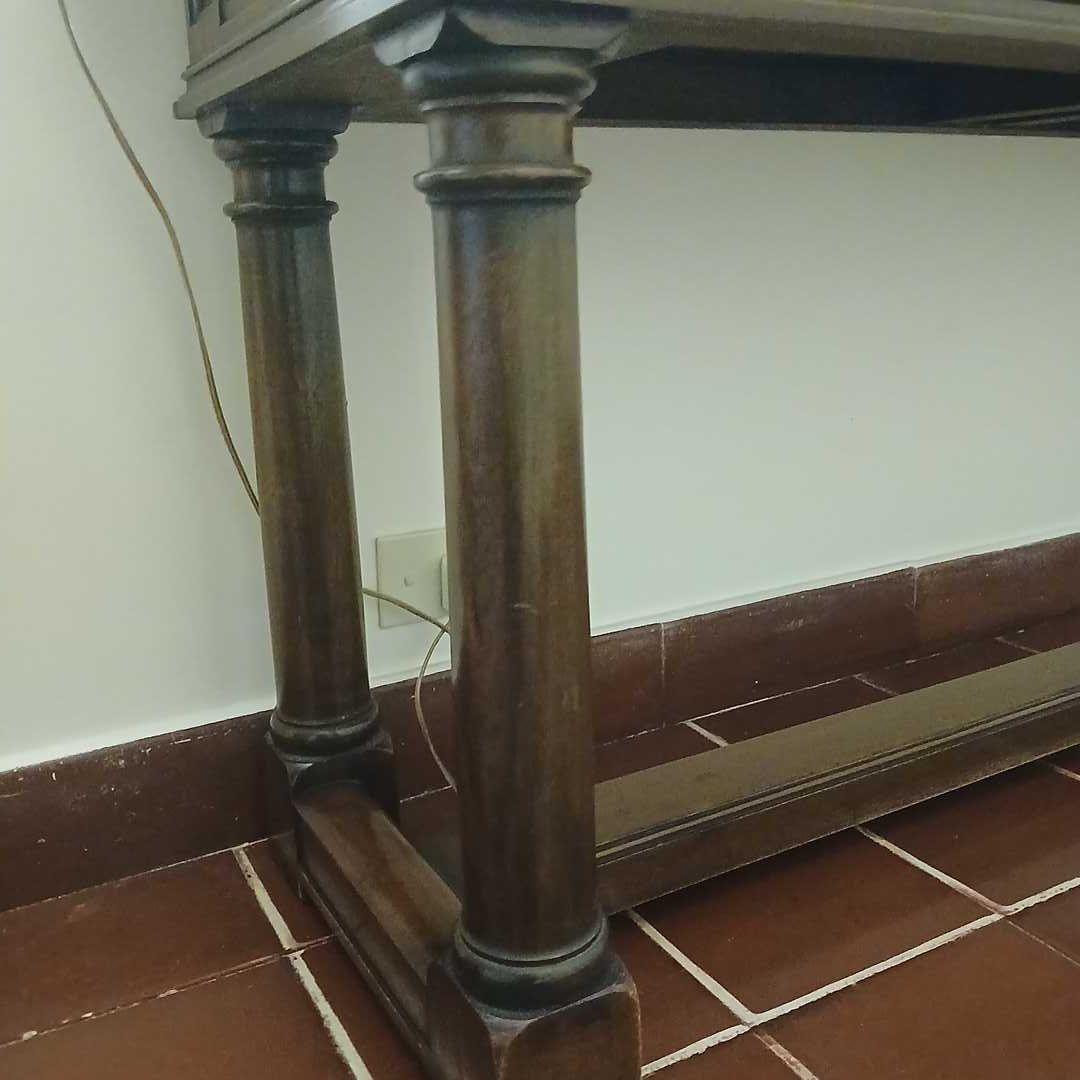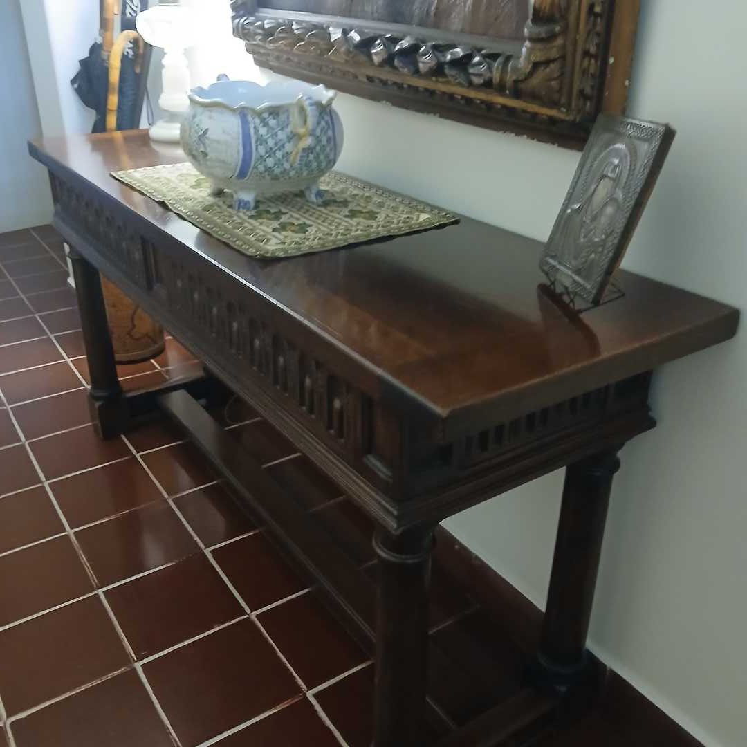 Consola 2 cajones estilo gótico en madera lustrada 40 x 141 x 68 cm alto.