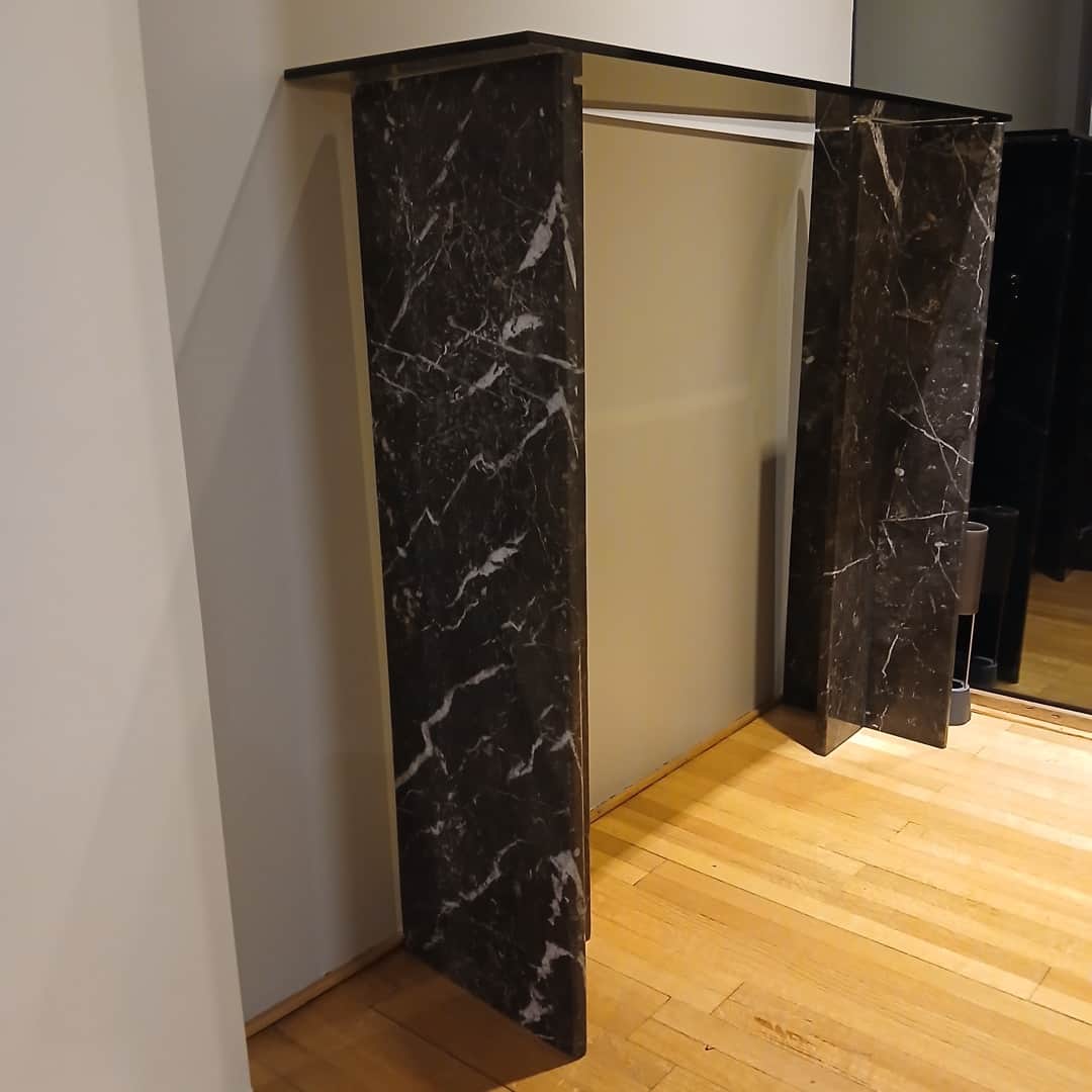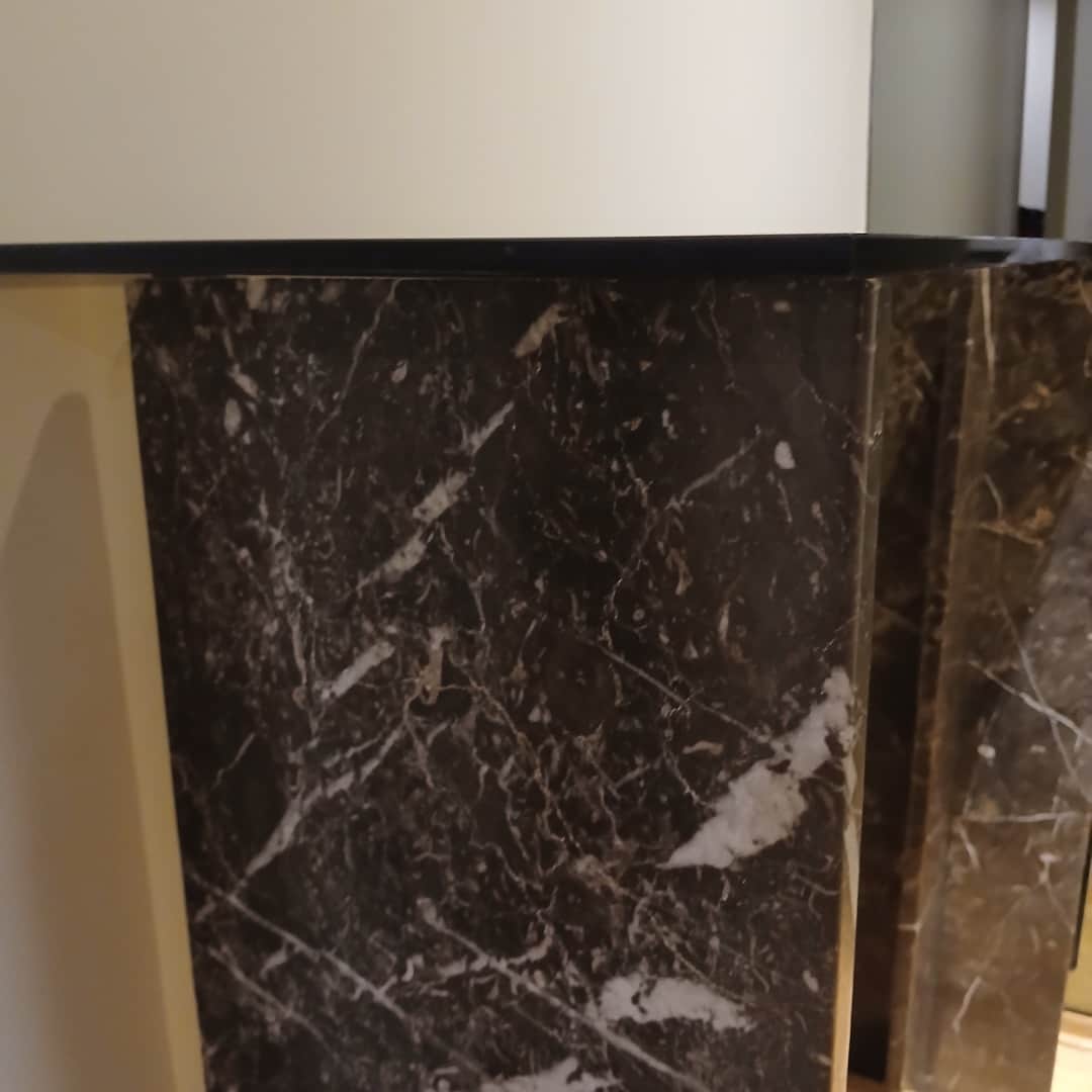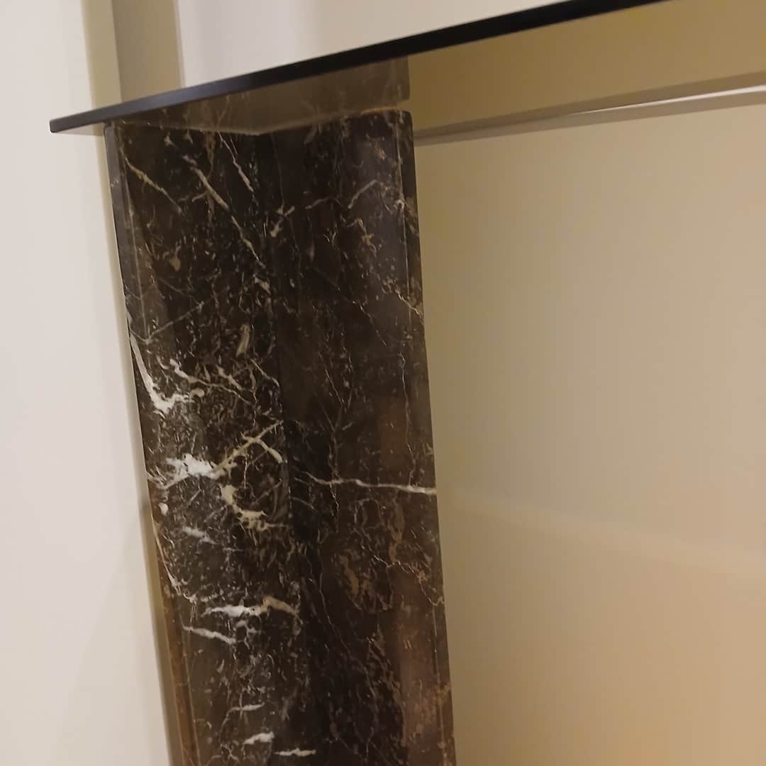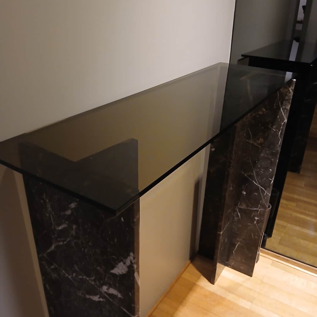 Consola de diseño con 2 columnas en mármol y tapa vítrea fumé de 4mm de espesor. 108 x 32 x 100 cm.