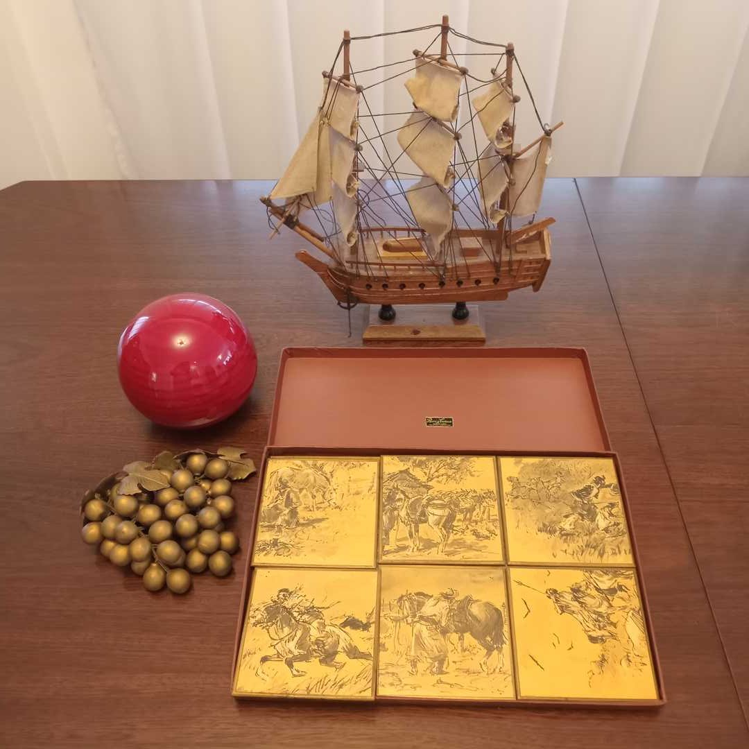 Maqueta antigua embarcación, posa vasos gauchescos Casa Rossi y Caruso, 2 racimos e uvas en plástico dorado, 1 esfera decorativa bordó en cerámica. Altura maqueta 32 cm, ancho 28 cm.