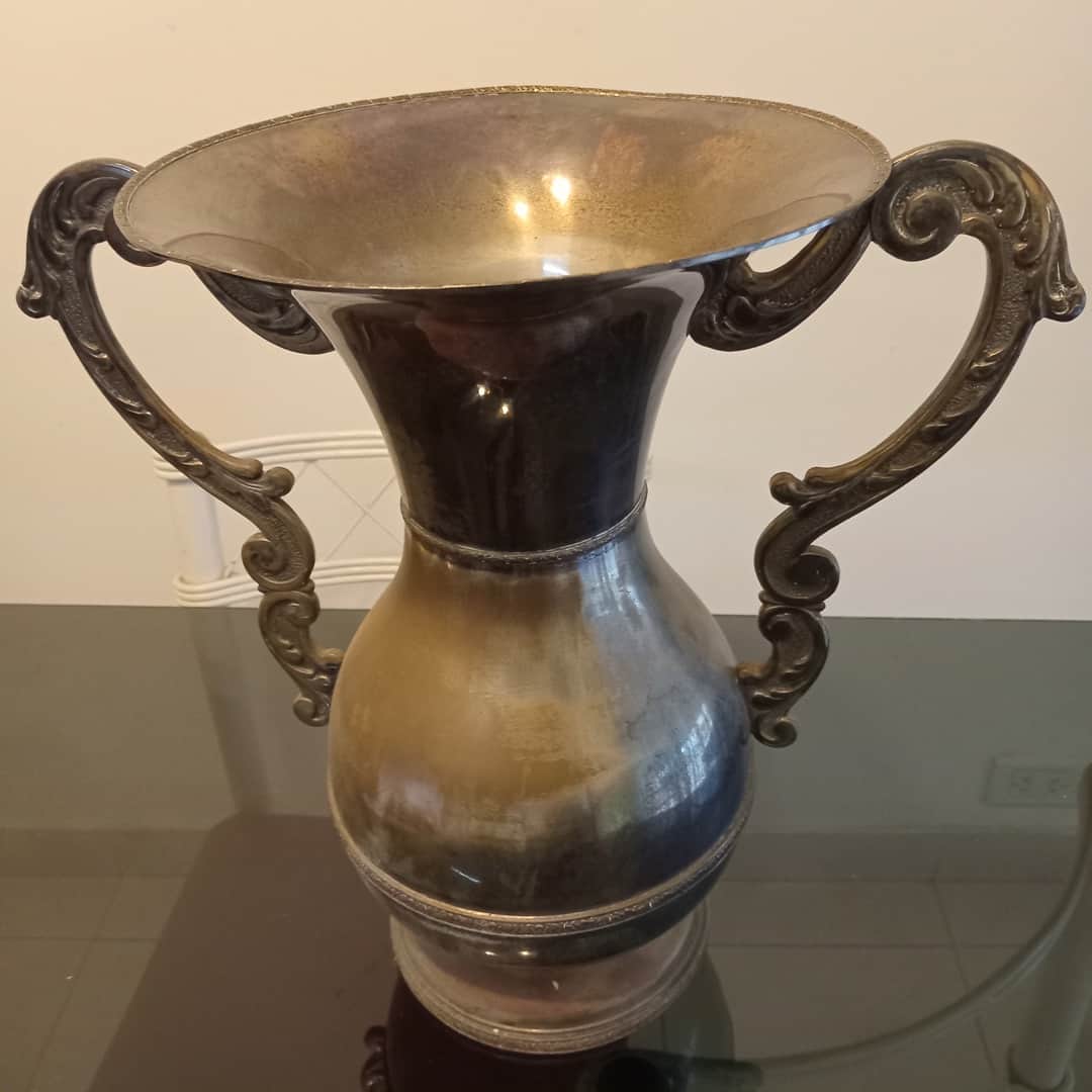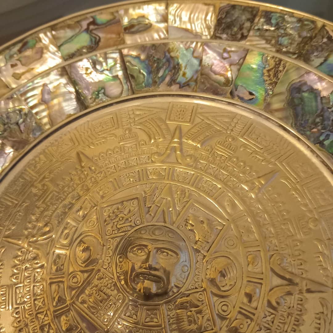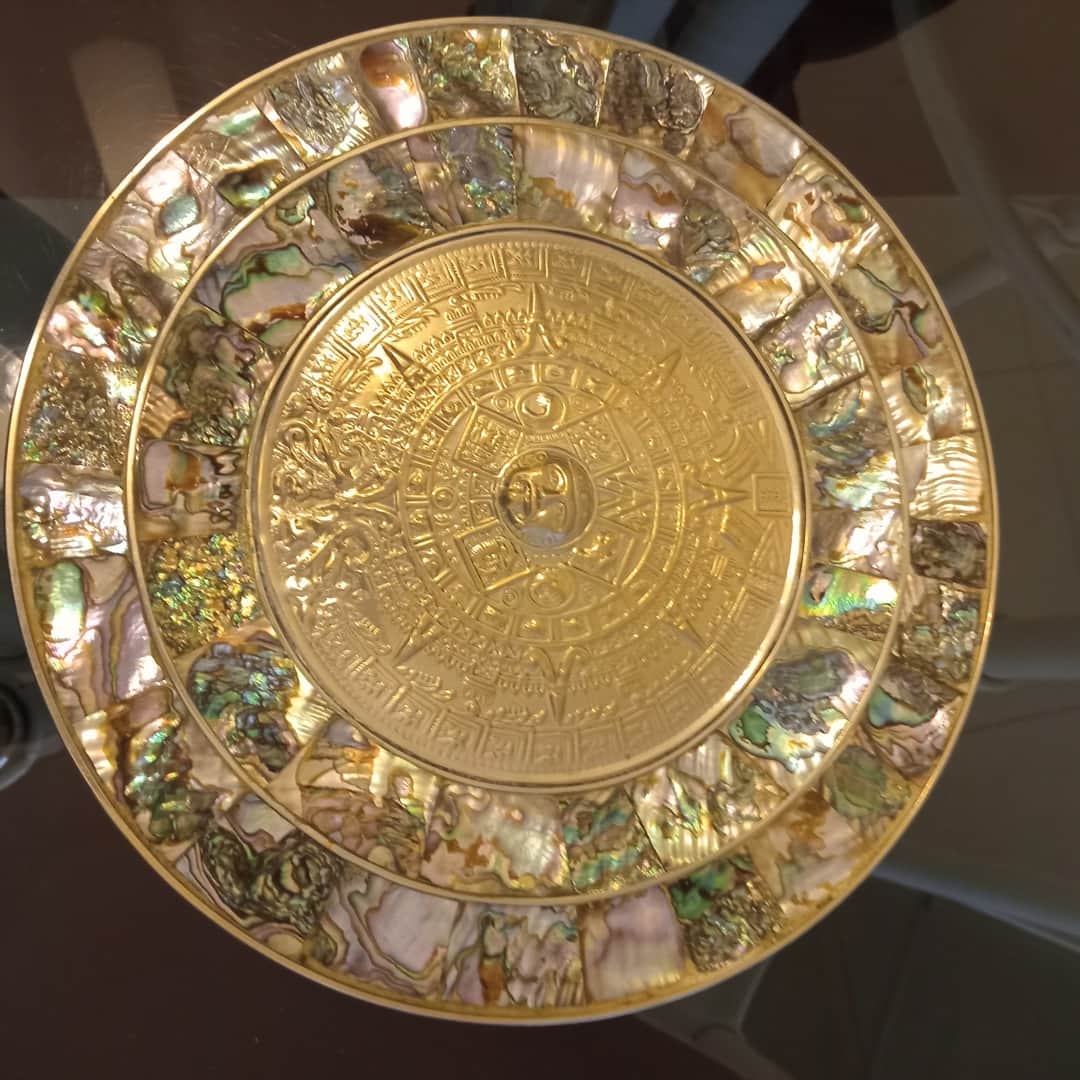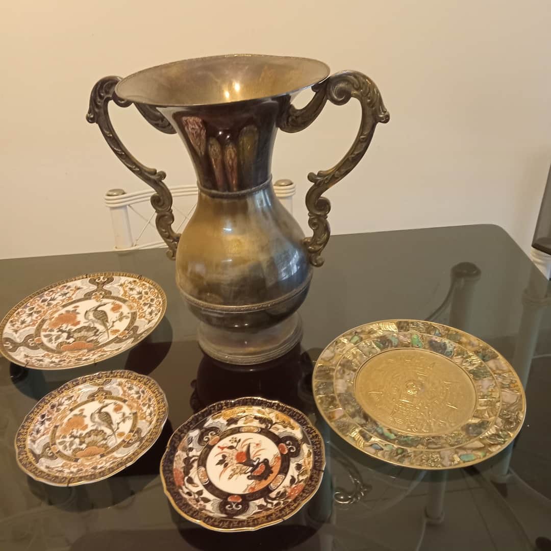 Platos decorativos + jarrón con 2 asas en metal. Alt 40 cm + calendario azteca 28 cm diám