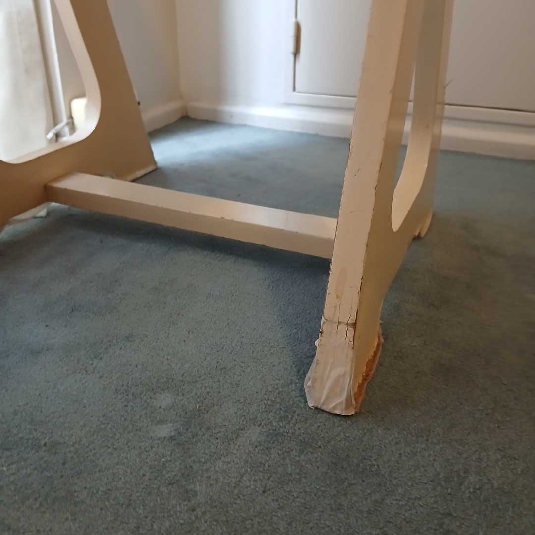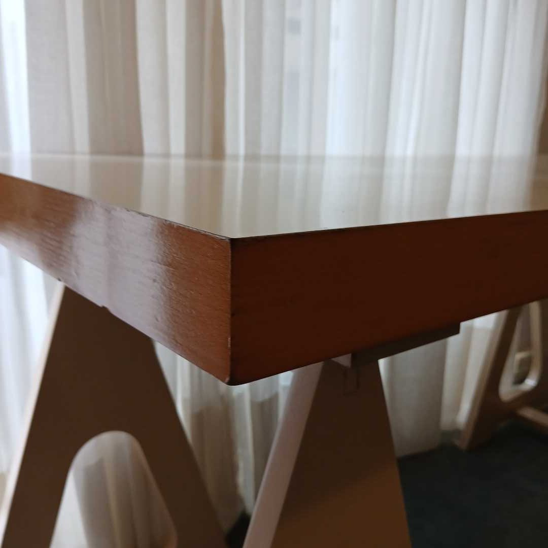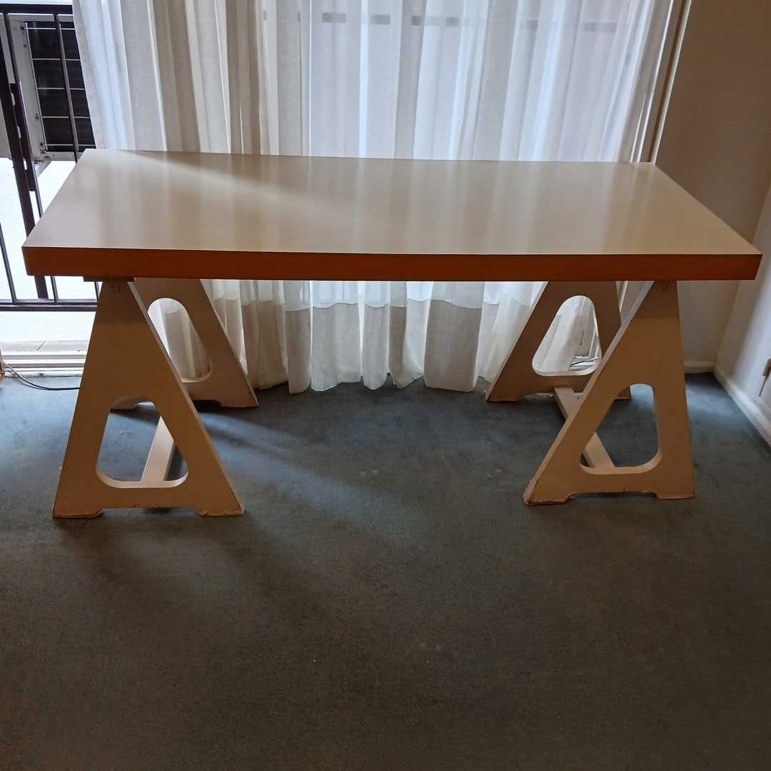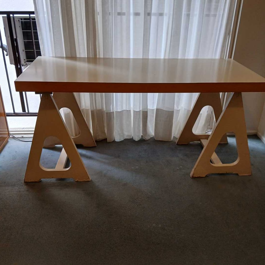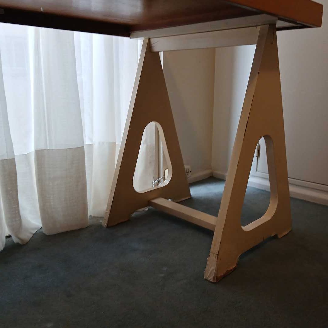 Escritorio de diseño con caballetes. Con detalles en caballetes. Tapa 145 x 60. Alt 72 cm