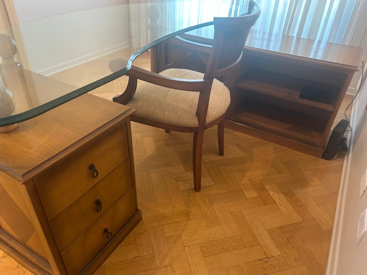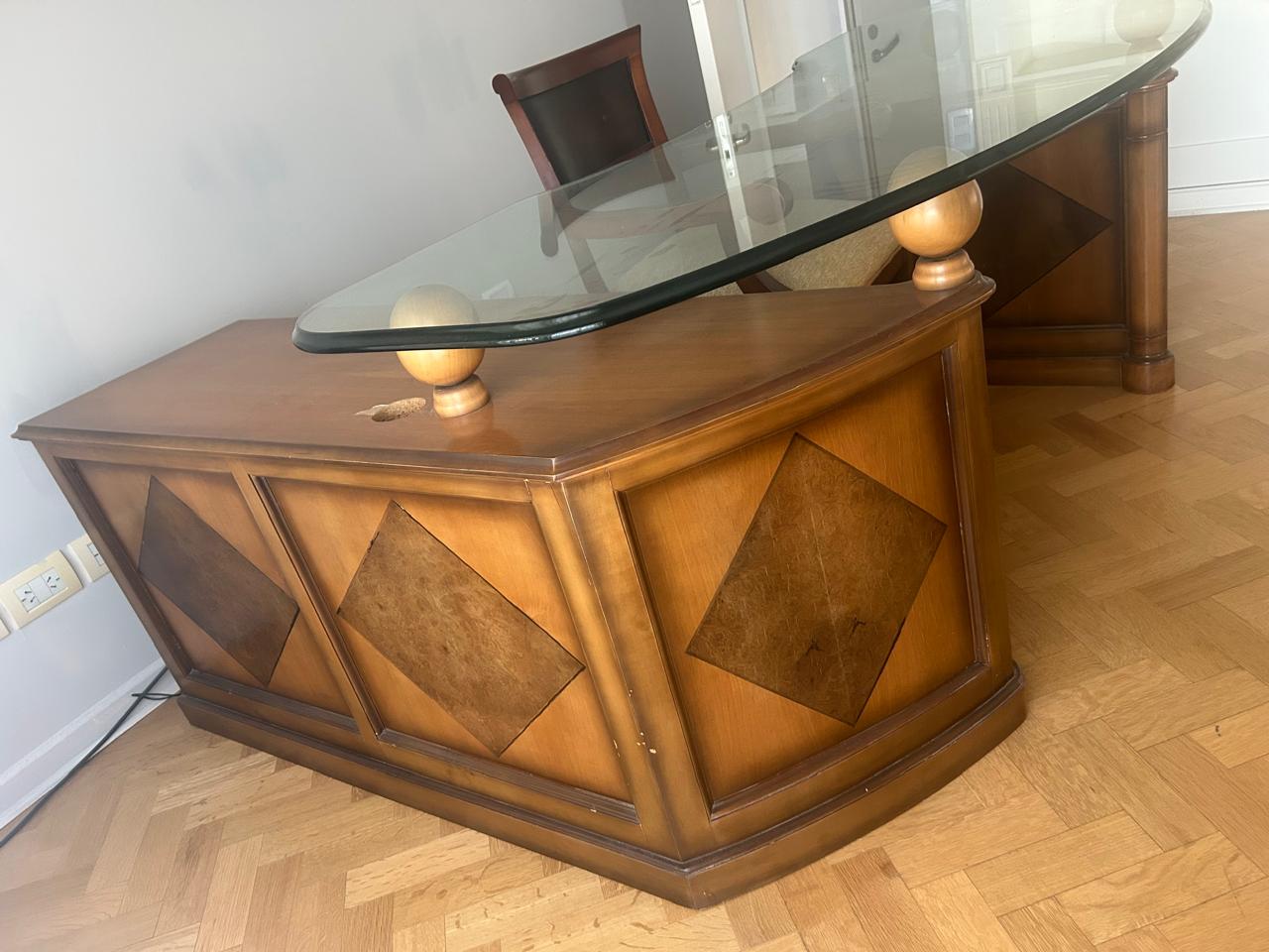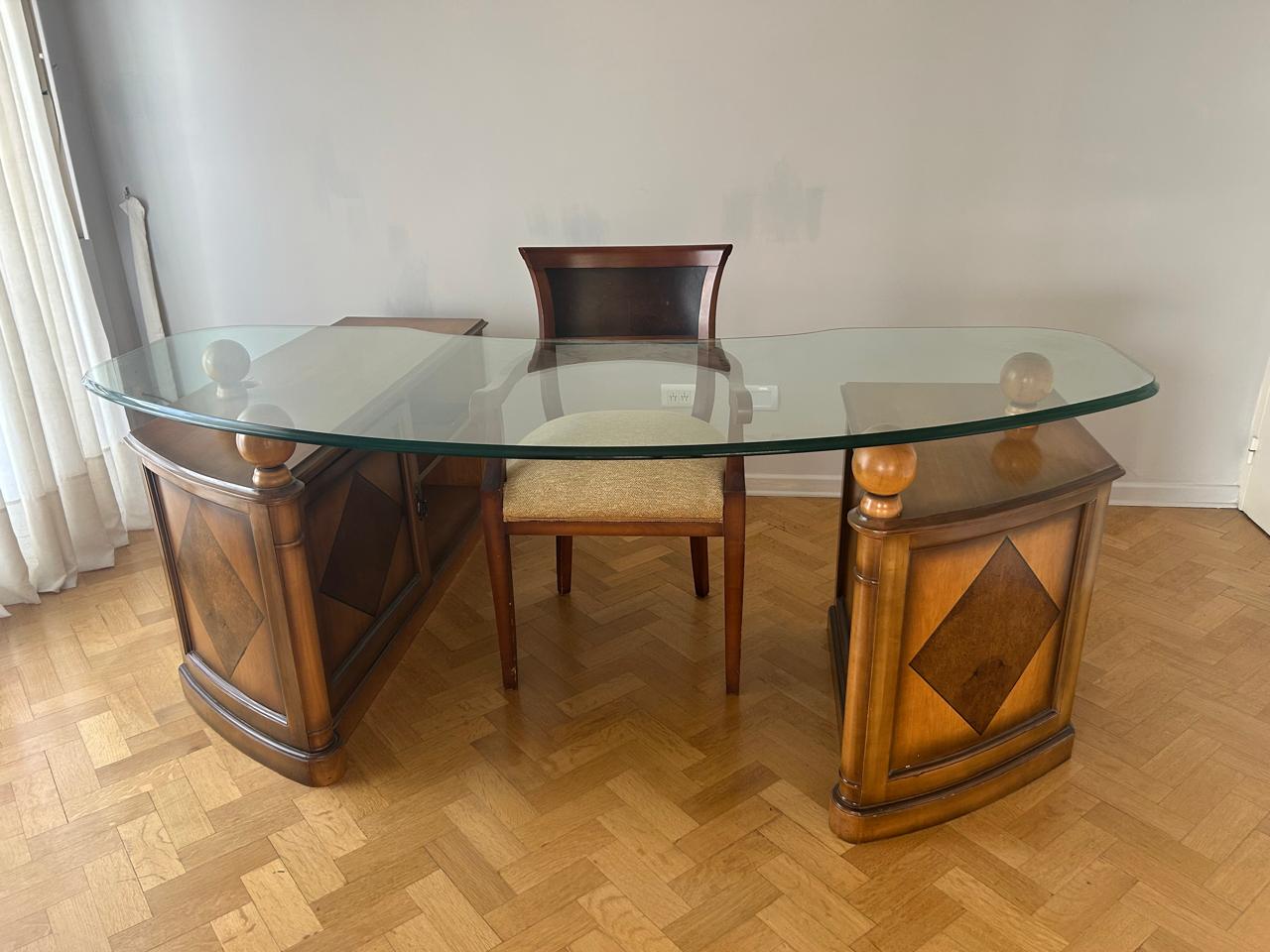 Escritorio con doble base en madera con cajones y estantes y tapa en cristal triple. Con agujero pasa cables en una de las bases. 200 x 70 cm aprox. + Silloncito. Todo de Fontenla.