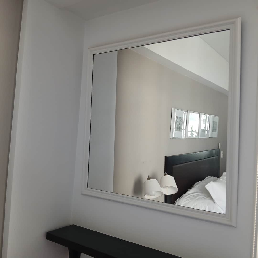 Espejo biselado con marco en madera patinado de blanco. 89 x 103 cm.