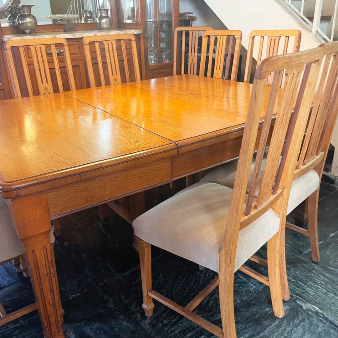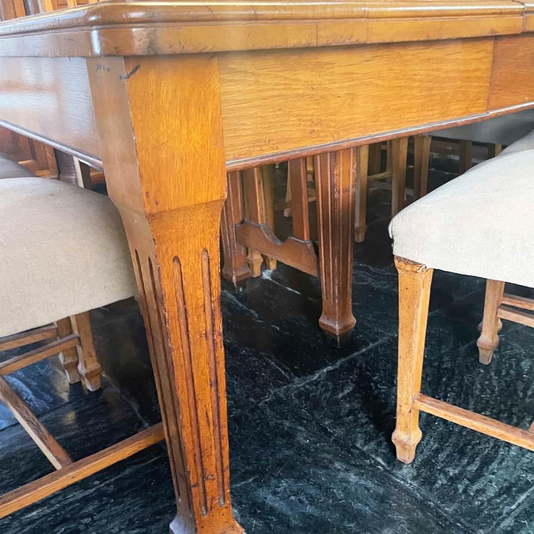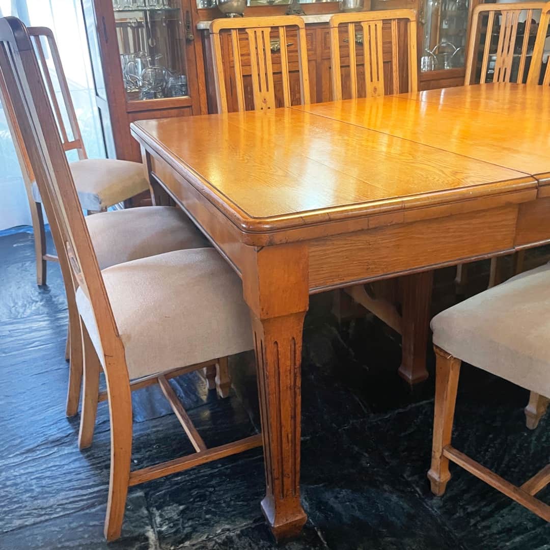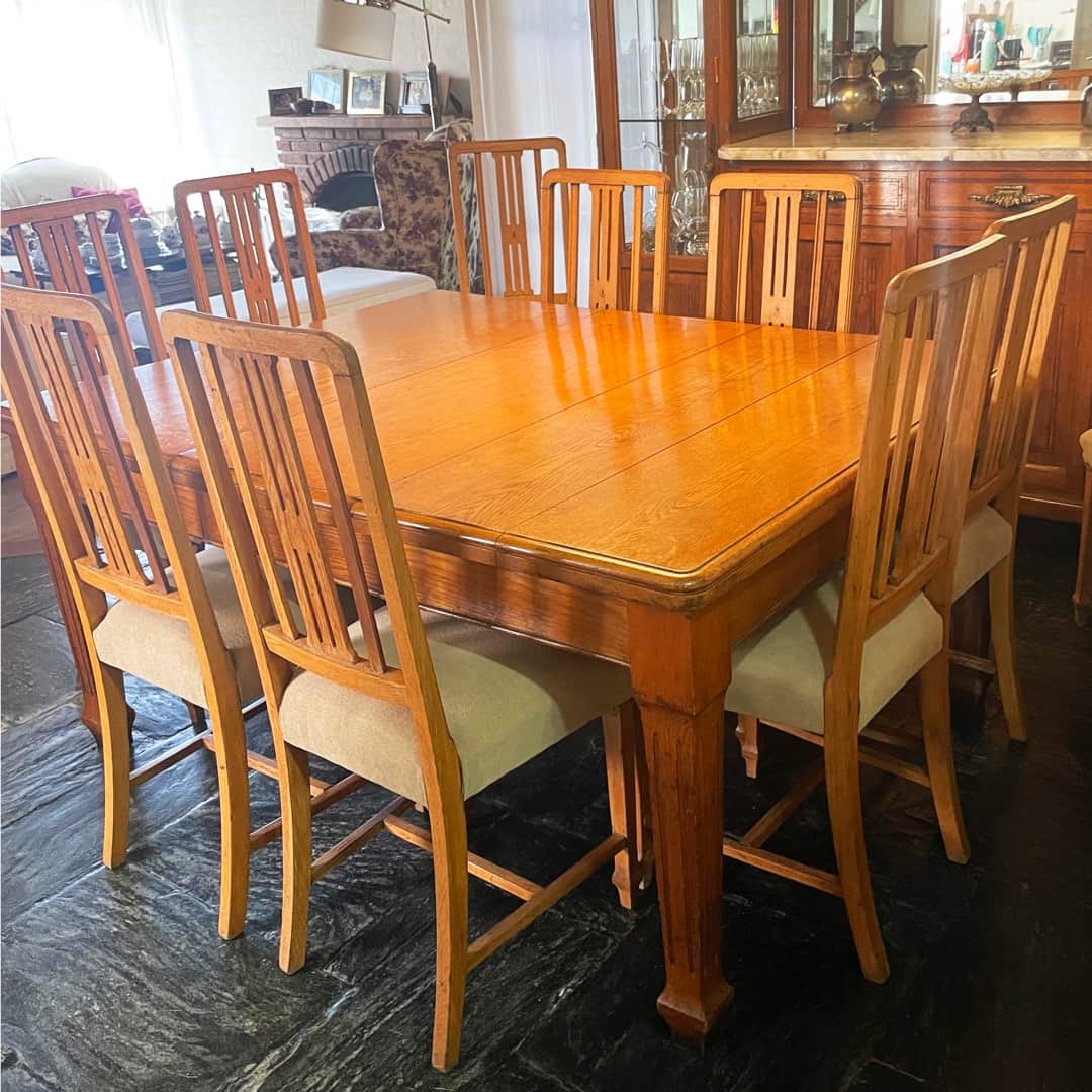 Mesa de Comedor + 10 sillas de roble . La mesa tiene 3 tablas de alargue. Muy buen estado. Mesa 120 cm x 110 cm sin alargue x 75 de Altura. c/u de los 3 alargues 41 cm x 120 cm.