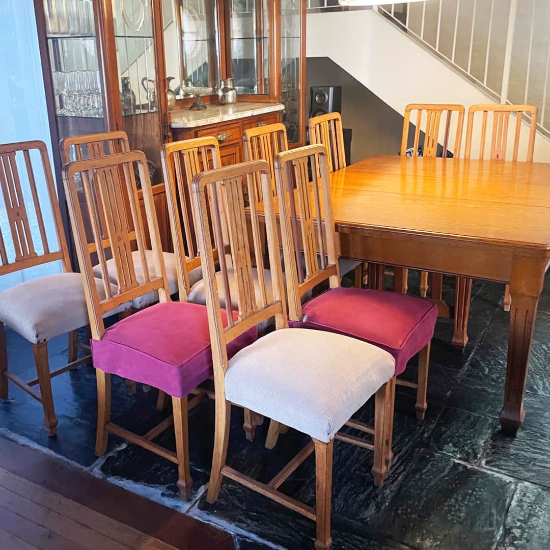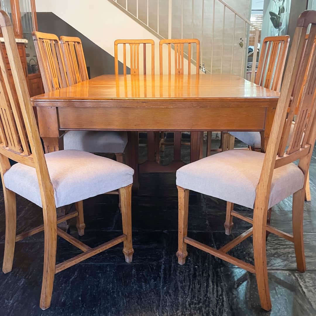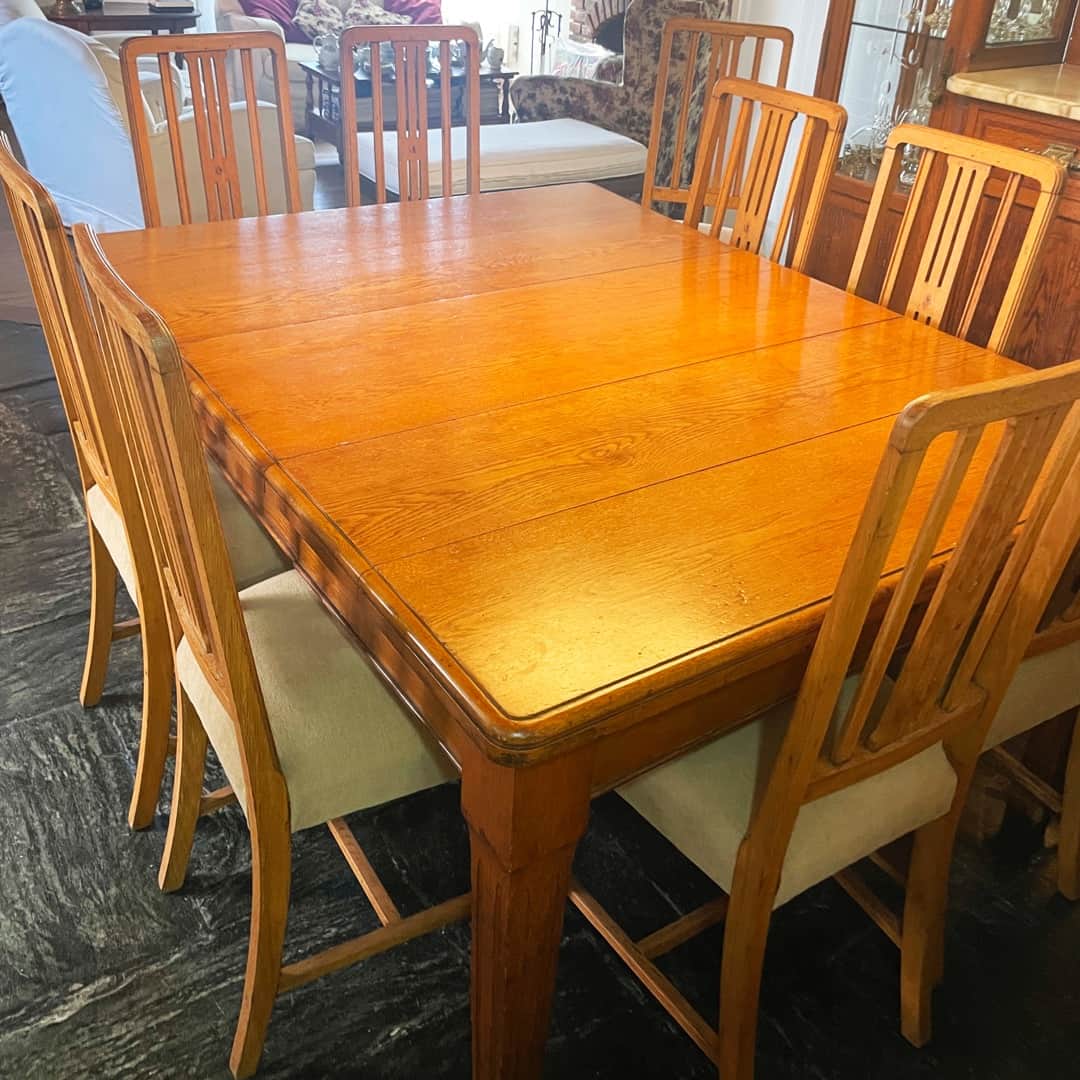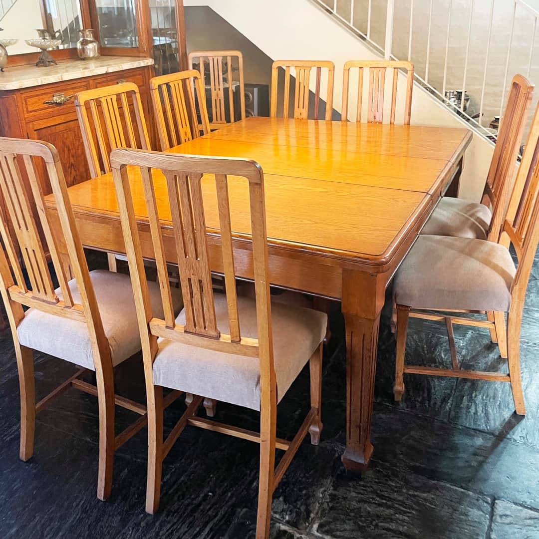 Mesa de Comedor + 10 sillas de roble . La mesa tiene 3 tablas de alargue. Muy buen estado. Mesa 120 cm x 110 cm sin alargue x 75 de Altura. c/u de los 3 alargues 41 cm x 120 cm.