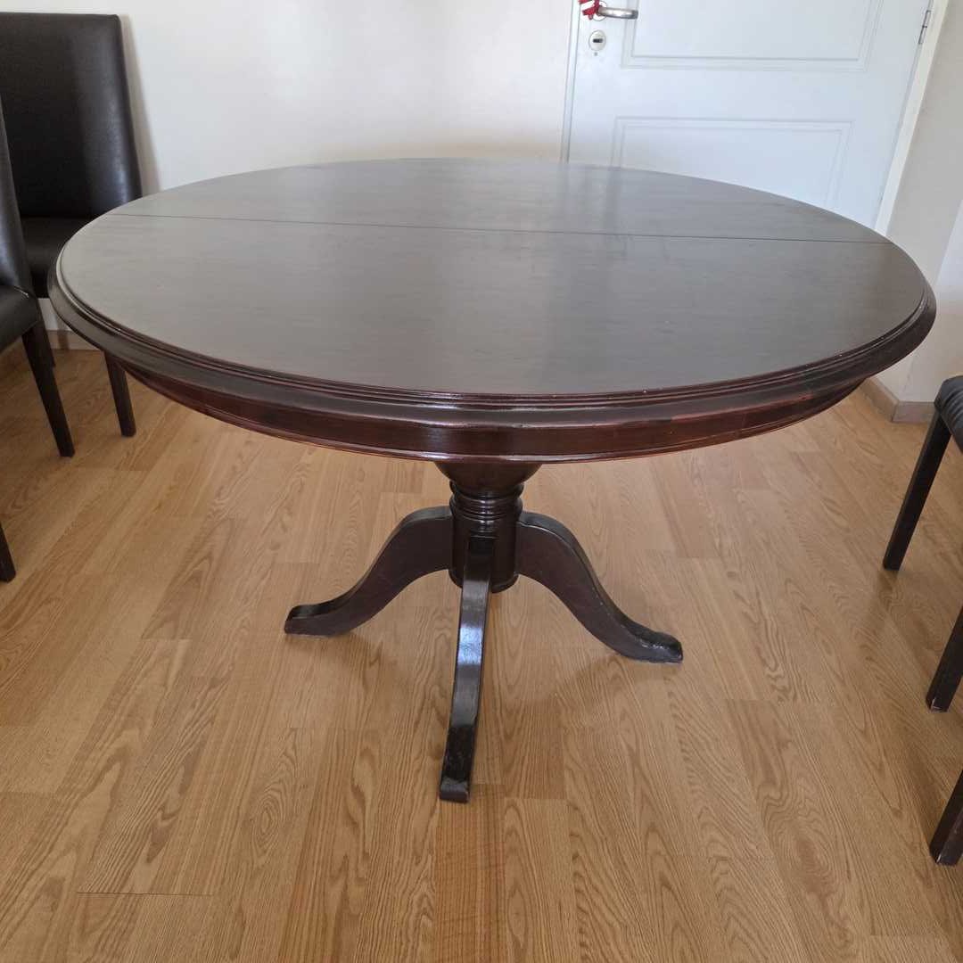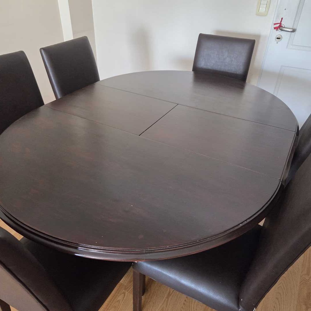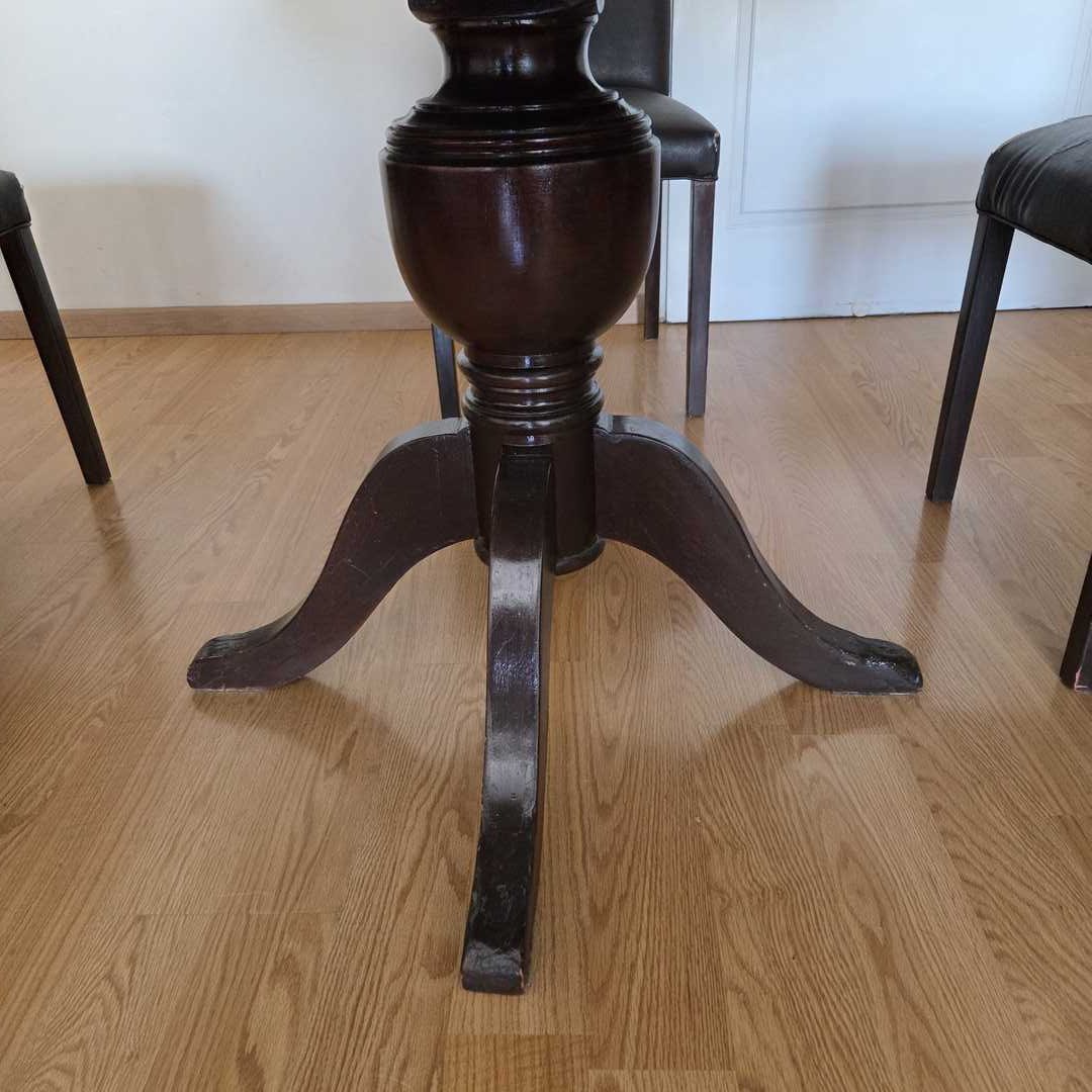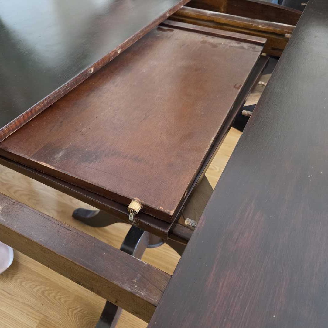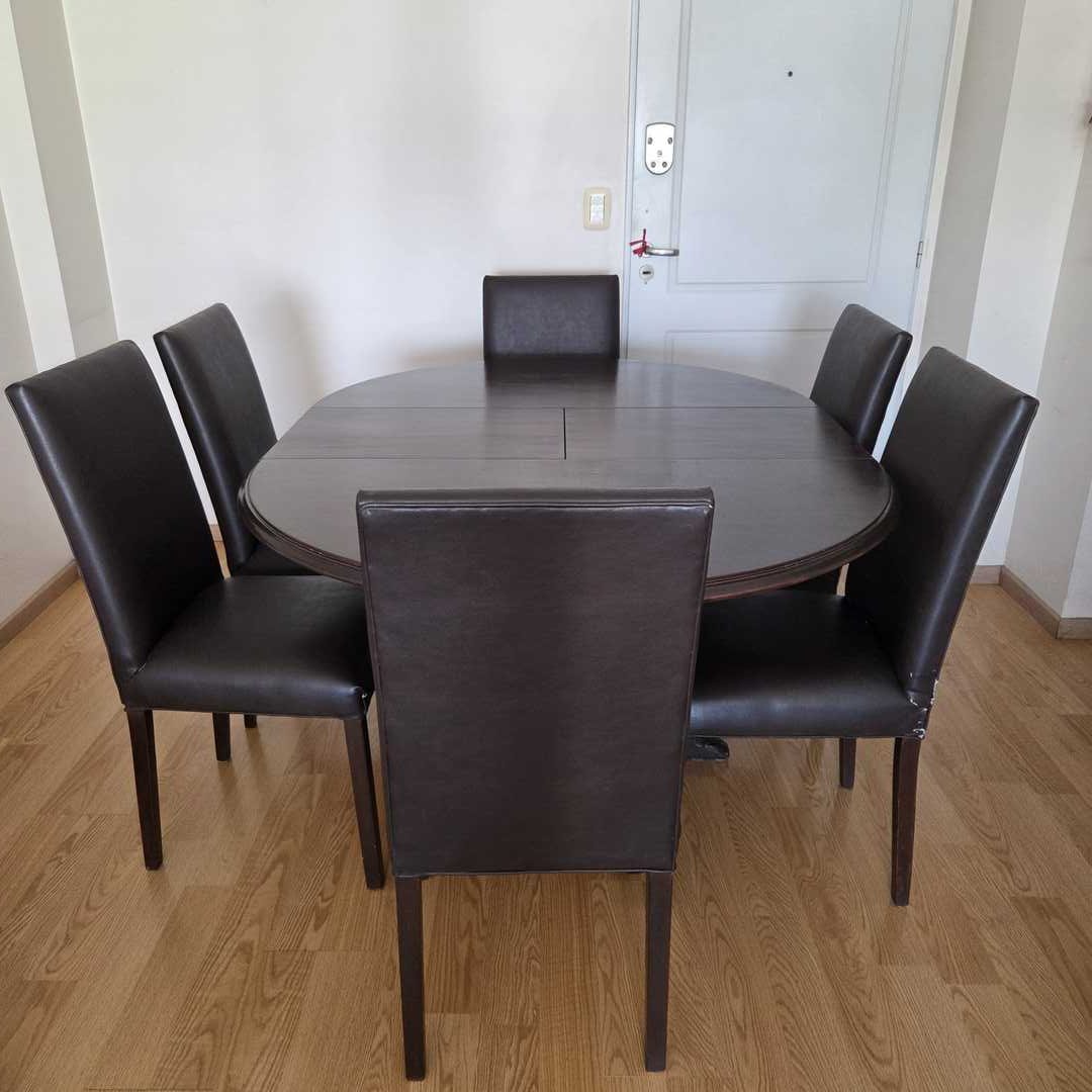 Juego de comedor compuesto por mesa en madera color wengue extensible (trampa), con detalles de uso (ver fotos). Medidas abierta 160 x 118 x 80 cm alt + 6 sillas en madera color wengue, con detalles de uso (ver fotos). Para retapizar, con 6 fundas lavables. Medidas 47 x 47 cm. Alt 98 cm. Atención: traer herramientas para desarmarla. Desarmada baja por ascensor, sino 6 pisos por escalera.