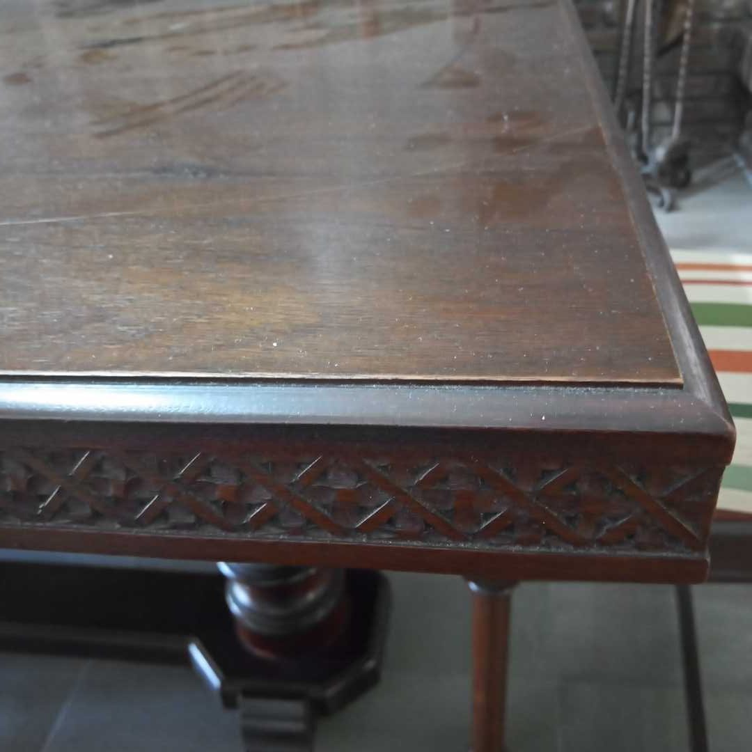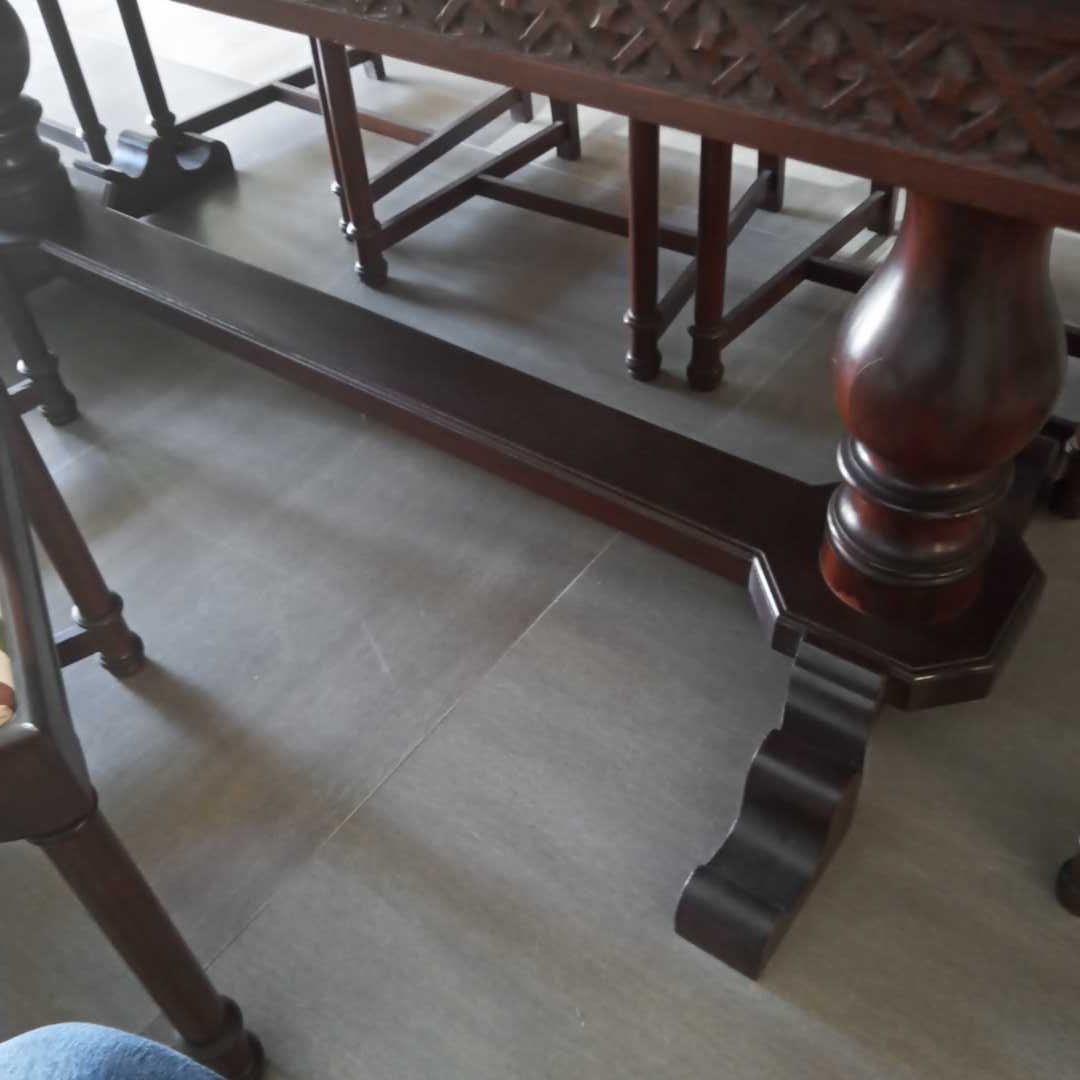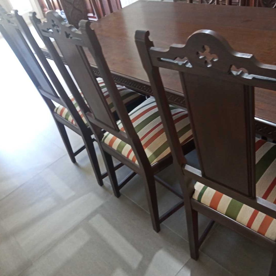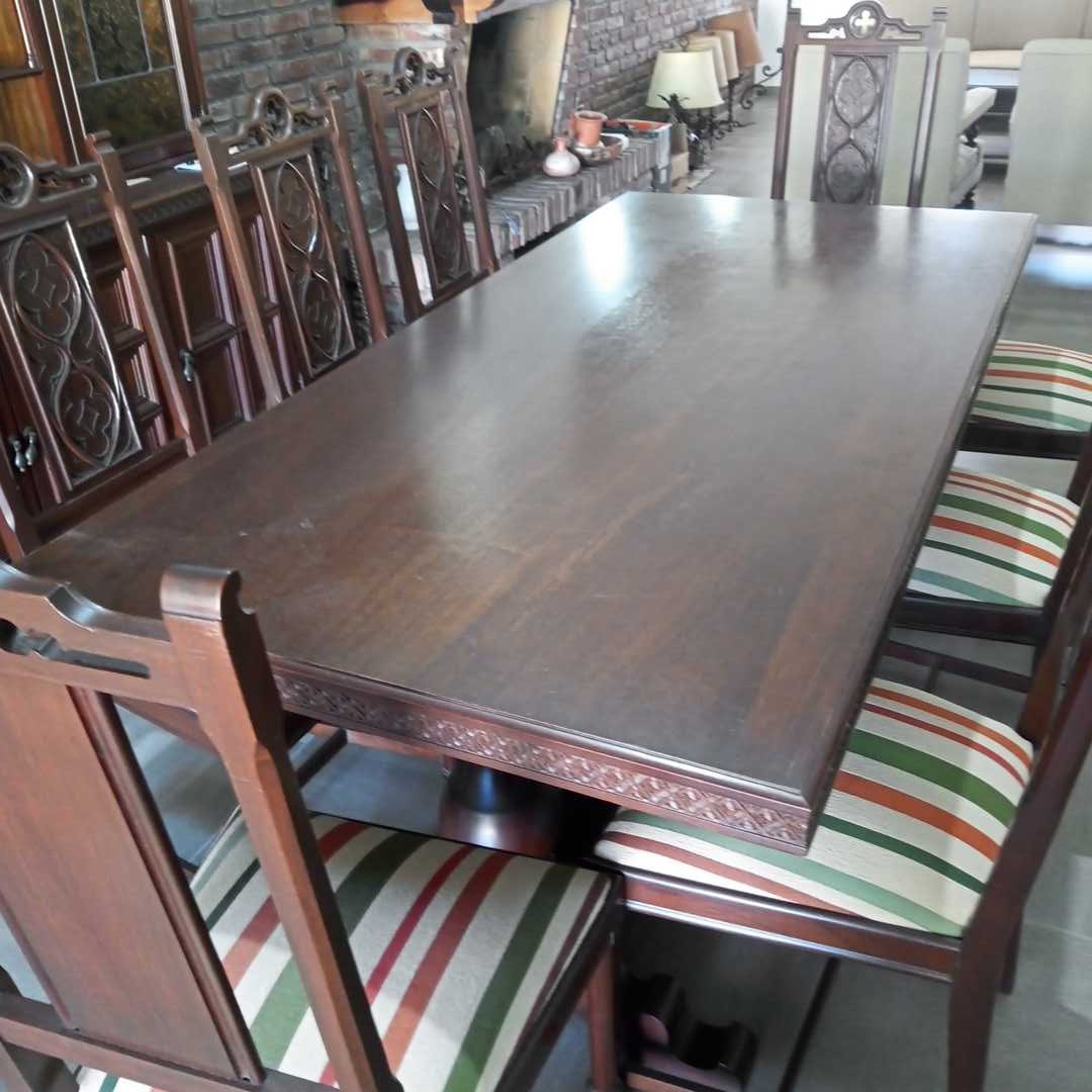Juego de comedor clásico en madera compuesto por mesa 188 x 90 cm + 8 sillas con asiento tapizado y respaldo tallado.