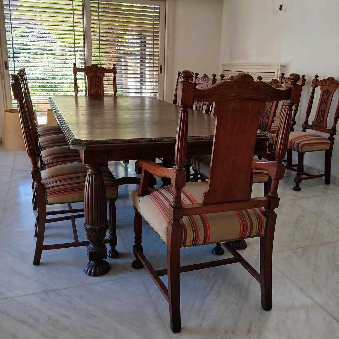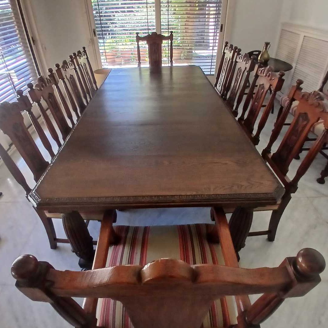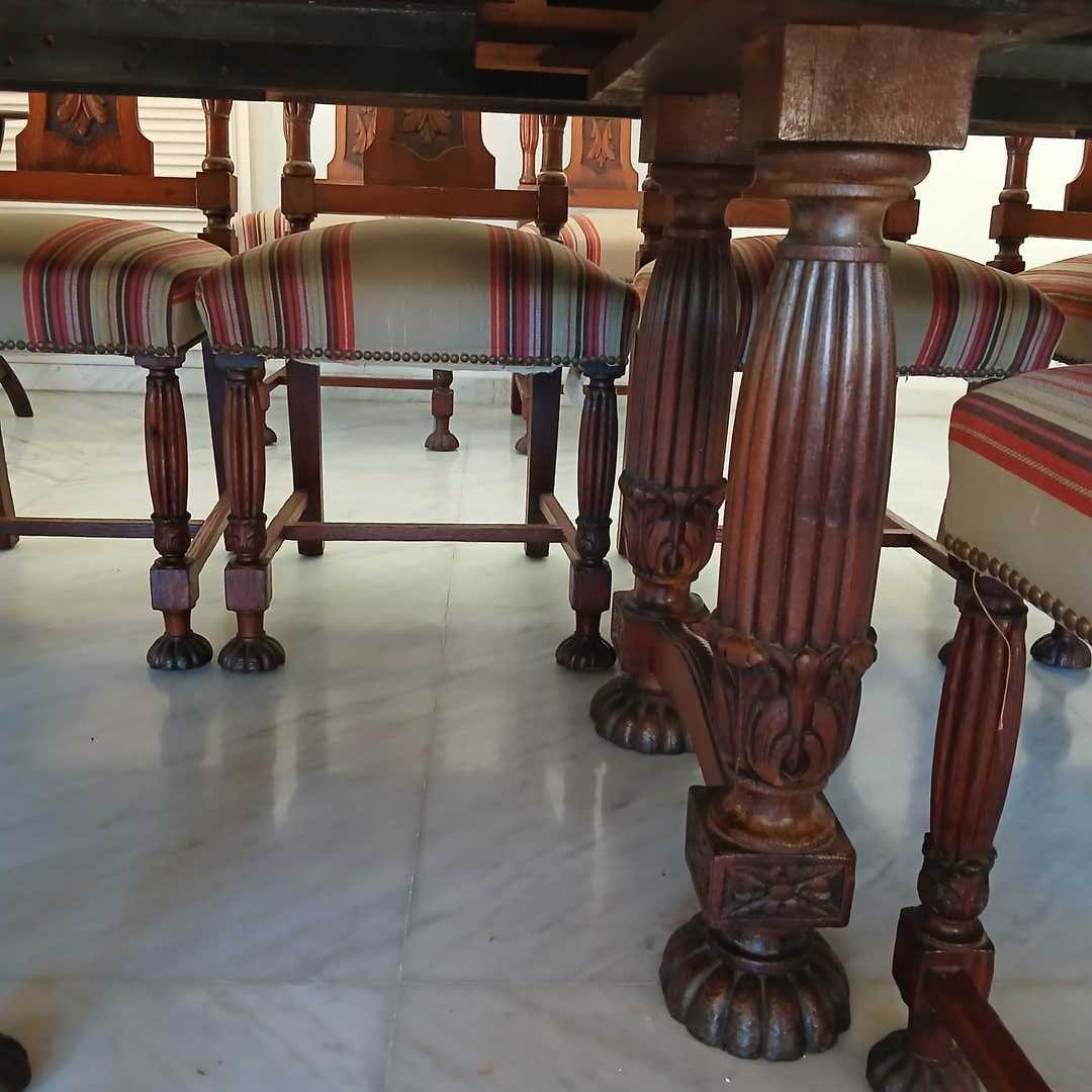 Juego de comedor estilo español compuesto por mesa 120 x 250 x 78 cm alt + 10 sillas y 2 silloncitos