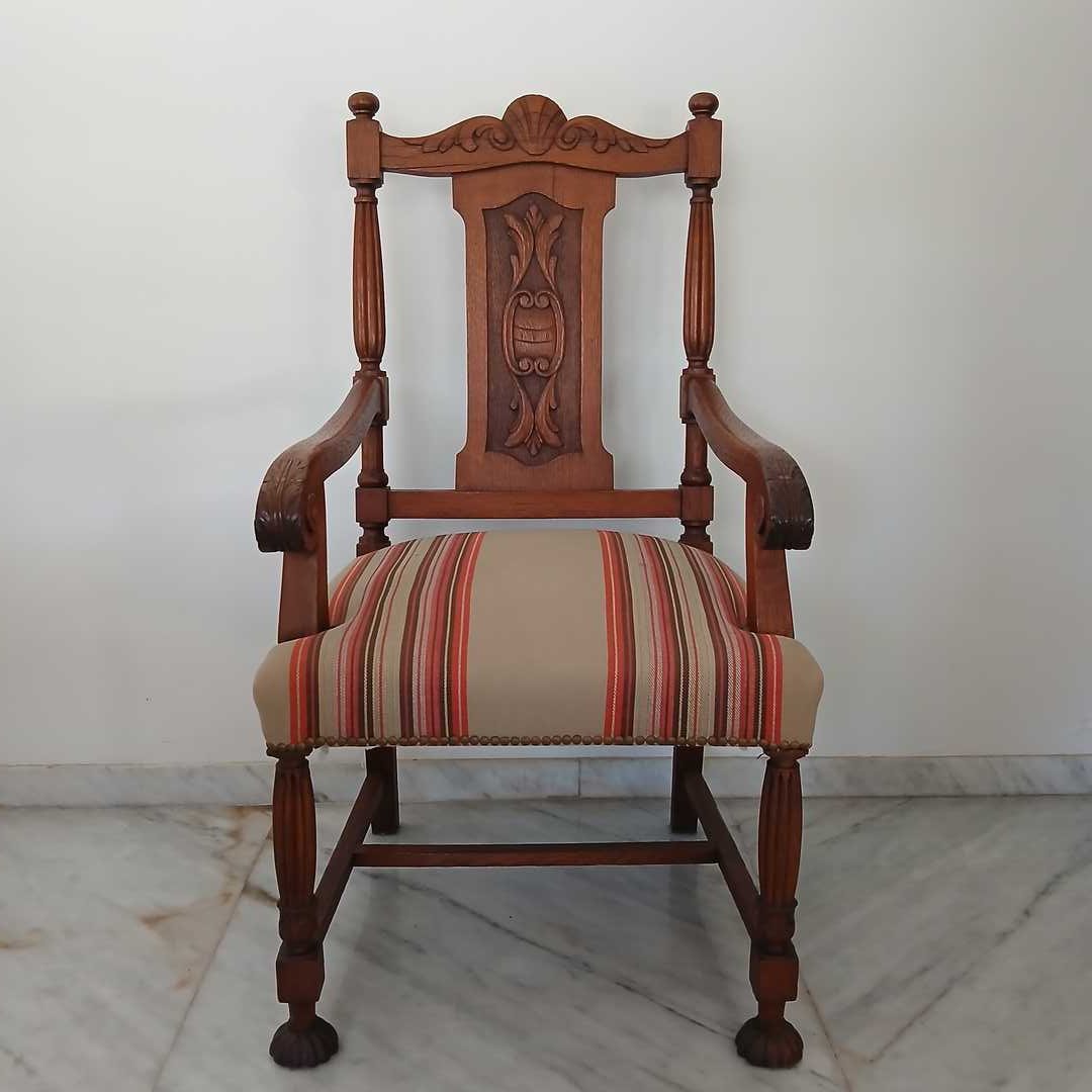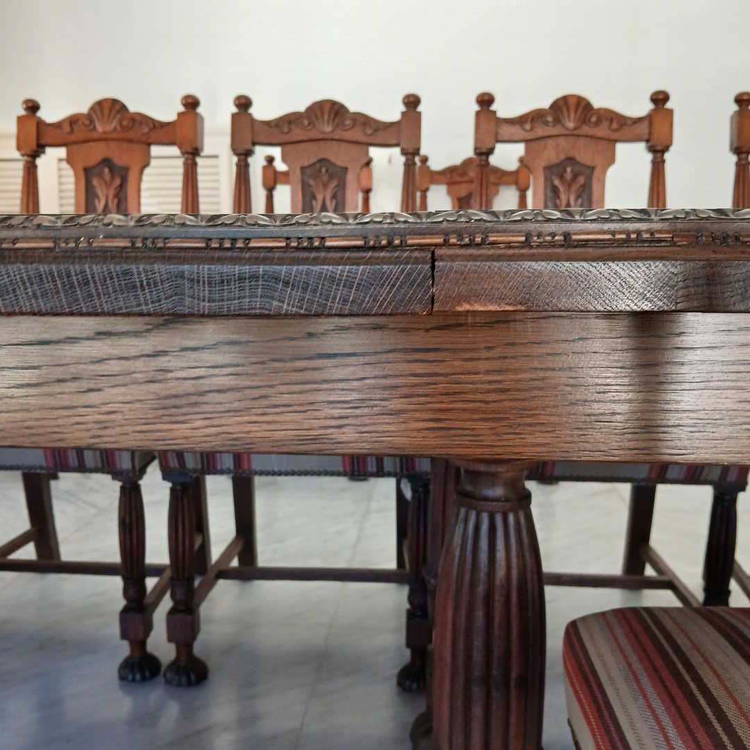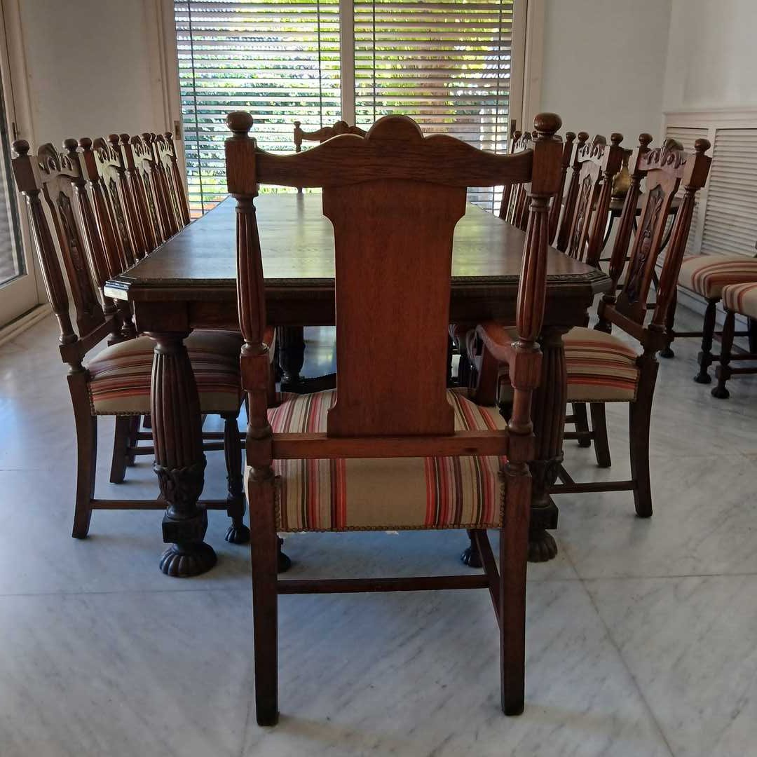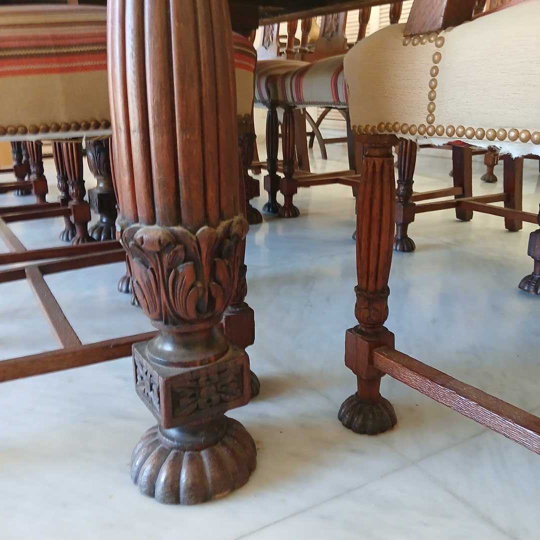 Juego de comedor estilo español compuesto por mesa 120 x 250 x 78 cm alt + 10 sillas y 2 silloncitos