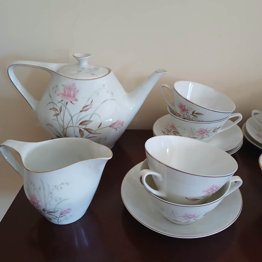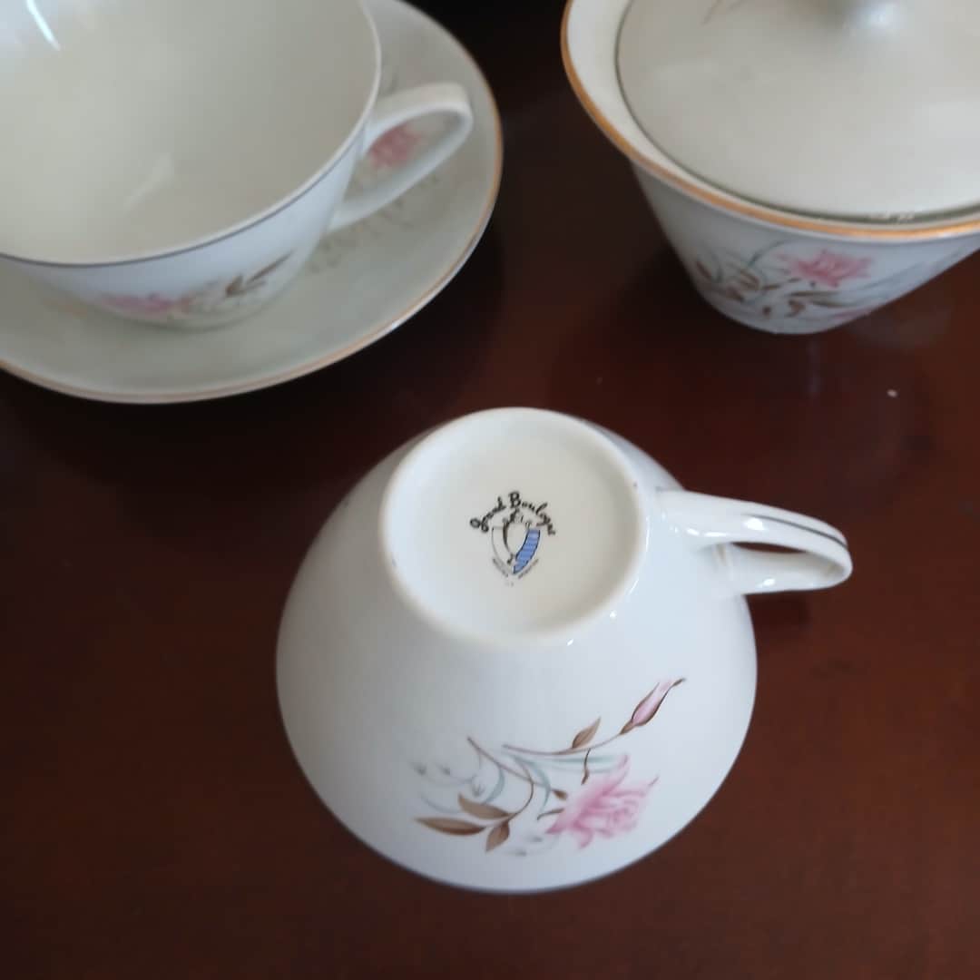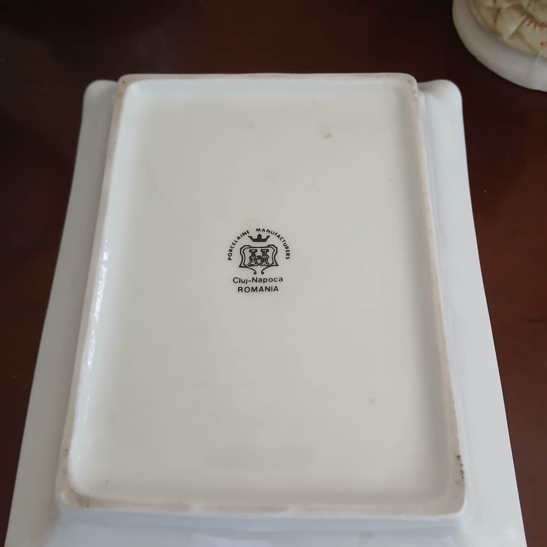Juego de te, cenicero con virola dorada y flores, 3 figuras en pasas.
