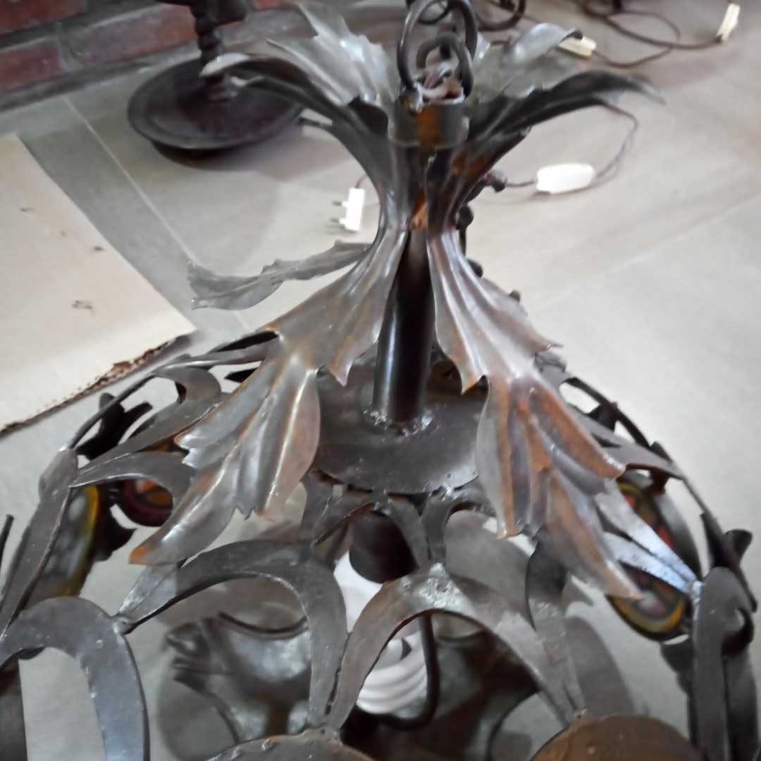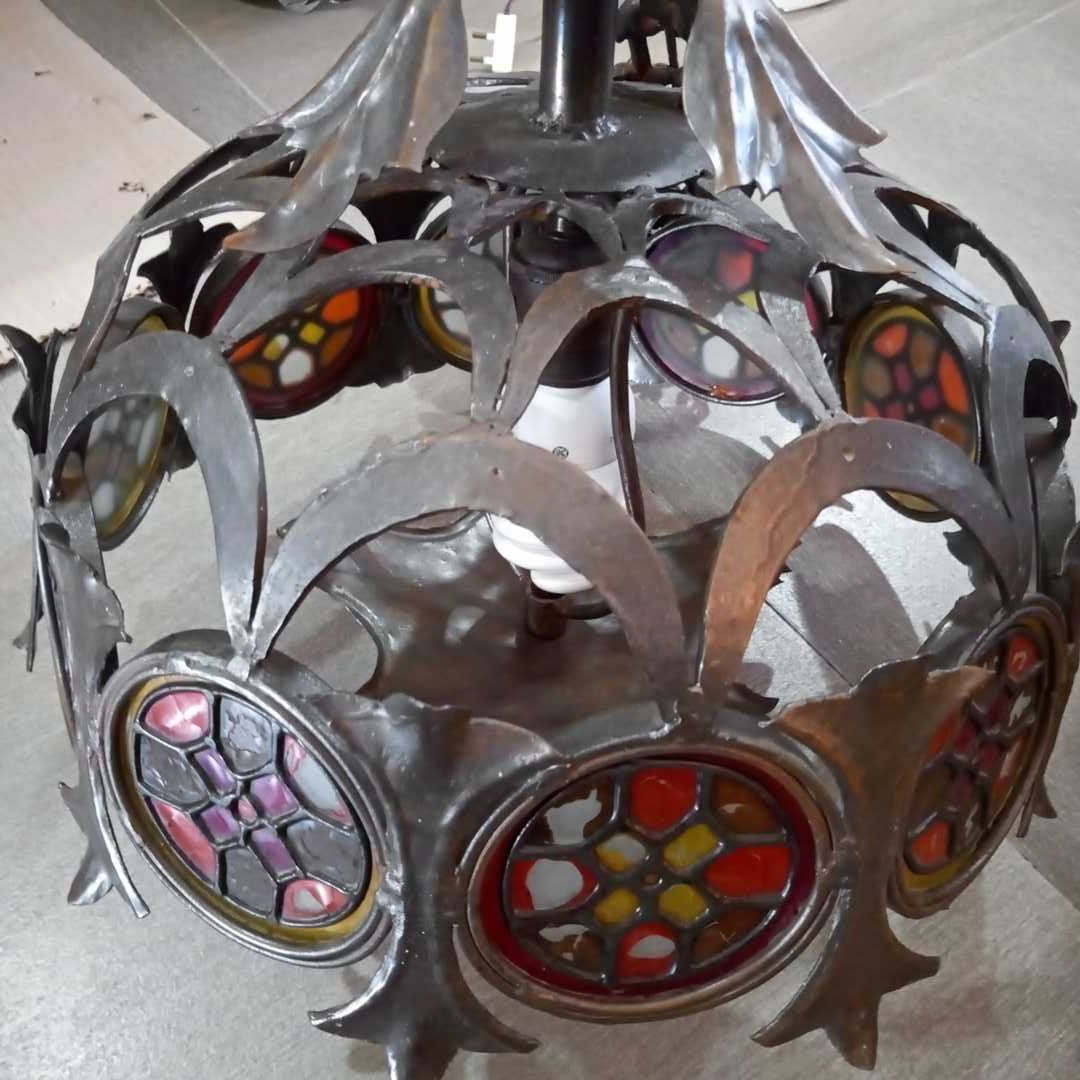 Lámpara colgante y círculos de colores imitando vitreaux. Diám 45 cm. Alt 45 cm.