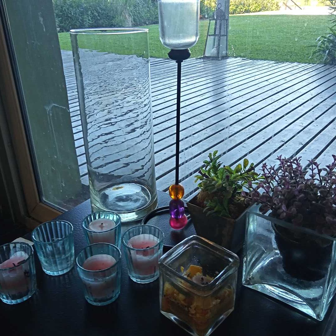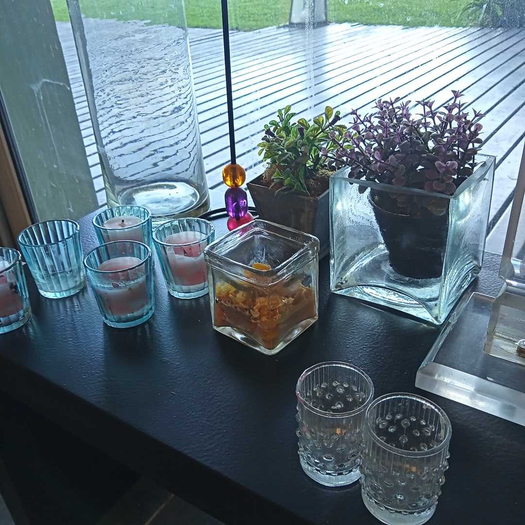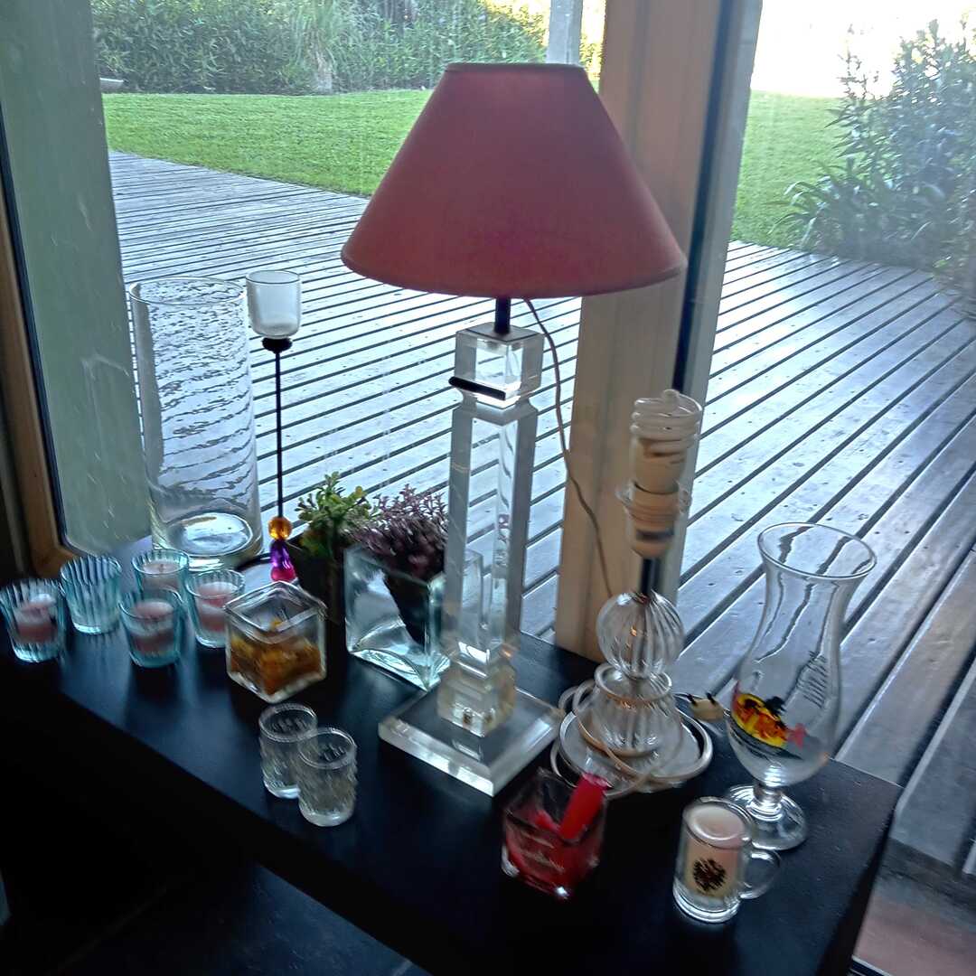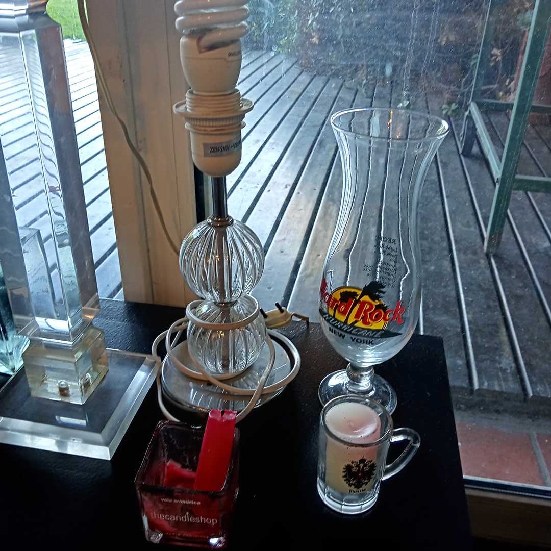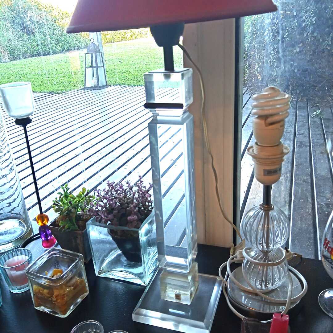 17 piezas: lote de adornos y 2 veladores. Lámpara acrílico 55 cm alt.