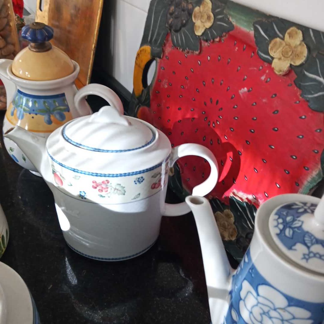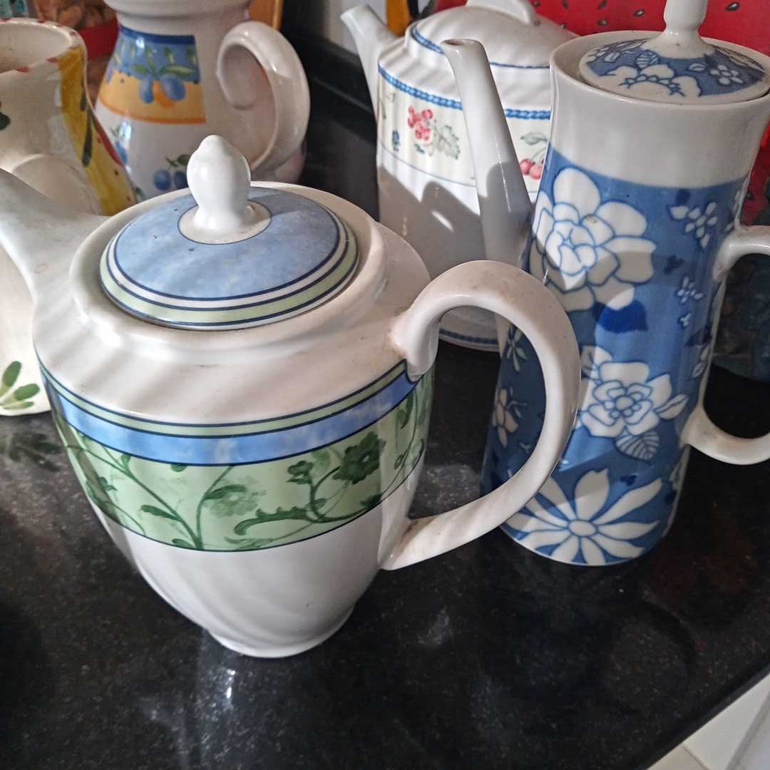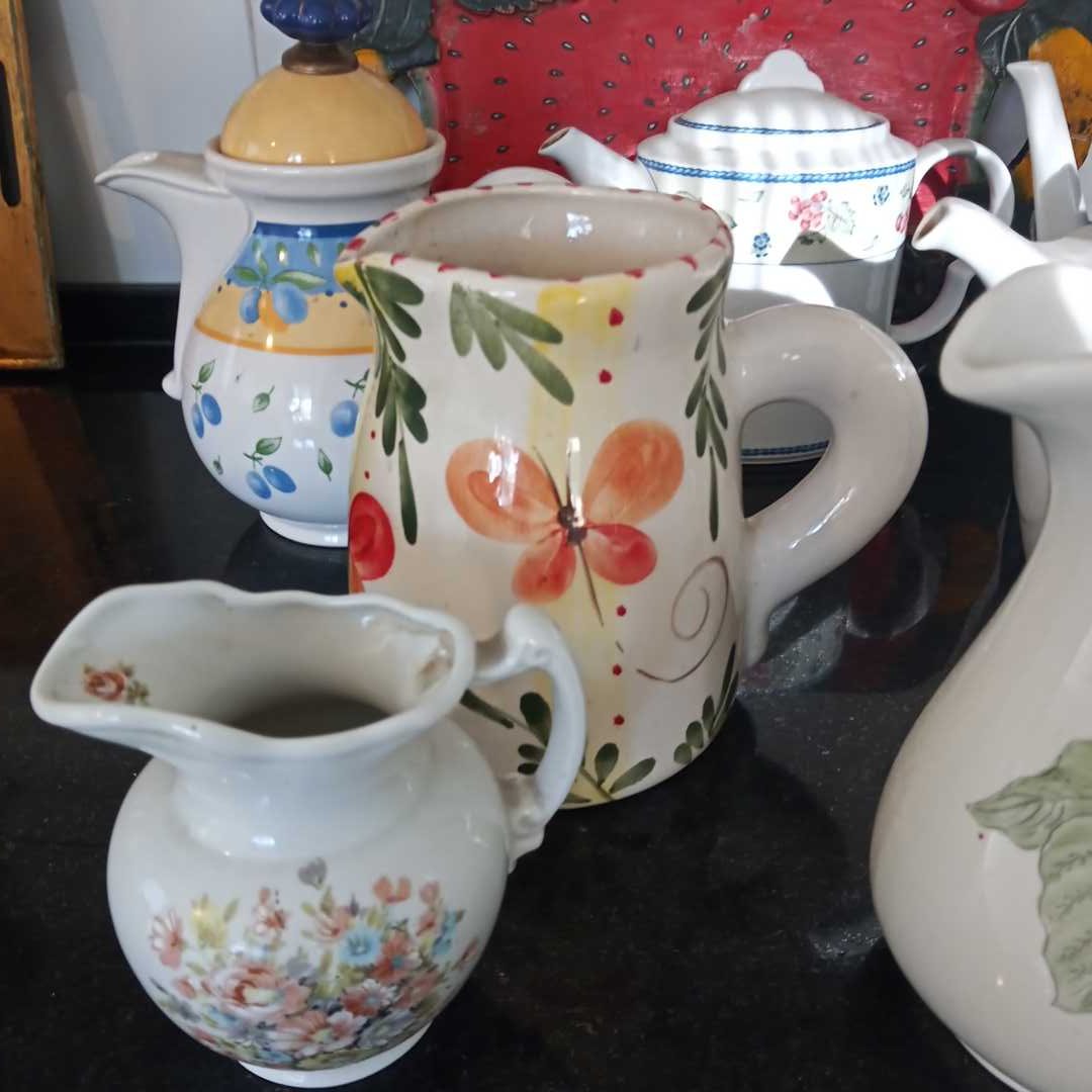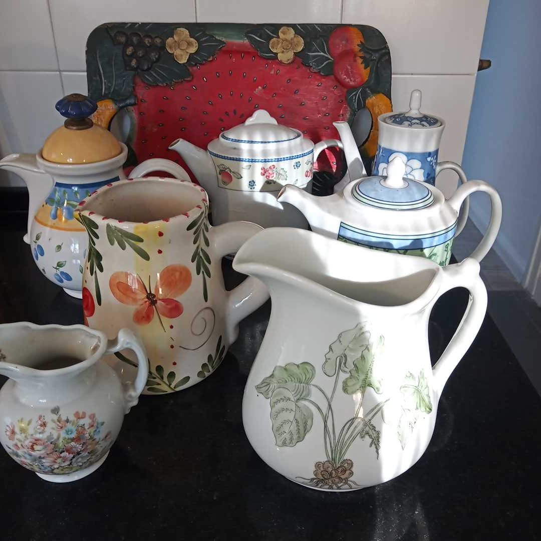 8 productos: jarras, teteras y bandeja pintada. Alto jarra más grande 17 cm.