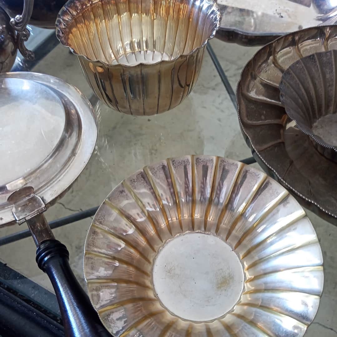 Lote de metal palteado 8 piezas. Jarras y puchero Devon. Jarra grande 19 cm alt.