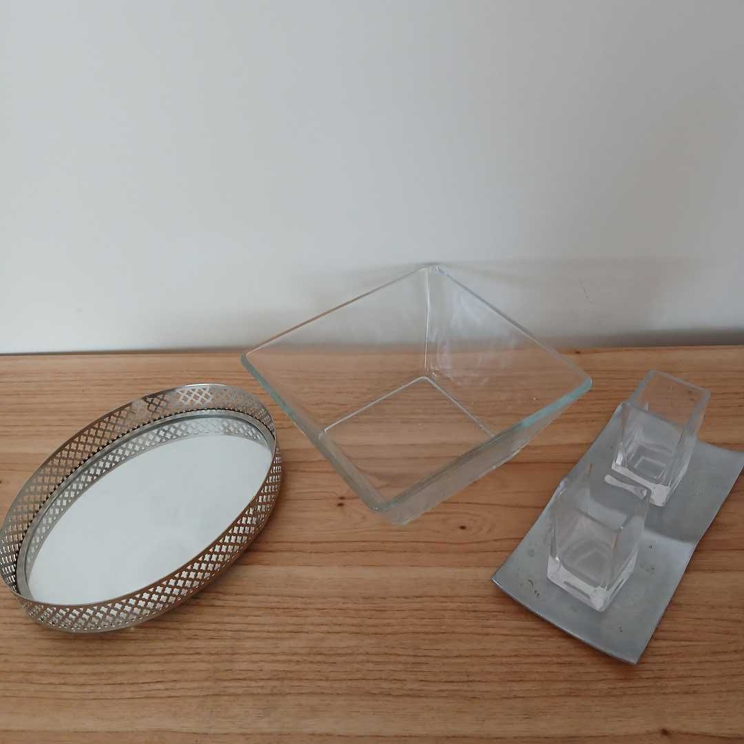 3 adornos en vidrio. Presentoire con espejo oval con patas. Ancho 25 cm. Ensaladera en vidrio 22 x 23 cm.