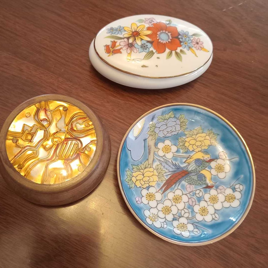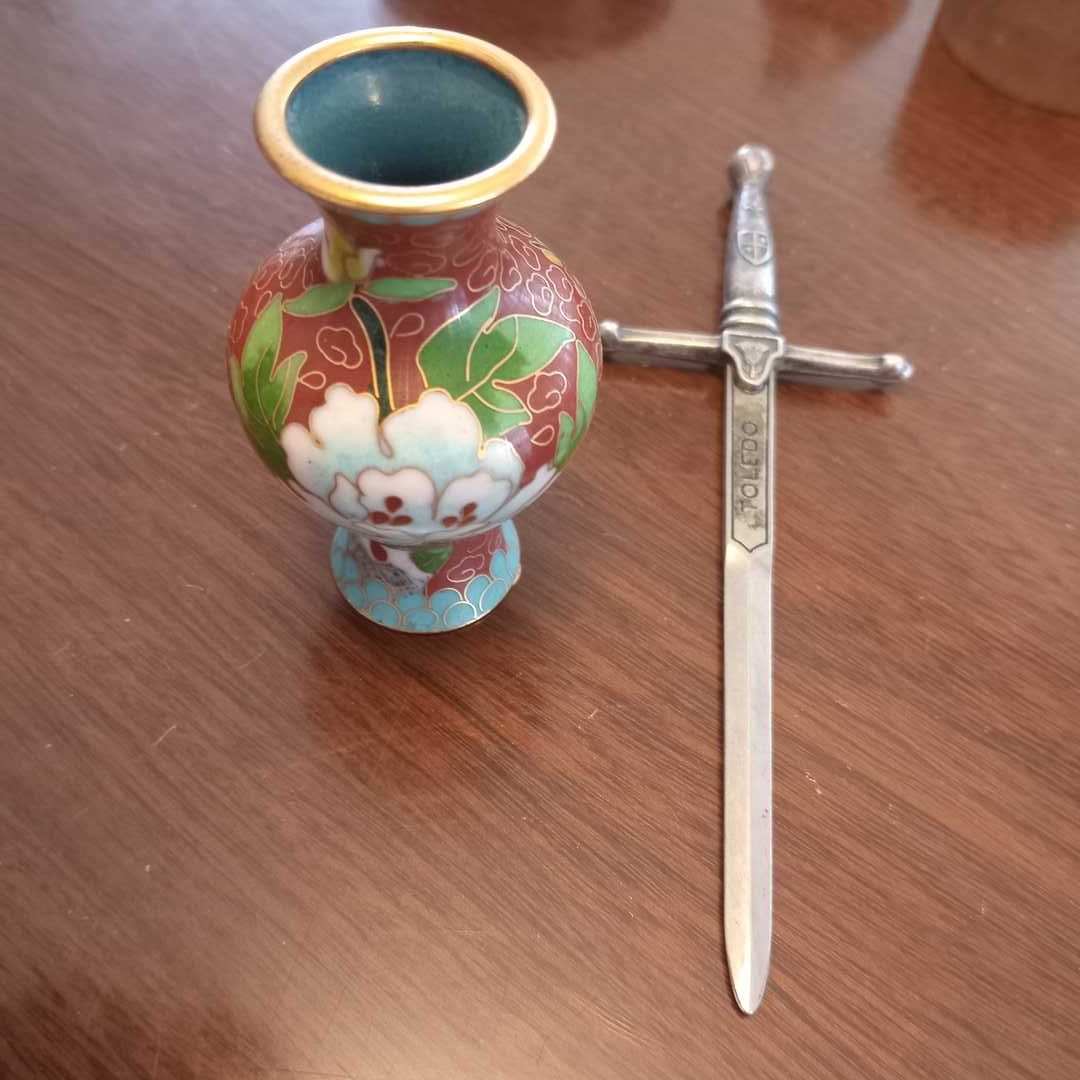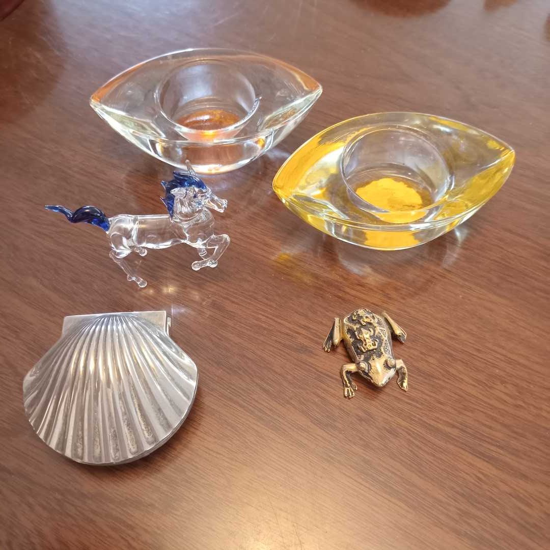 Cajas distintos materiales y procedencias, pequeño florero cloisoné, pastillero cloisoné, abre cartas, sapo en bronce, caballo y 2 porta velas en vidrio. Diám caja de madera con decoración oriental 14 cm.