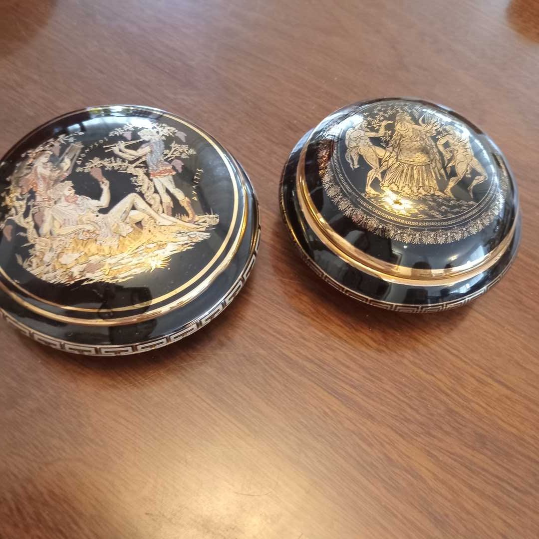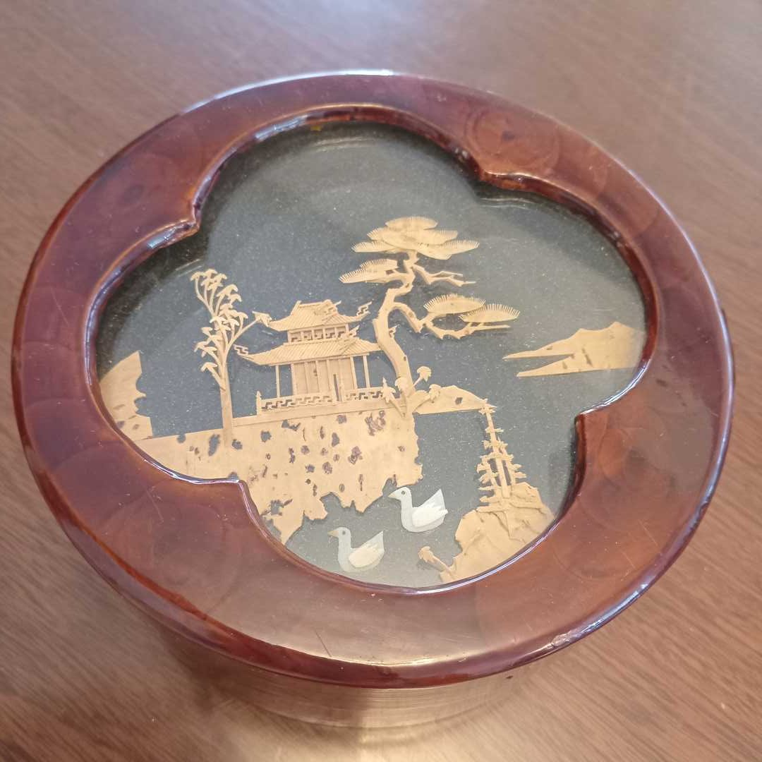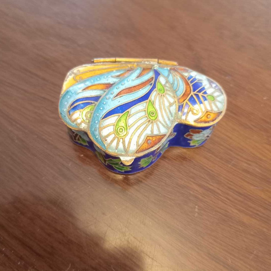 Cajas distintos materiales y procedencias, pequeño florero cloisoné, pastillero cloisoné, abre cartas, sapo en bronce, caballo y 2 porta velas en vidrio. Diám caja de madera con decoración oriental 14 cm.