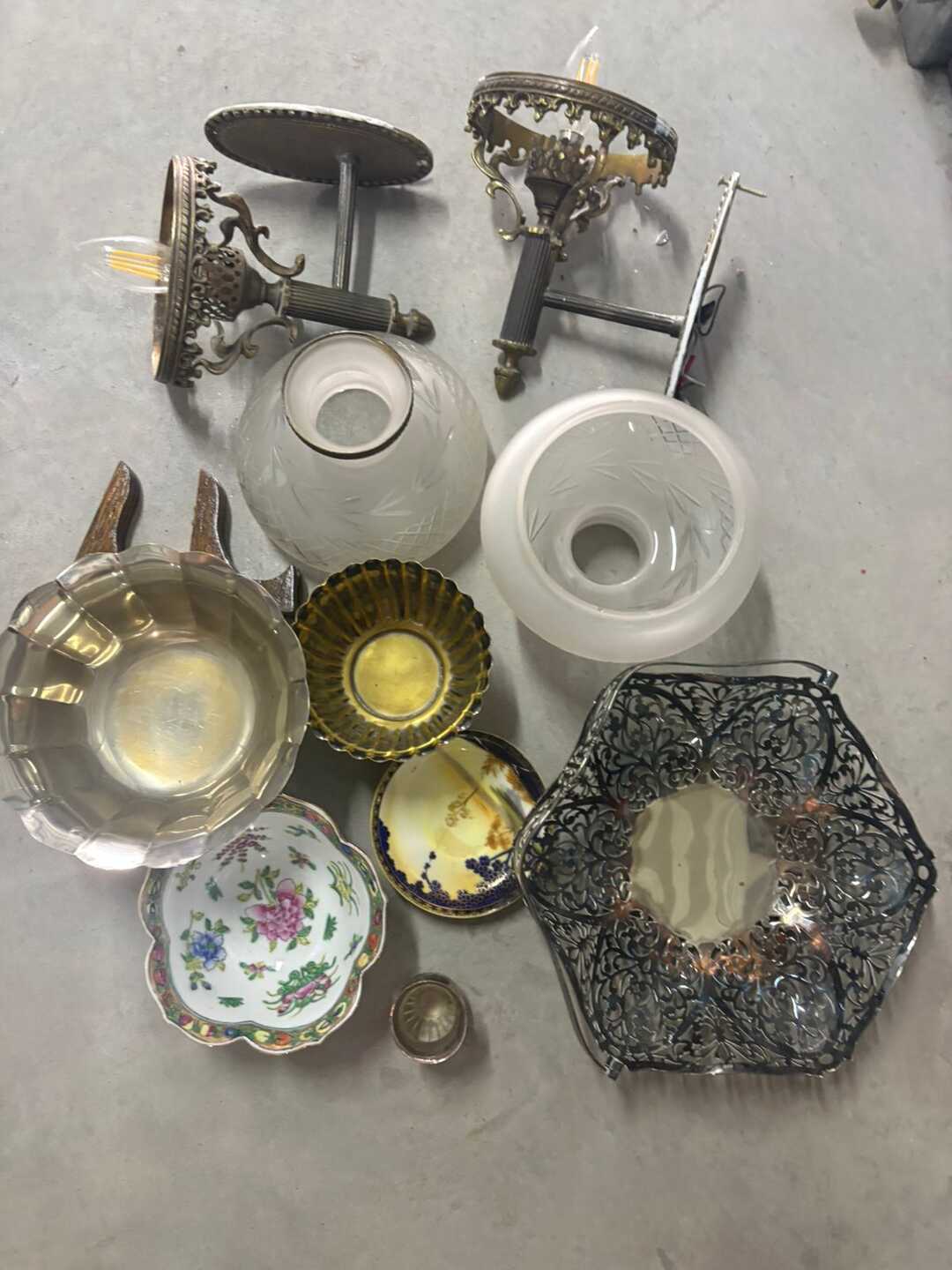 Lote varios: Par de apliques de luz, Canasta en metal plateado, platos decorativos y más.