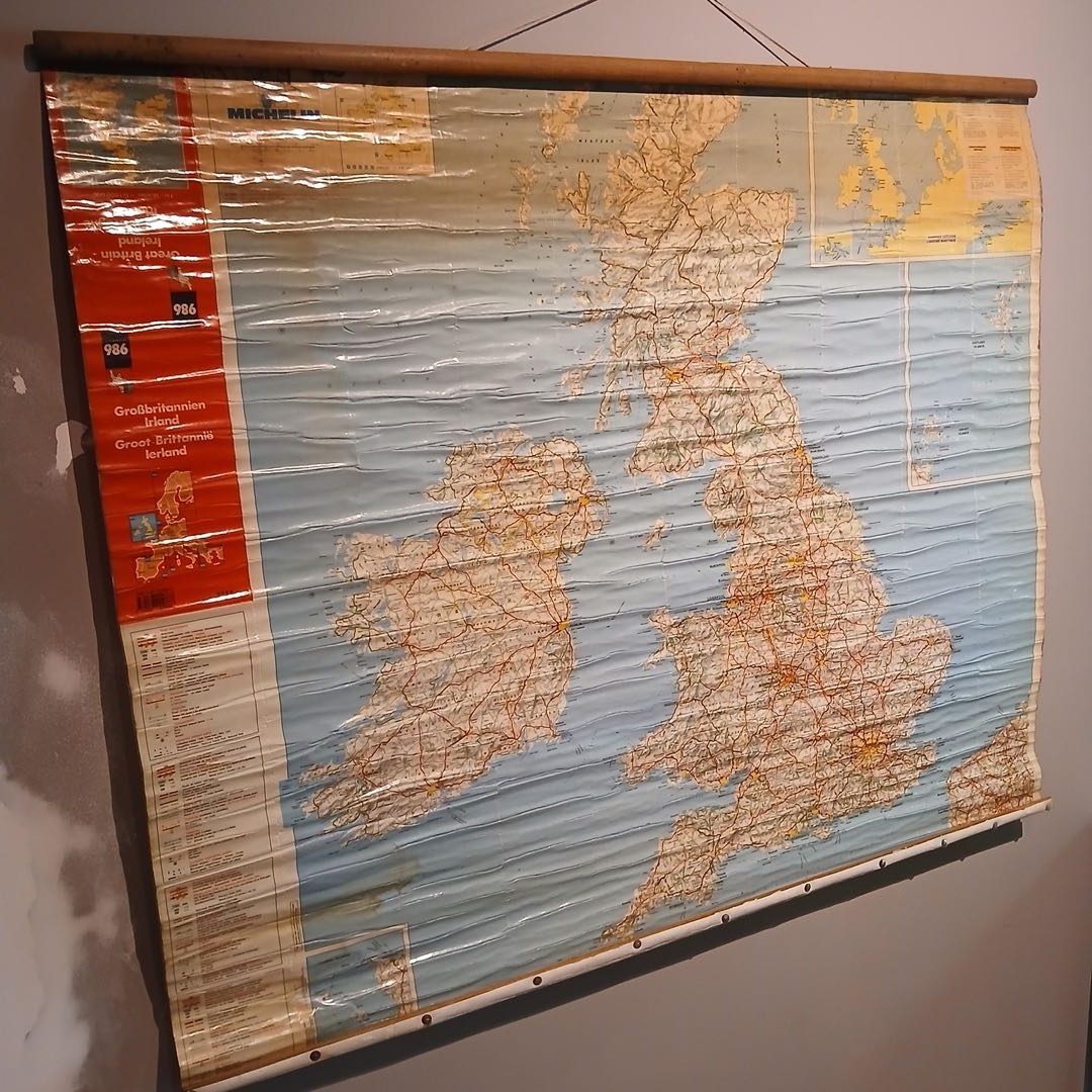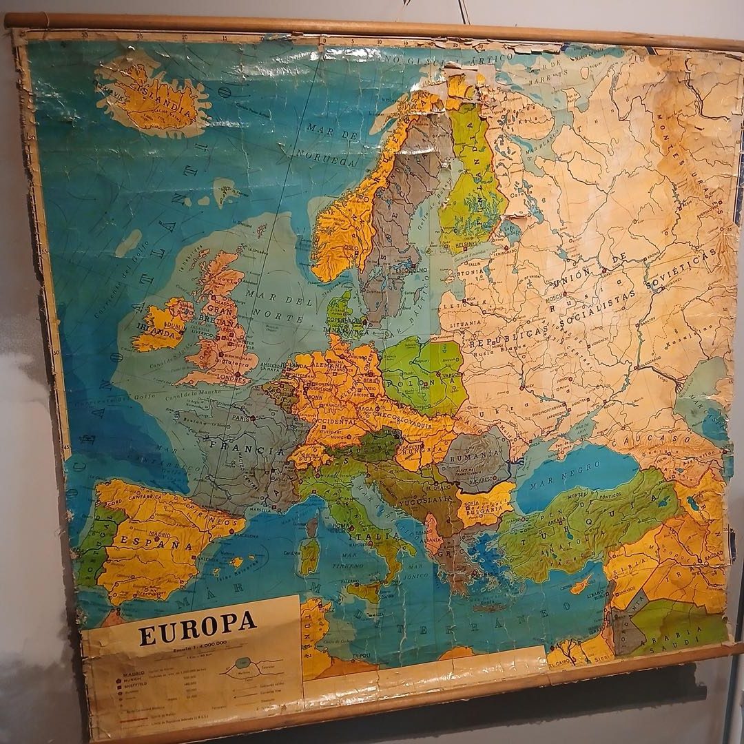 2 mapas «Europa» 125 x 120 cm, «Gran Bretaña» 110 x 90 cm. Con desgaste.