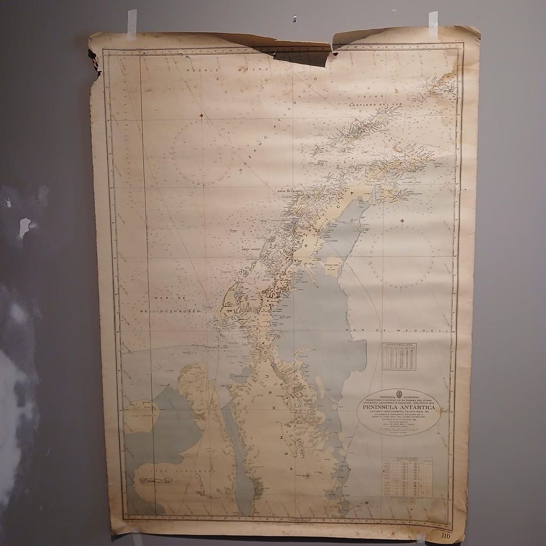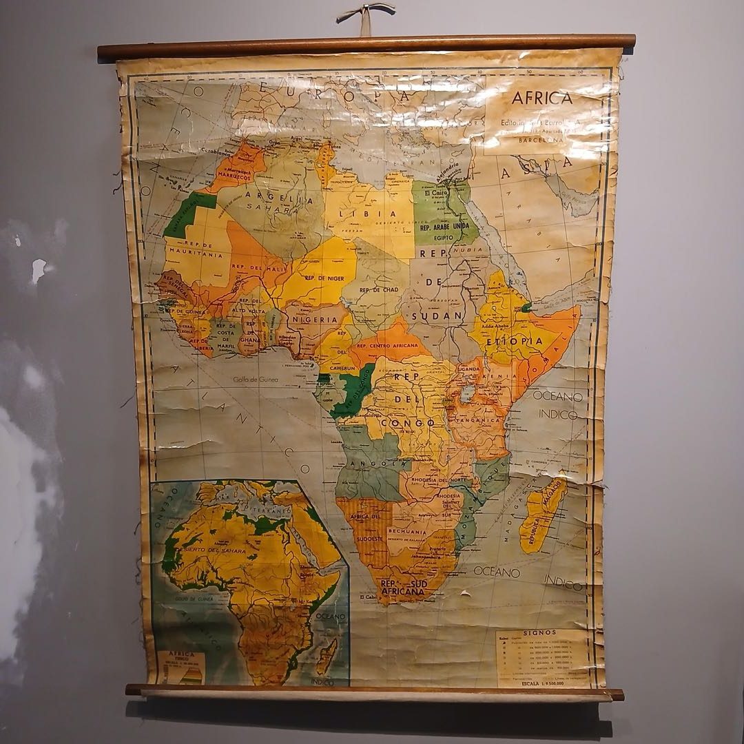 2 mapas antiguos: «África» 84 x 115 cm, «Península antártica» 80 x 110 cm. Con desgaste.