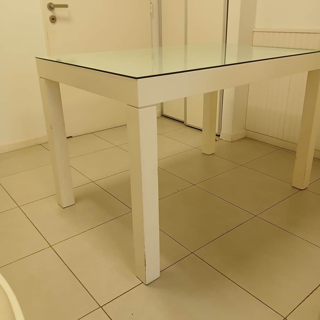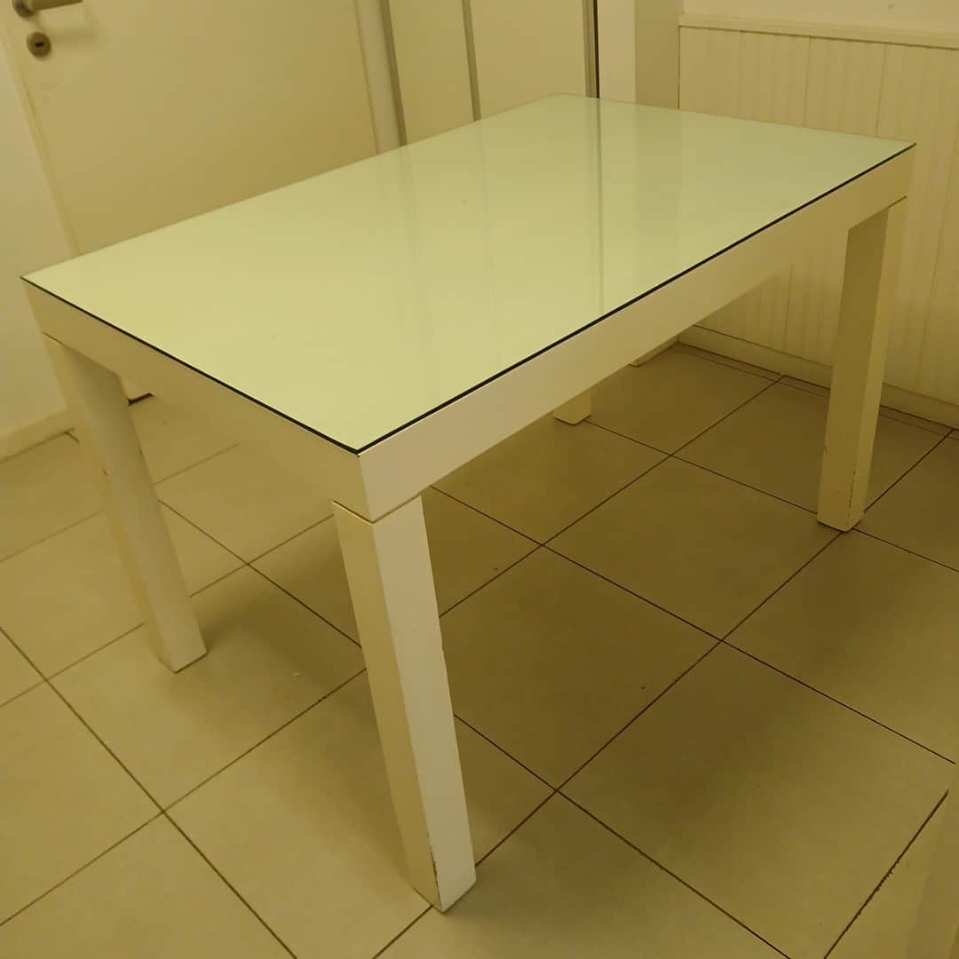 Mesa estructura en madera laqueada de blanco y vidrio. Con desgaste de uso (ver fotos). 120 x 80 x 78 cm.