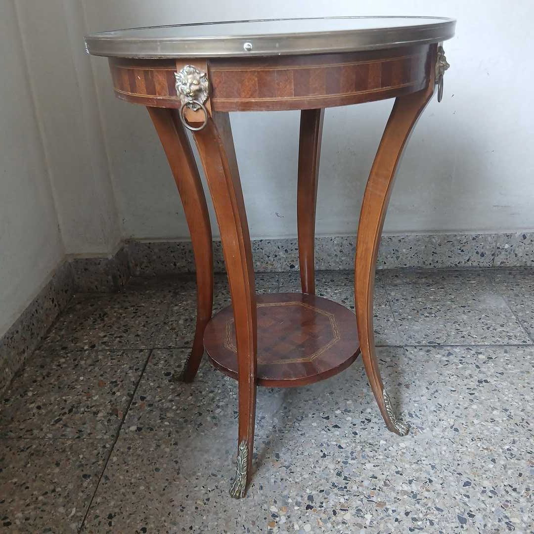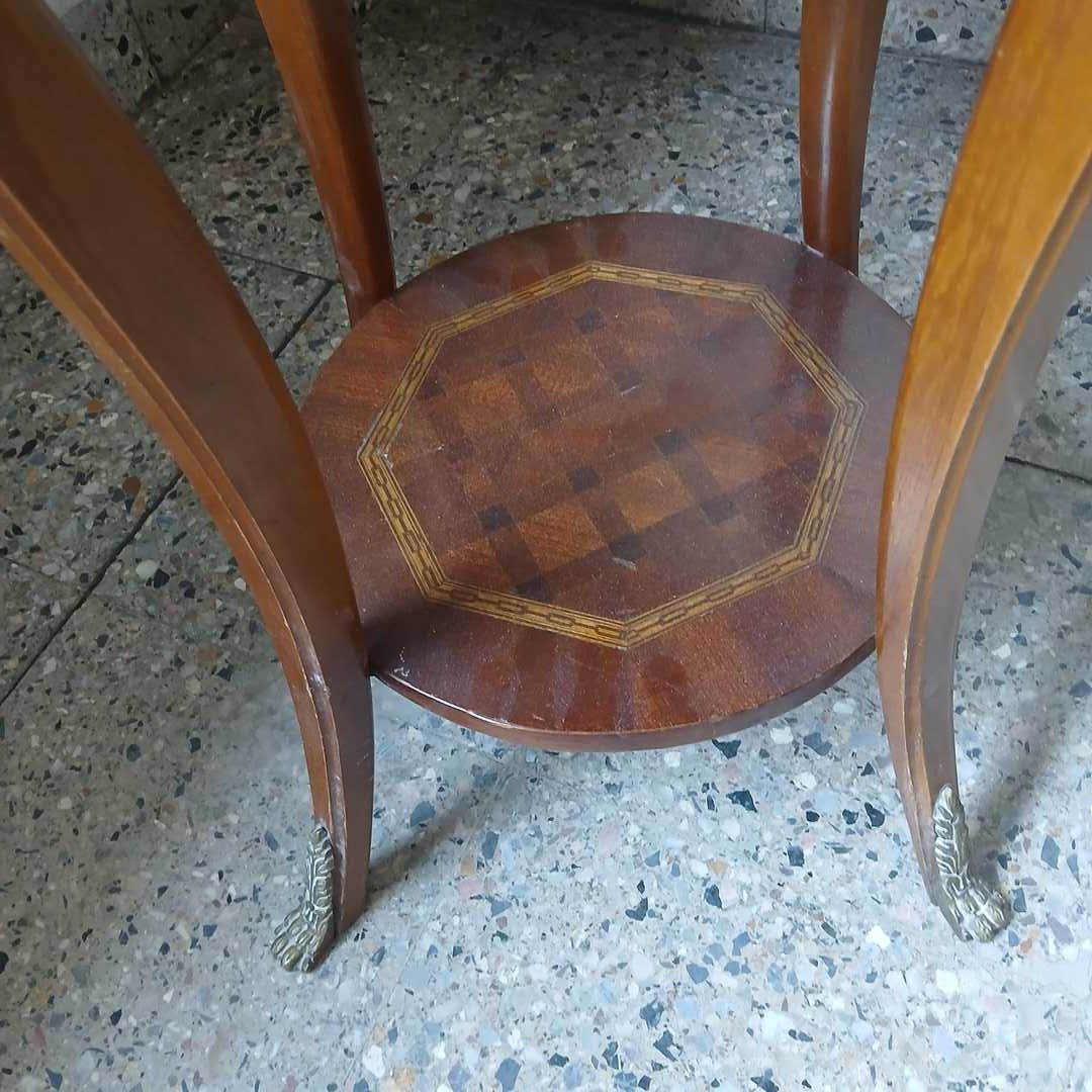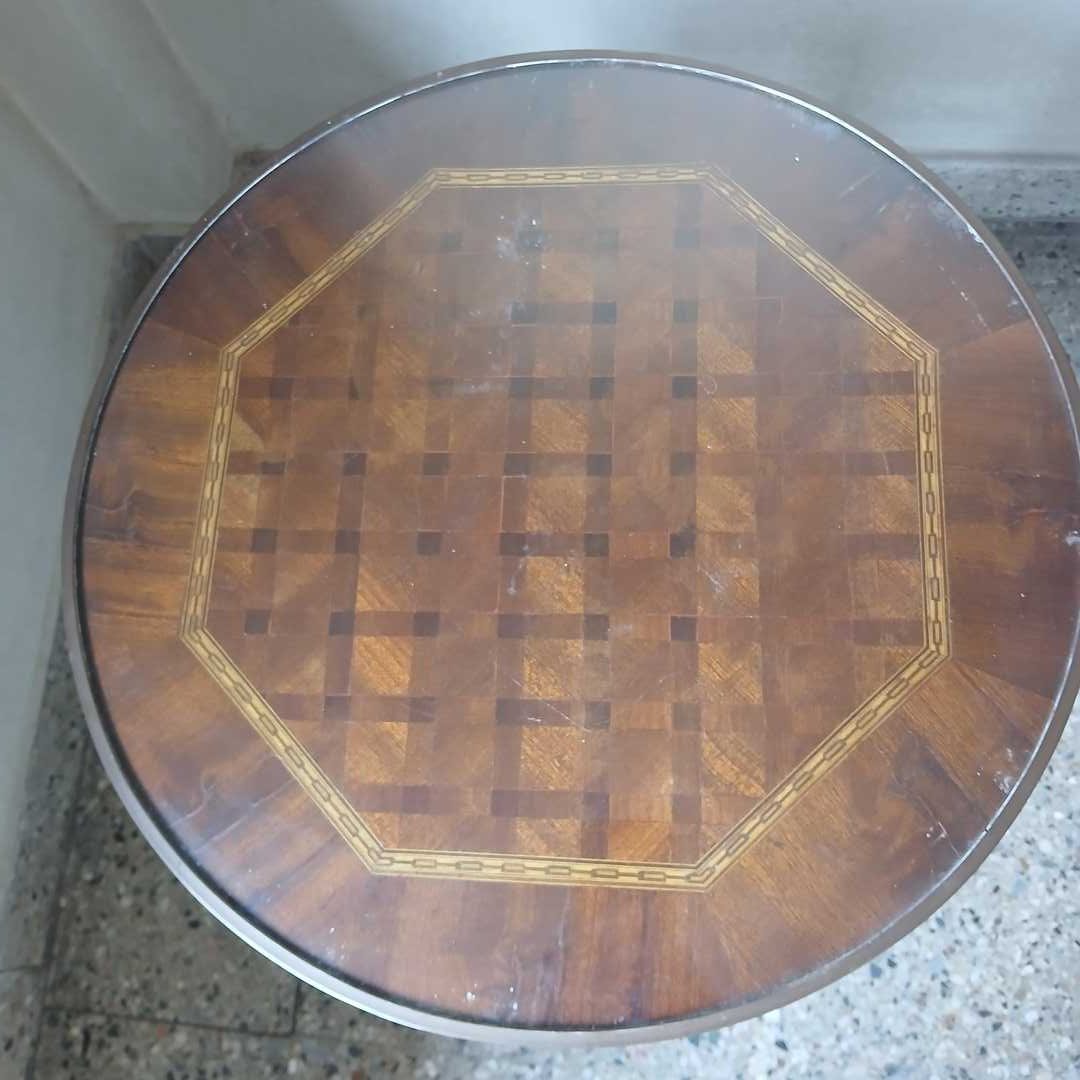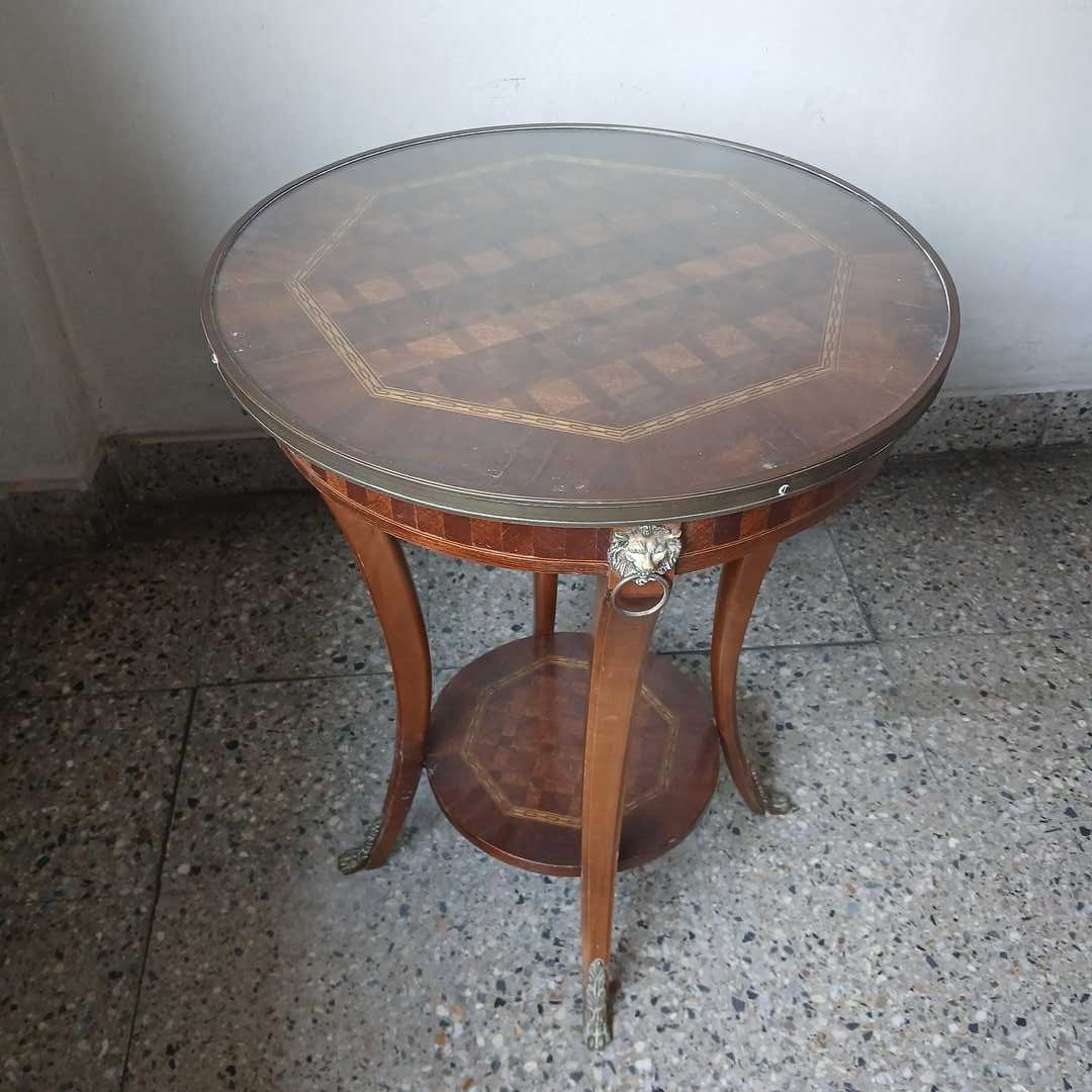 Mesa auxiliar redonda con parqueteríe, doble plano y broncería. Con desgaste de uso. Diám 45 cm. Alt 60 cm. Retiro el miércoles 22/4 de 14 a 15 hs por Belgrano.
