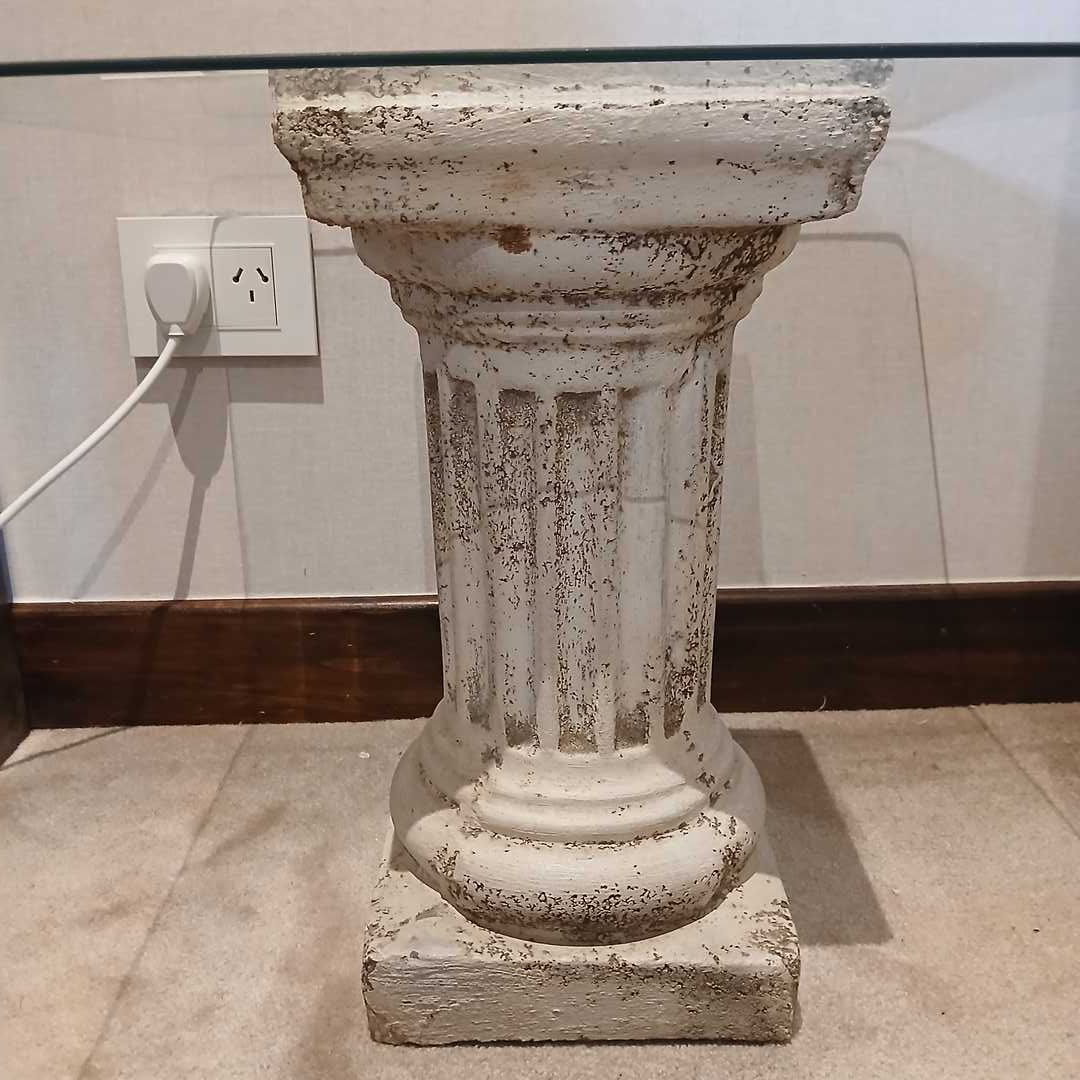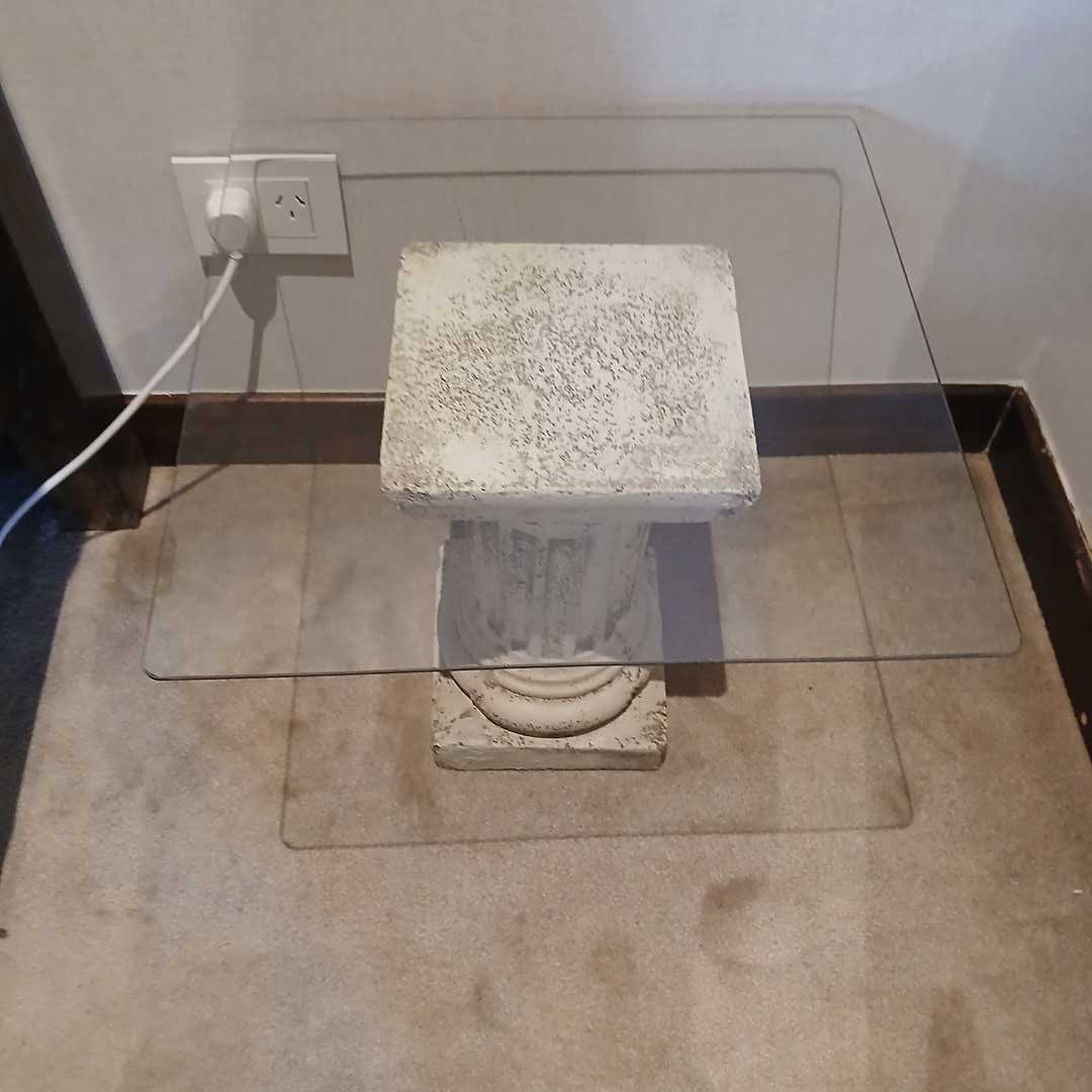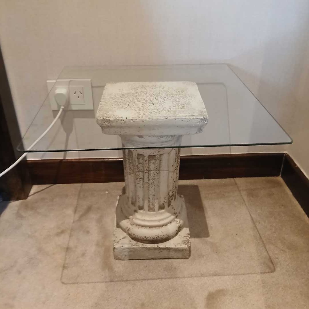 Mesa costado sofá tapa vítrea y base columna en cemento. 45 x 45 cm. Alt 40 cm. Retiro el viernes 20/3 a las 10 hs por San Isidro.