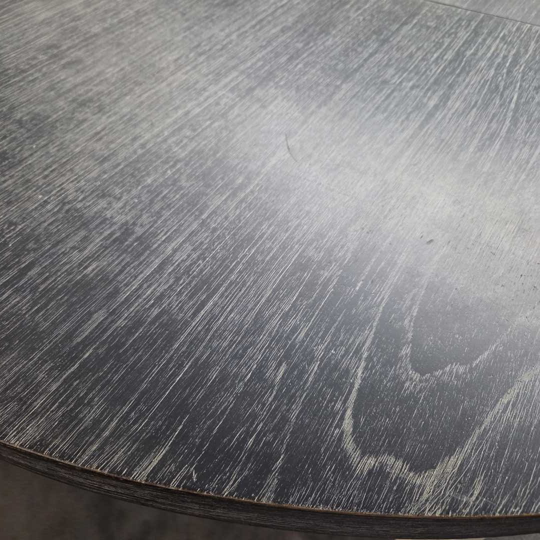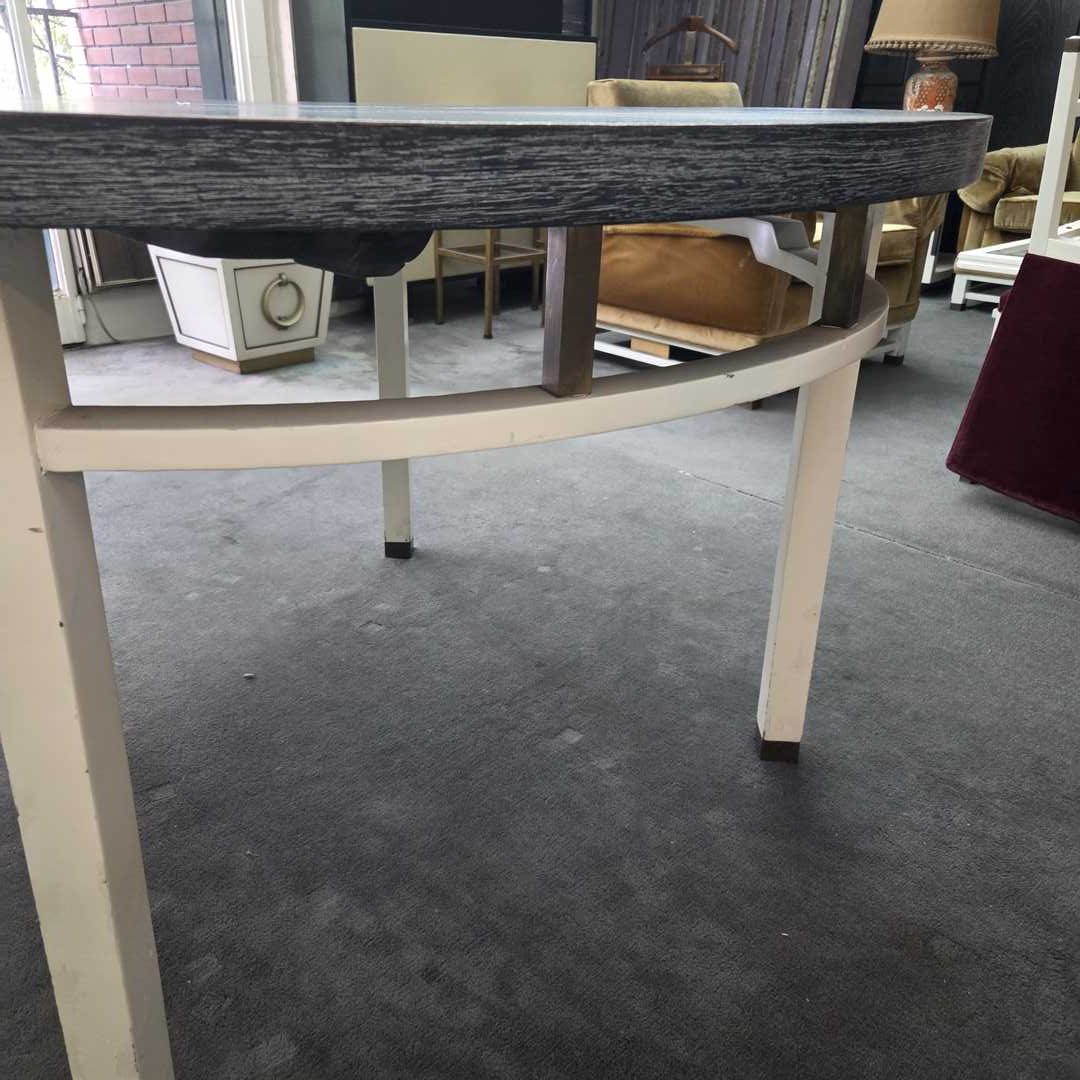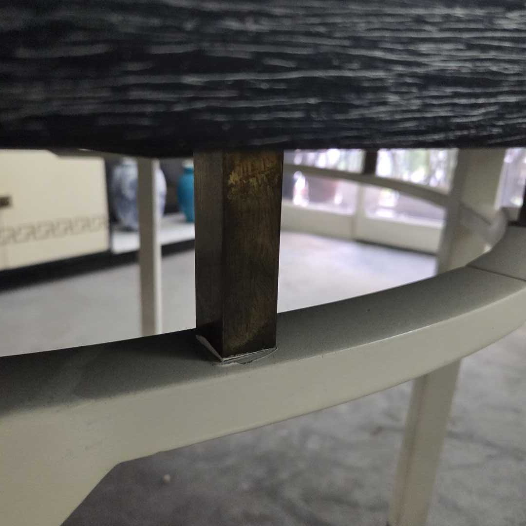 Mesa de comedor circular con tabla de alargue y patas laqueadas con detalles en bronce. Diám 131 cm. Tabla alargue 75 x 133 cm. Total abierta 205 cm aprox. Atención: traer herramientas para desarmarla para su traslado. Baja por escalera 6 pisos.